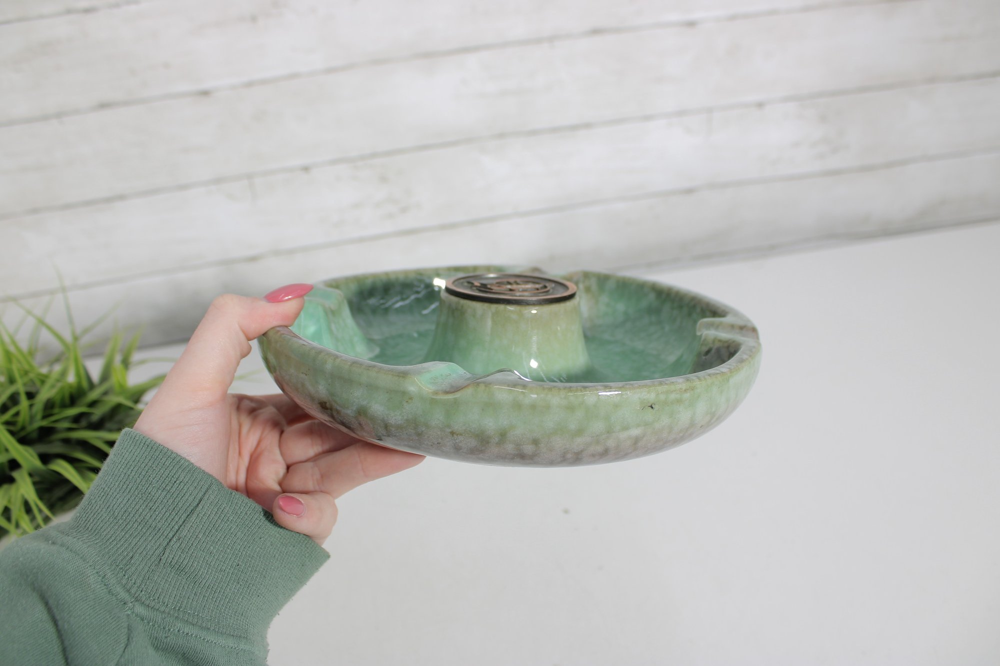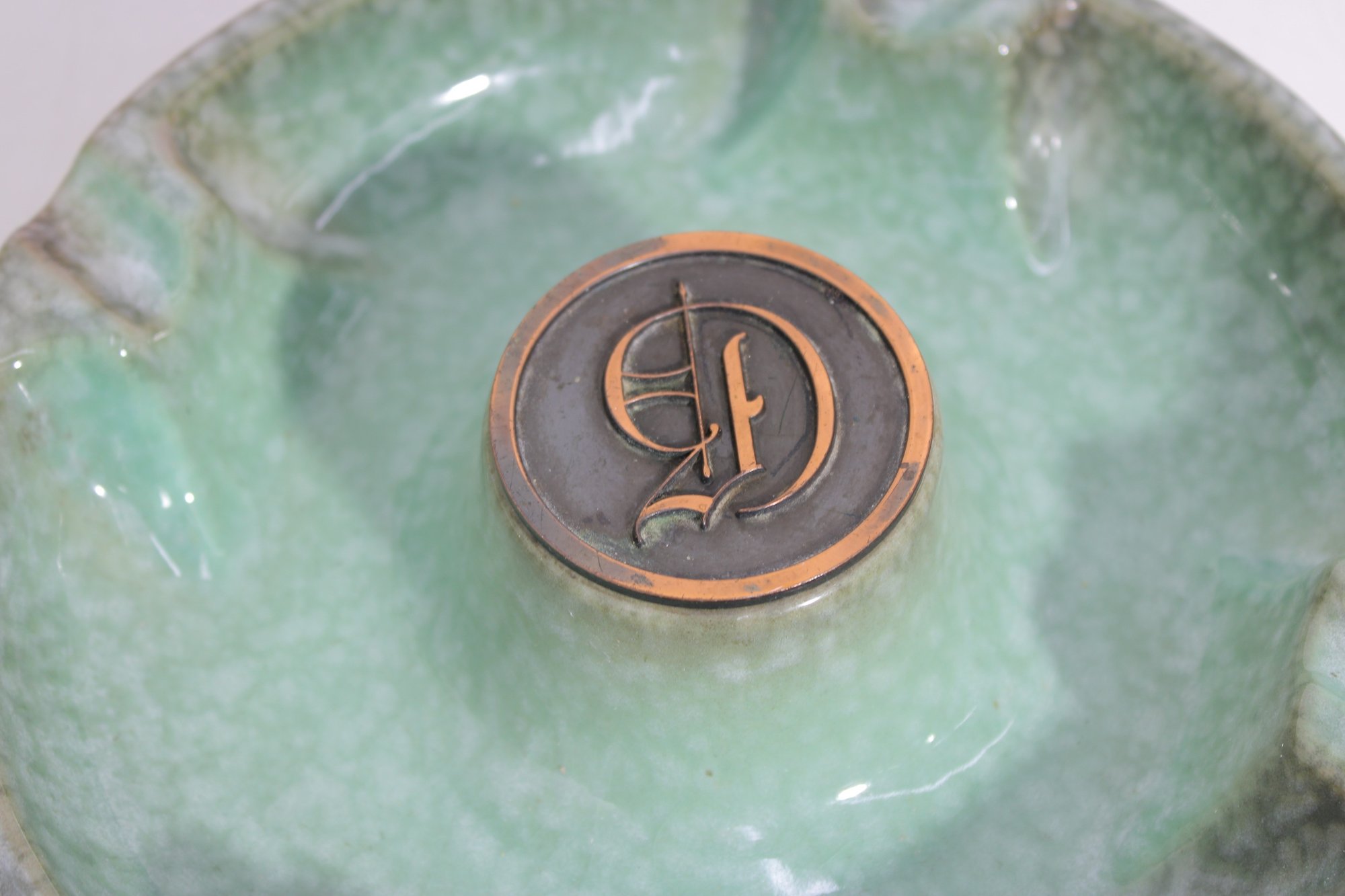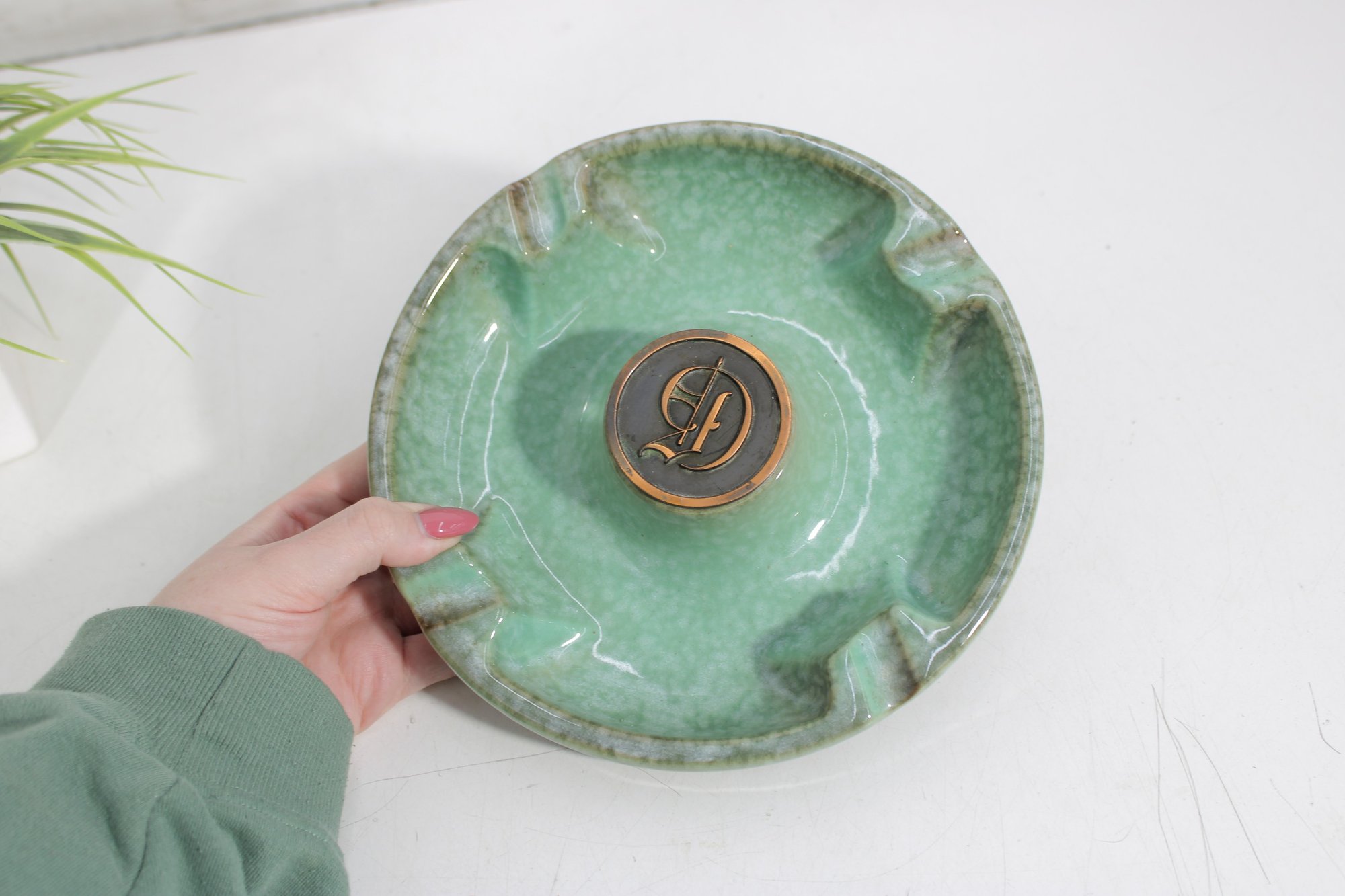 The combination of its heavy construction, elegant glaze, and monogram detail makes it both a functional piece and a collectible accent for vintage décor enthusiasts.