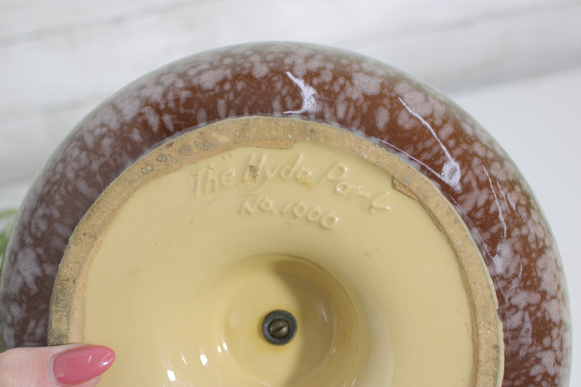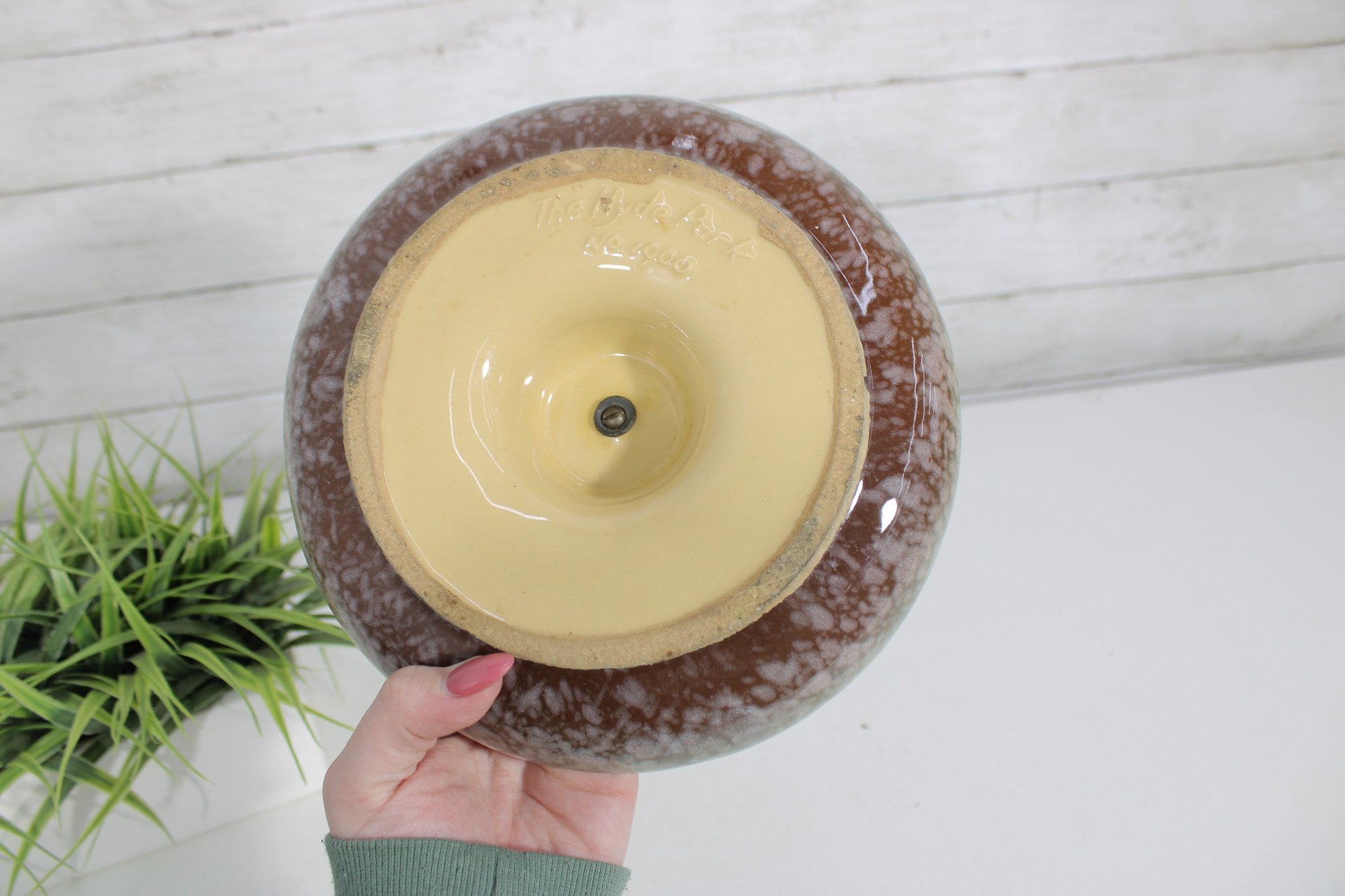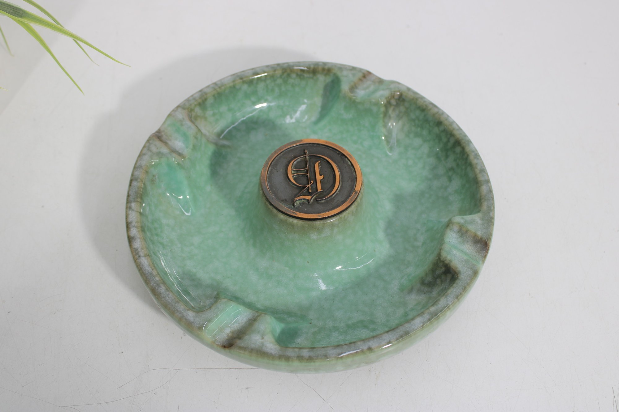 The combination of its heavy construction, elegant glaze, and monogram detail makes it both a functional piece and a collectible accent for vintage décor enthusiasts.