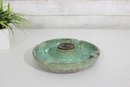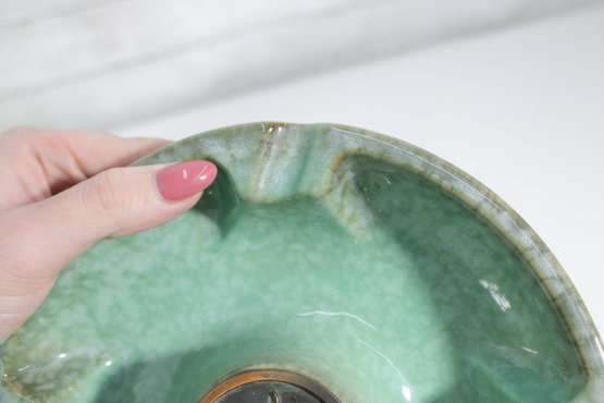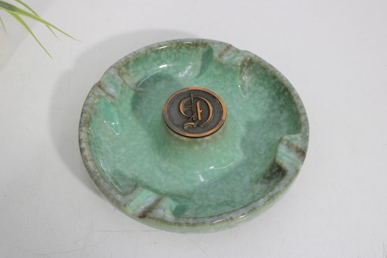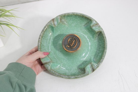 Classic vintage Hyde Park ceramic ashtray, model No. 1900, featuring a rich green glazed finish with subtle marbling. This substantial, weighted piece is designed for stability and durability, with multiple cigarette rests along the rim and a distinctive central medallion bearing the initial “H.”