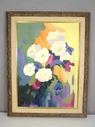 Add a touch of vibrant elegance to your collection with this vintage impressionist floral painting, signed by the artist, This stunning artwork features a bold and colorful bouquet of white flowers, set against a dynamic, abstract background of greens, yellows, purples, and blues.