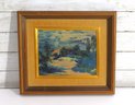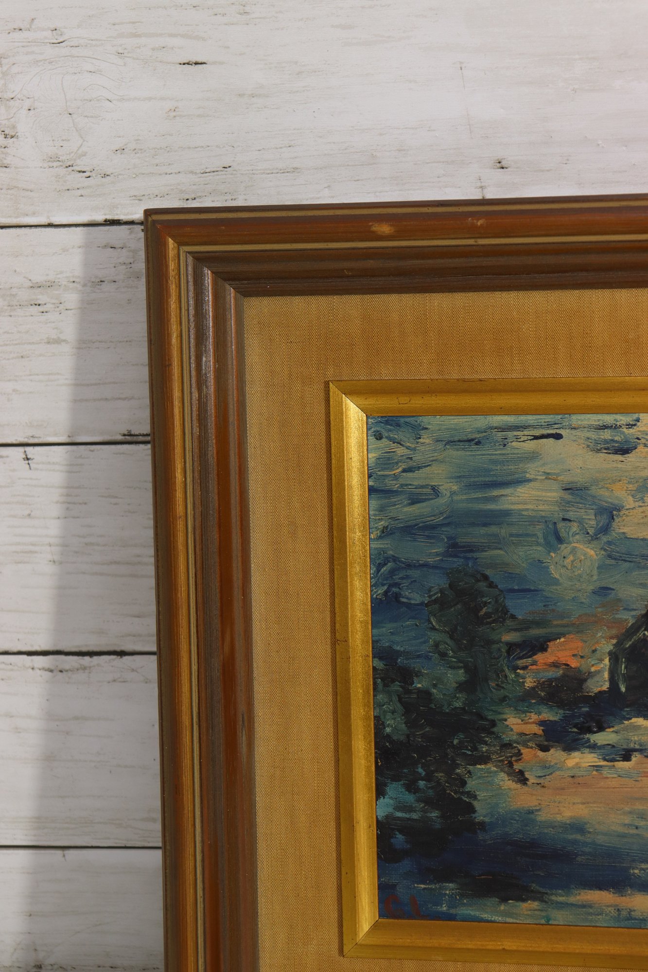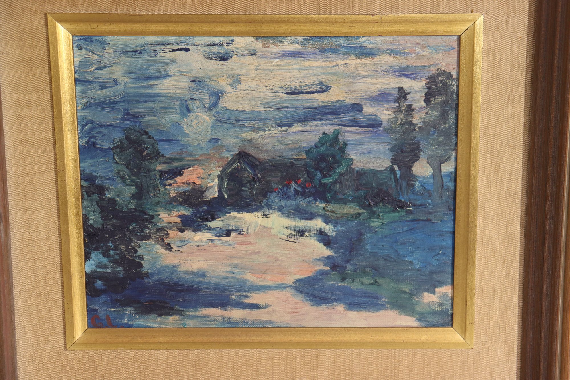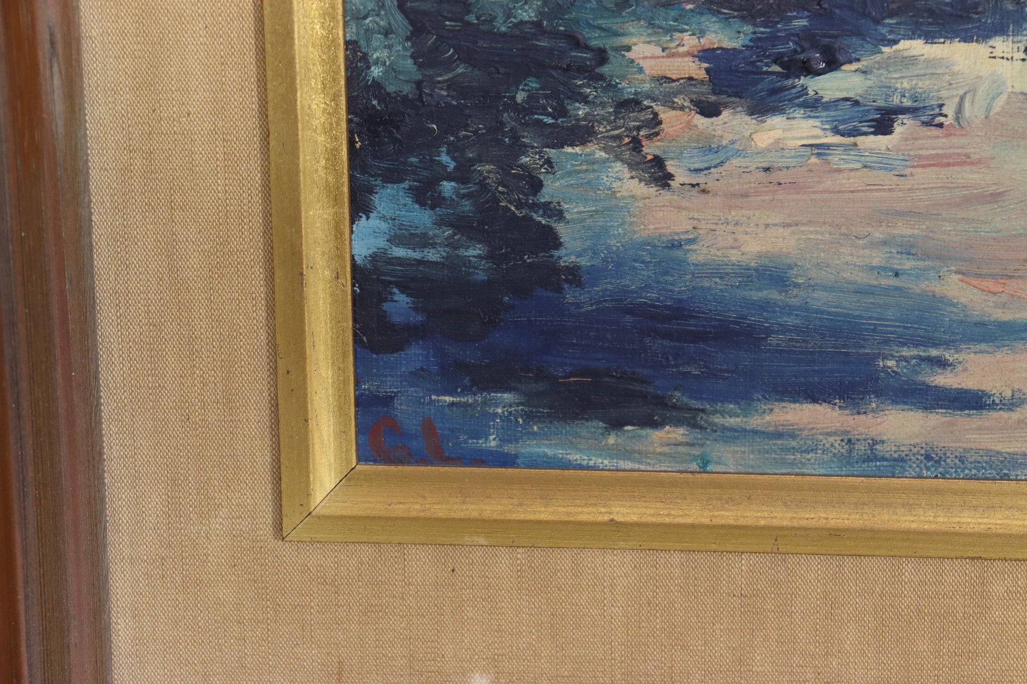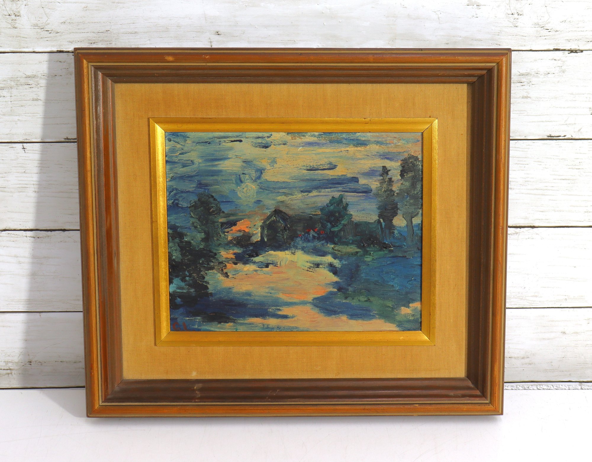 Charming vintage impressionist style oil painting signed G.L. in lower corner. This landscape scene features rich layered brushwork with deep blues, greens, creams and warm tones creating a serene countryside setting with trees, sky and a water or path view into the distance. Beautiful use of texture and color blending in classic impressionist form.