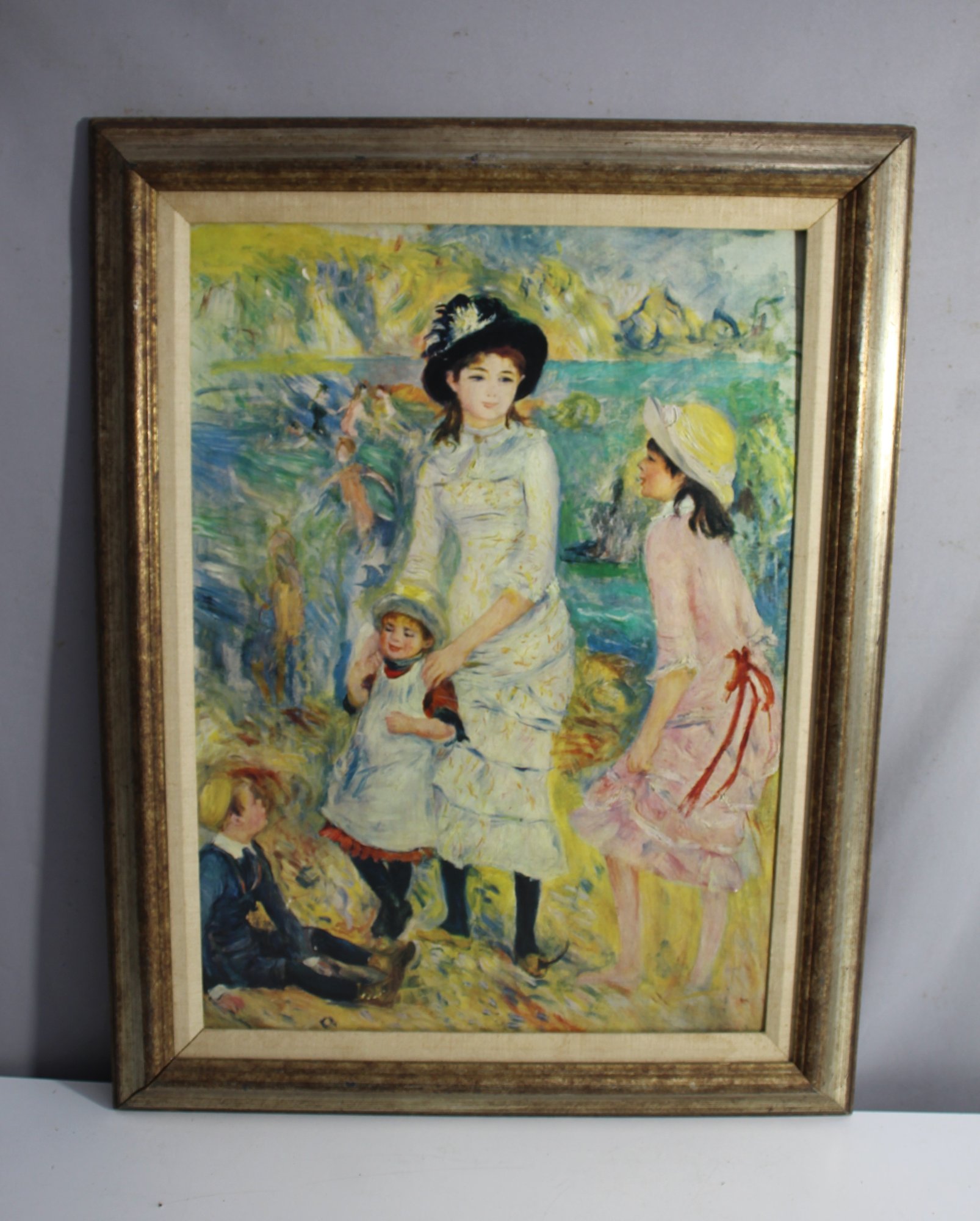 This charming vintage print captures a scene inspired by Impressionist art, depicting elegantly dressed women and children in a pastoral setting. The soft, vibrant colors and brushstroke-like details bring a sense of warmth and nostalgia, reminiscent of the style of classic painters like Renoir. The print conveys a gentle, idyllic moment, making it a delightful addition to any space.