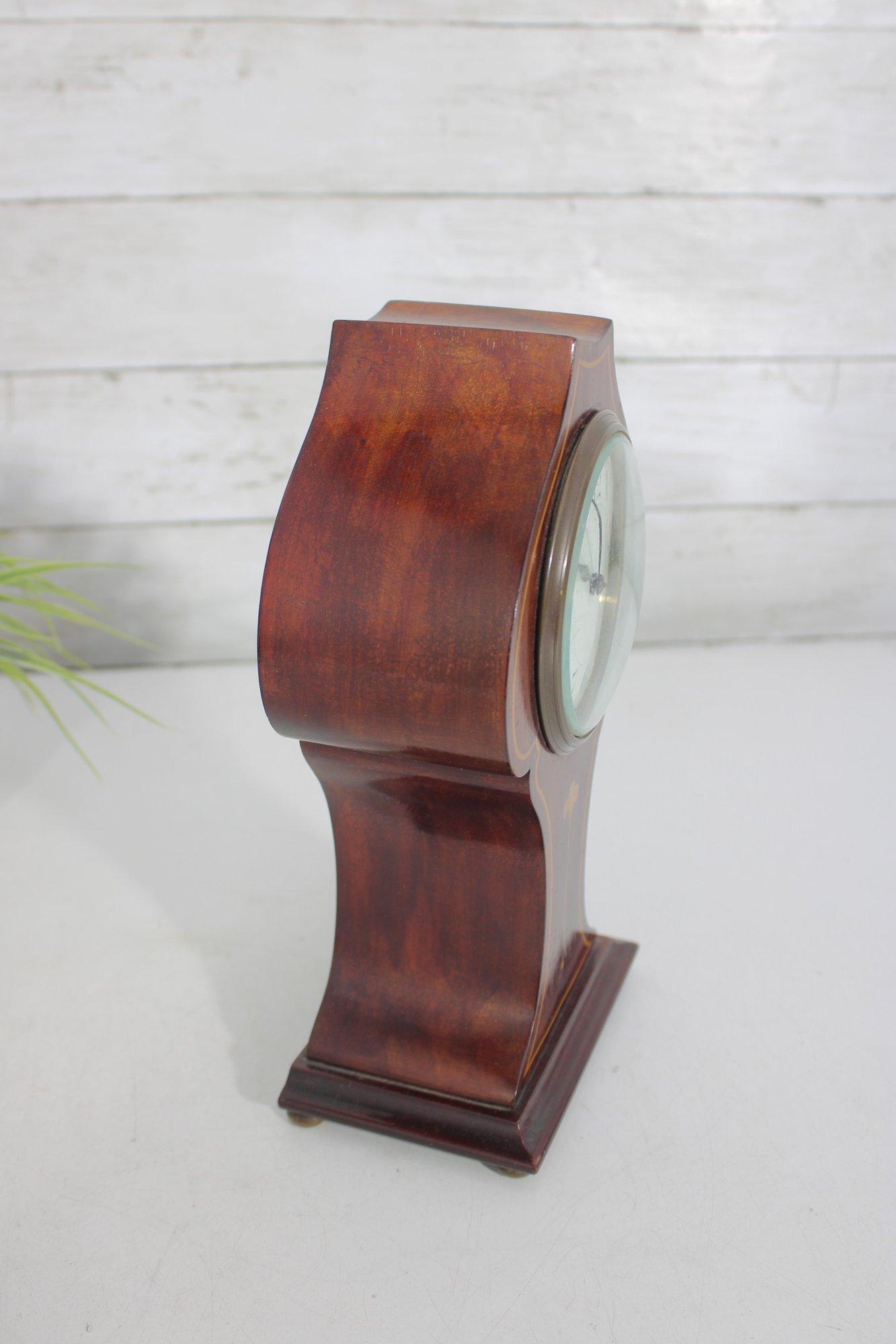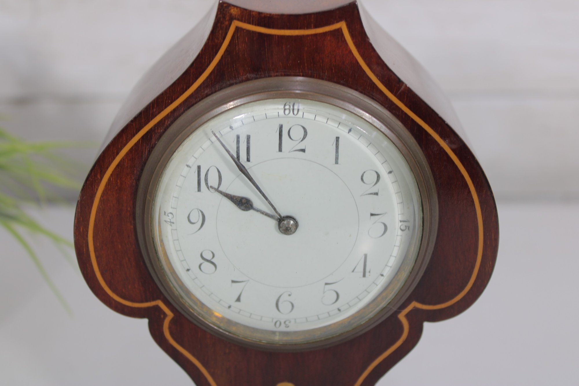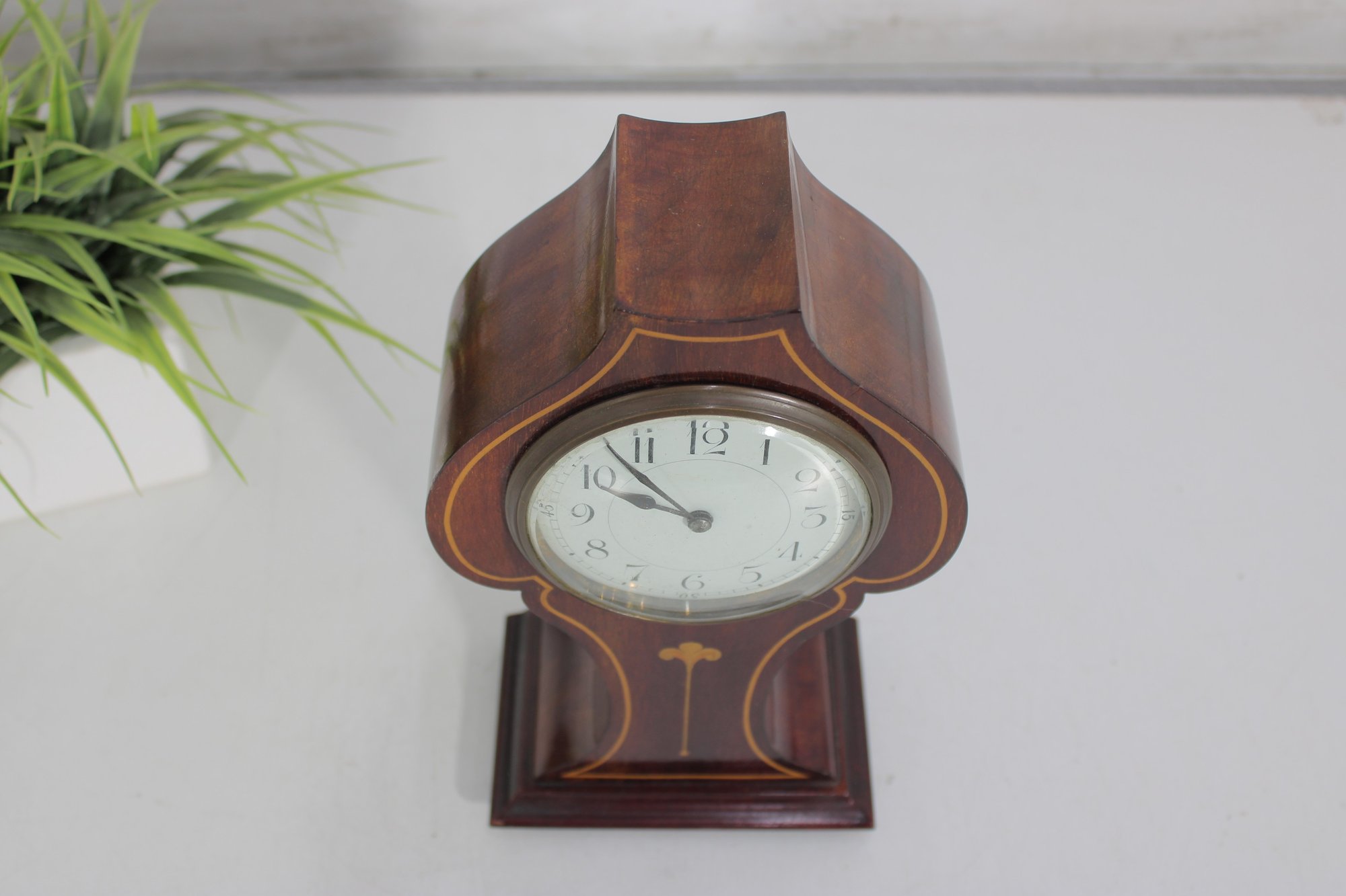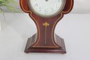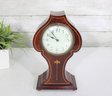 a handsome vintage mantel (table) clock housed in a beautifully shaped wood case with inlaid detailing. The clock features a softly contoured silhouette, warm wood tones, and subtle inlay accents on the front, giving it a refined and timeless presence.