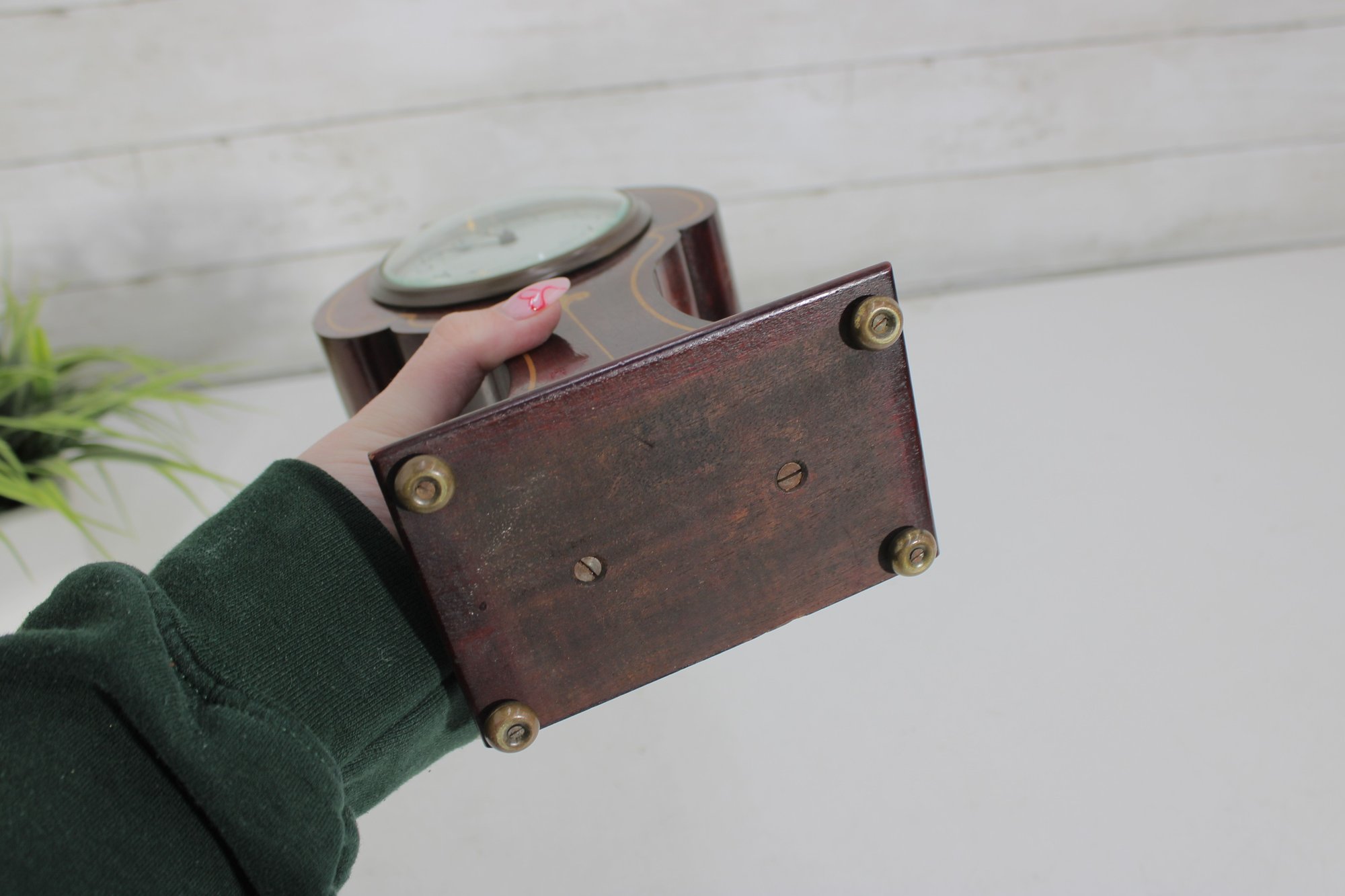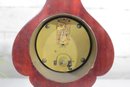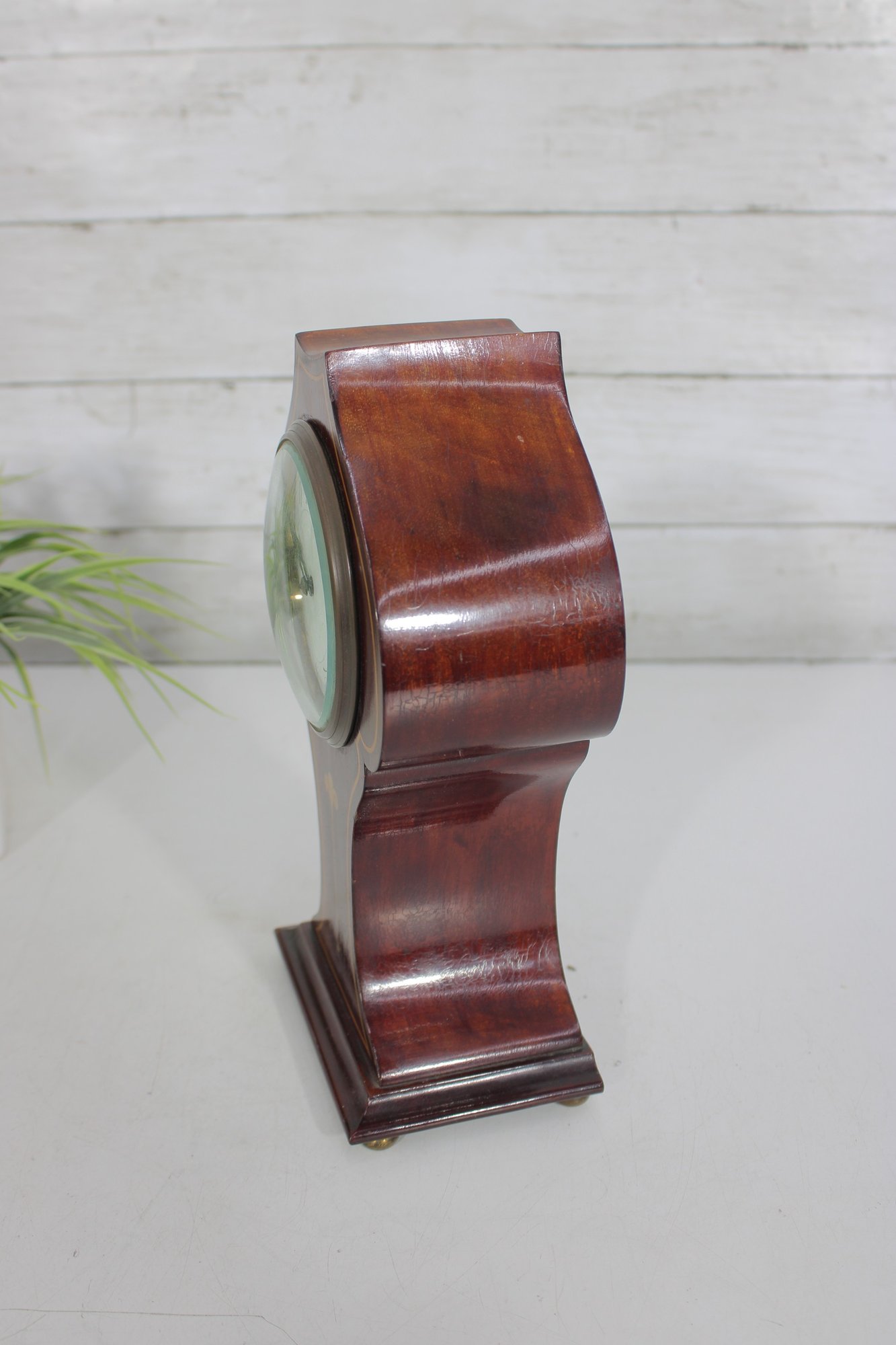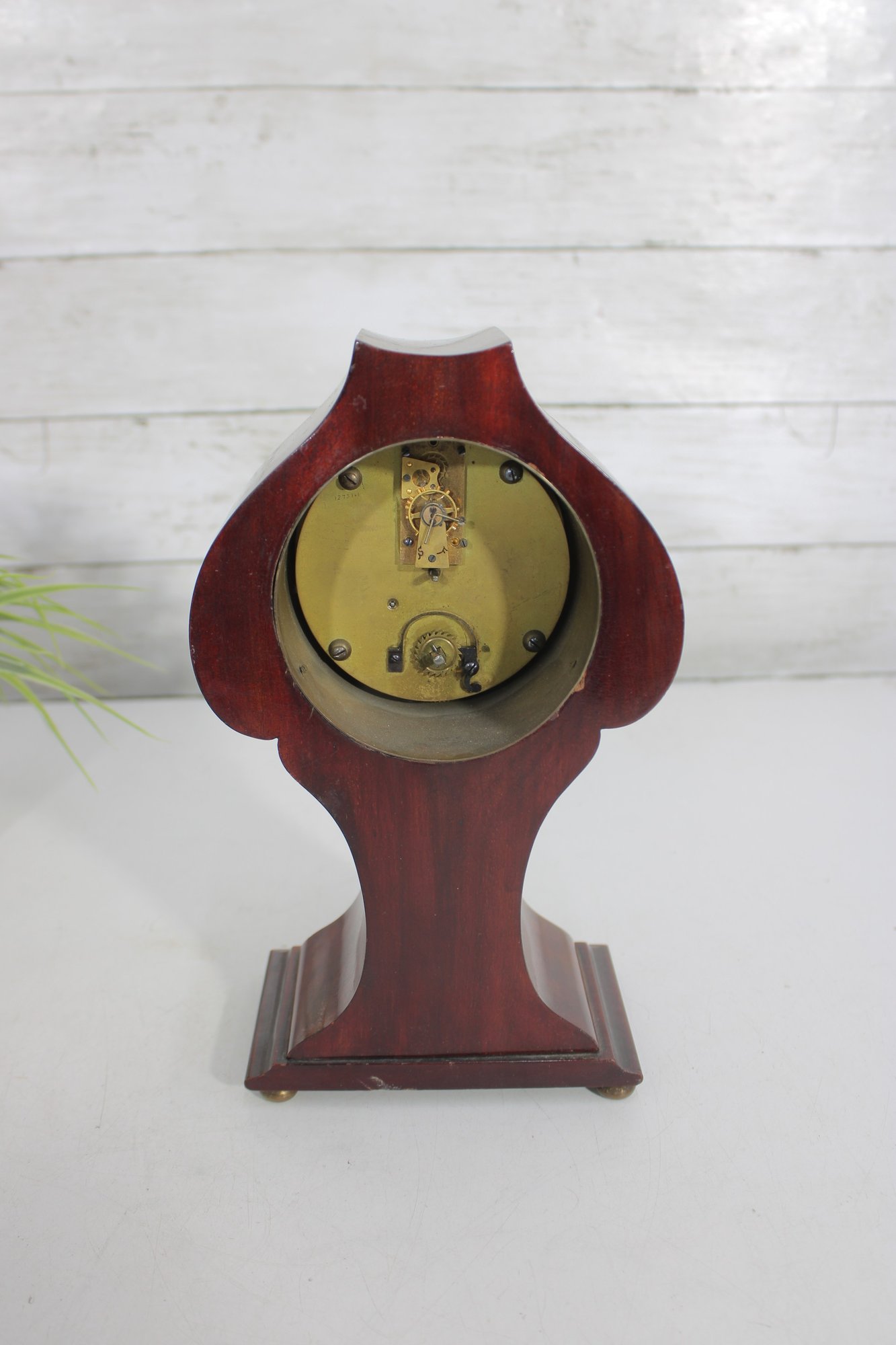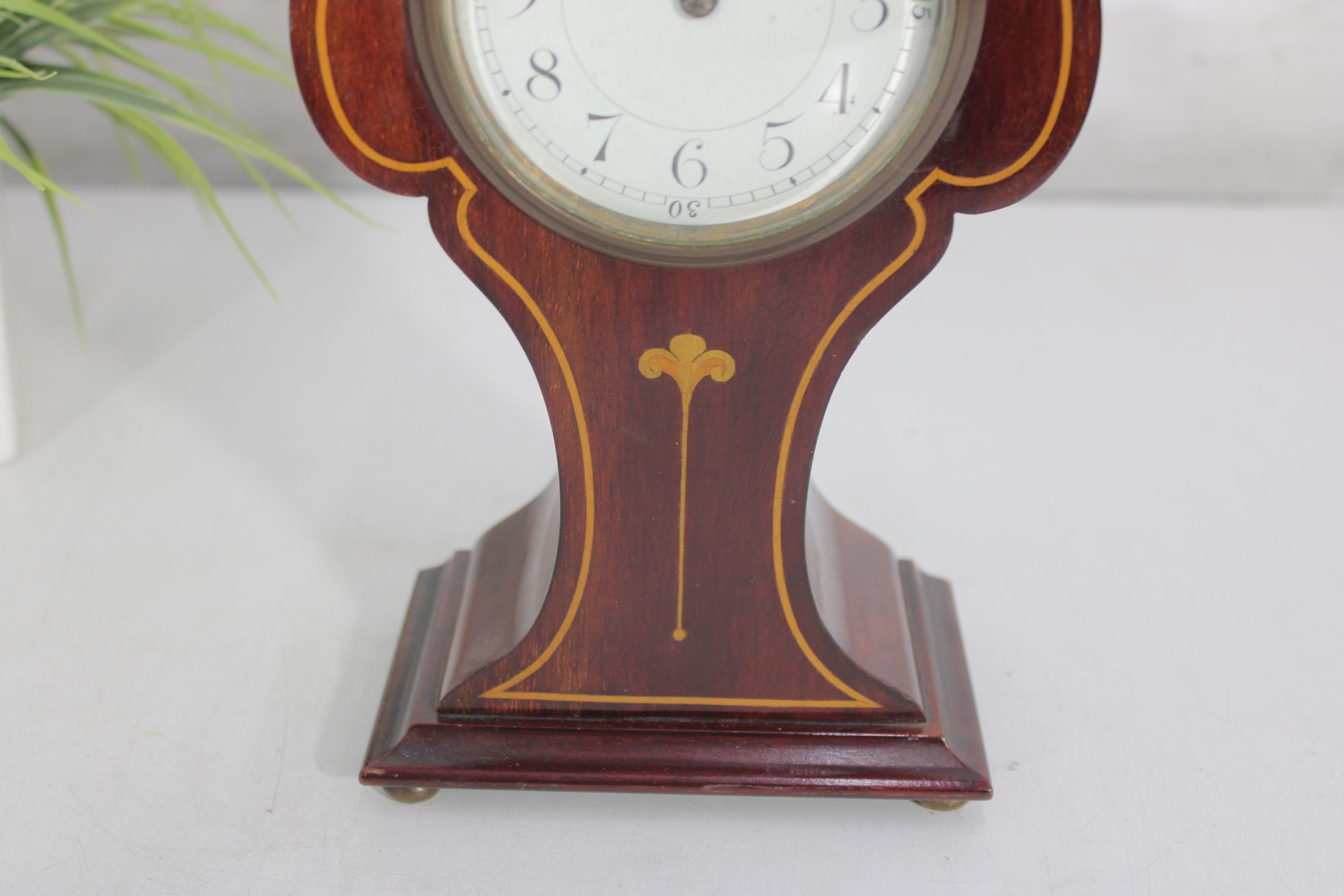 a handsome vintage mantel (table) clock housed in a beautifully shaped wood case with inlaid detailing. The clock features a softly contoured silhouette, warm wood tones, and subtle inlay accents on the front, giving it a refined and timeless presence.