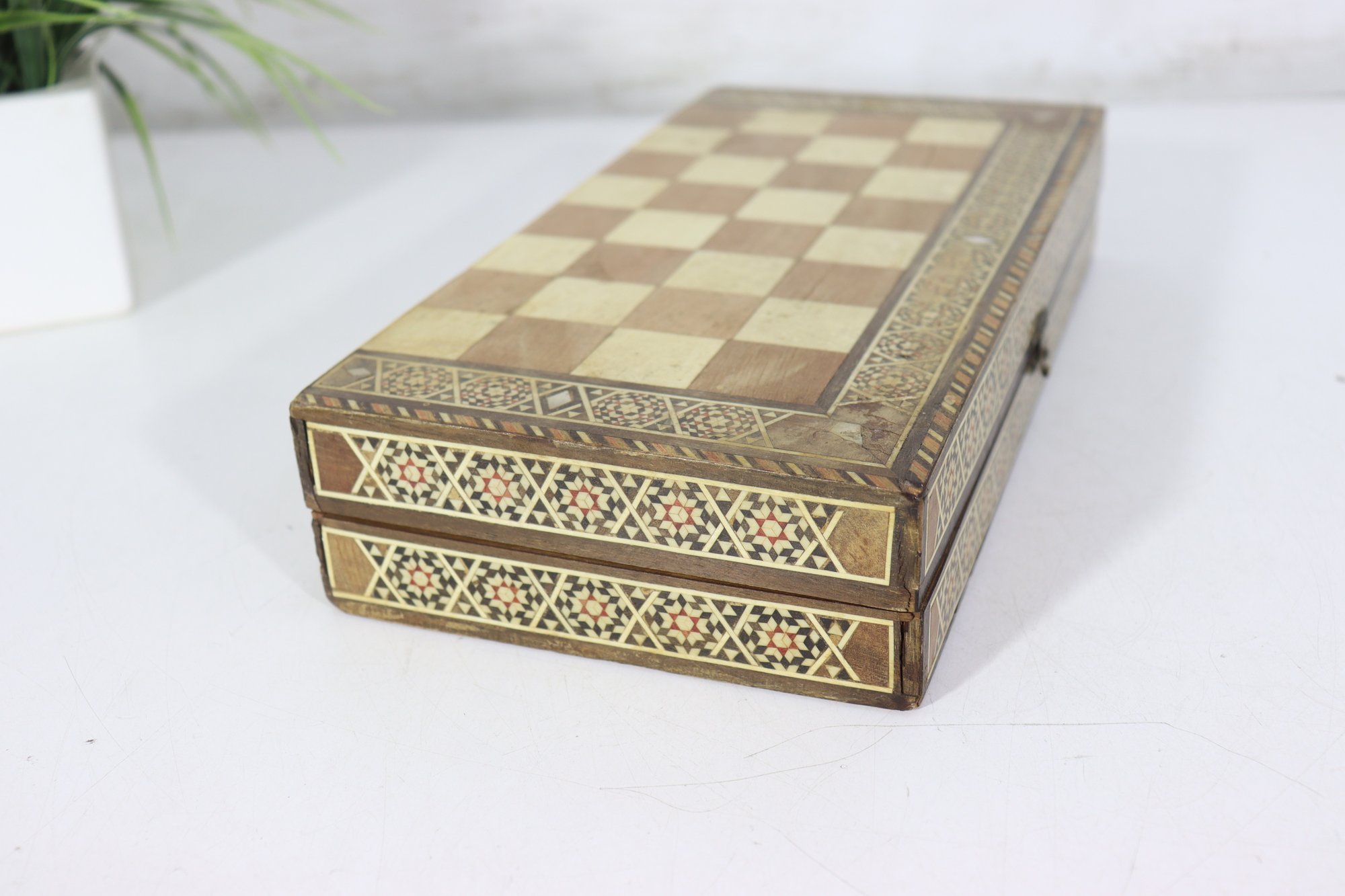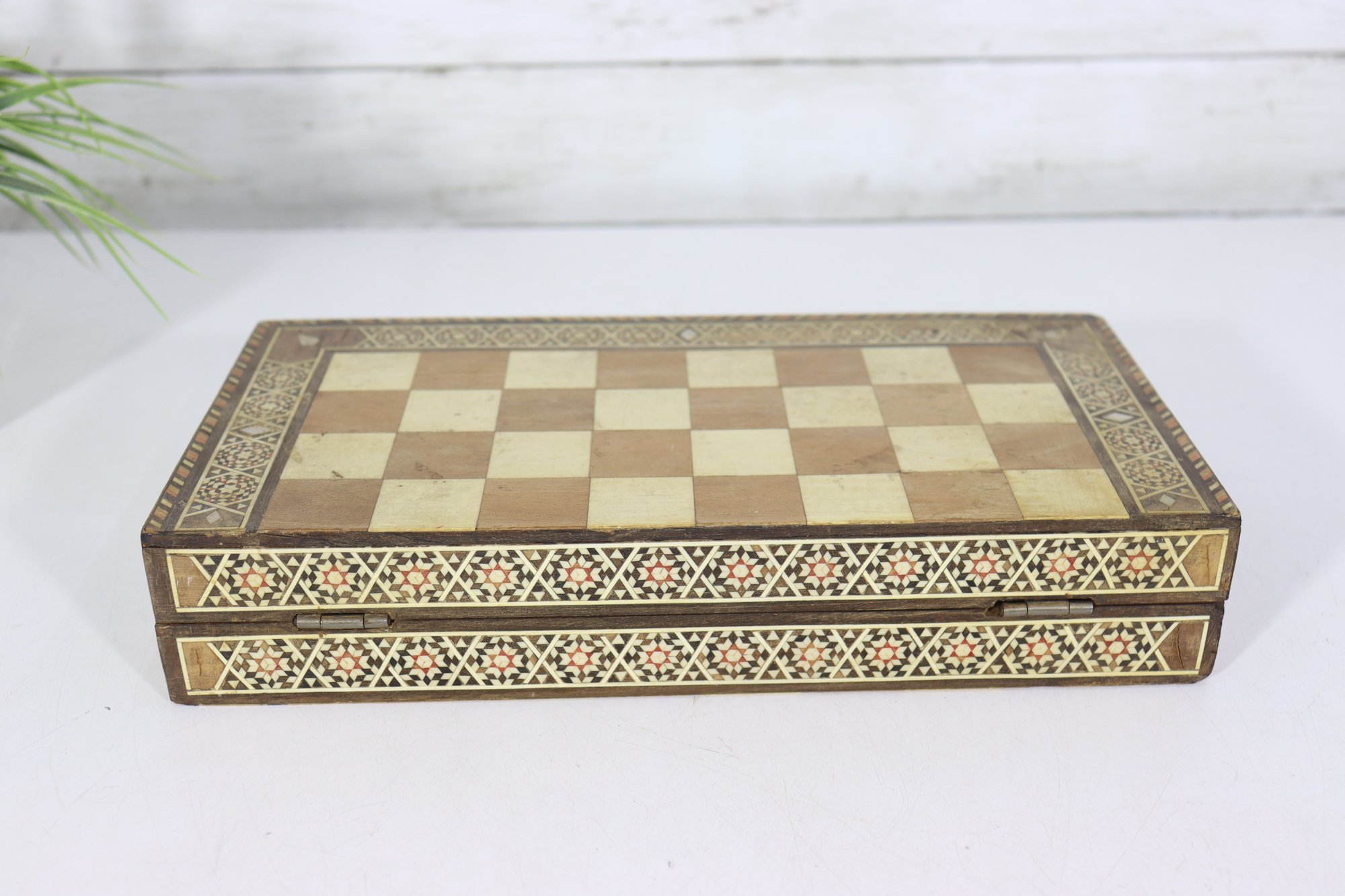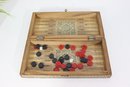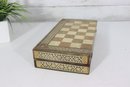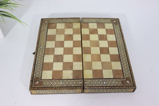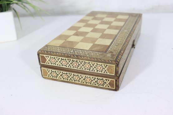 Beautiful vintage wooden backgammon and checker game set, featuring detailed geometric inlay work throughout the exterior and interior. The folding case opens to reveal a classic backgammon board, while the exterior functions as a checkerboard, offering two traditional games in one elegant piece.