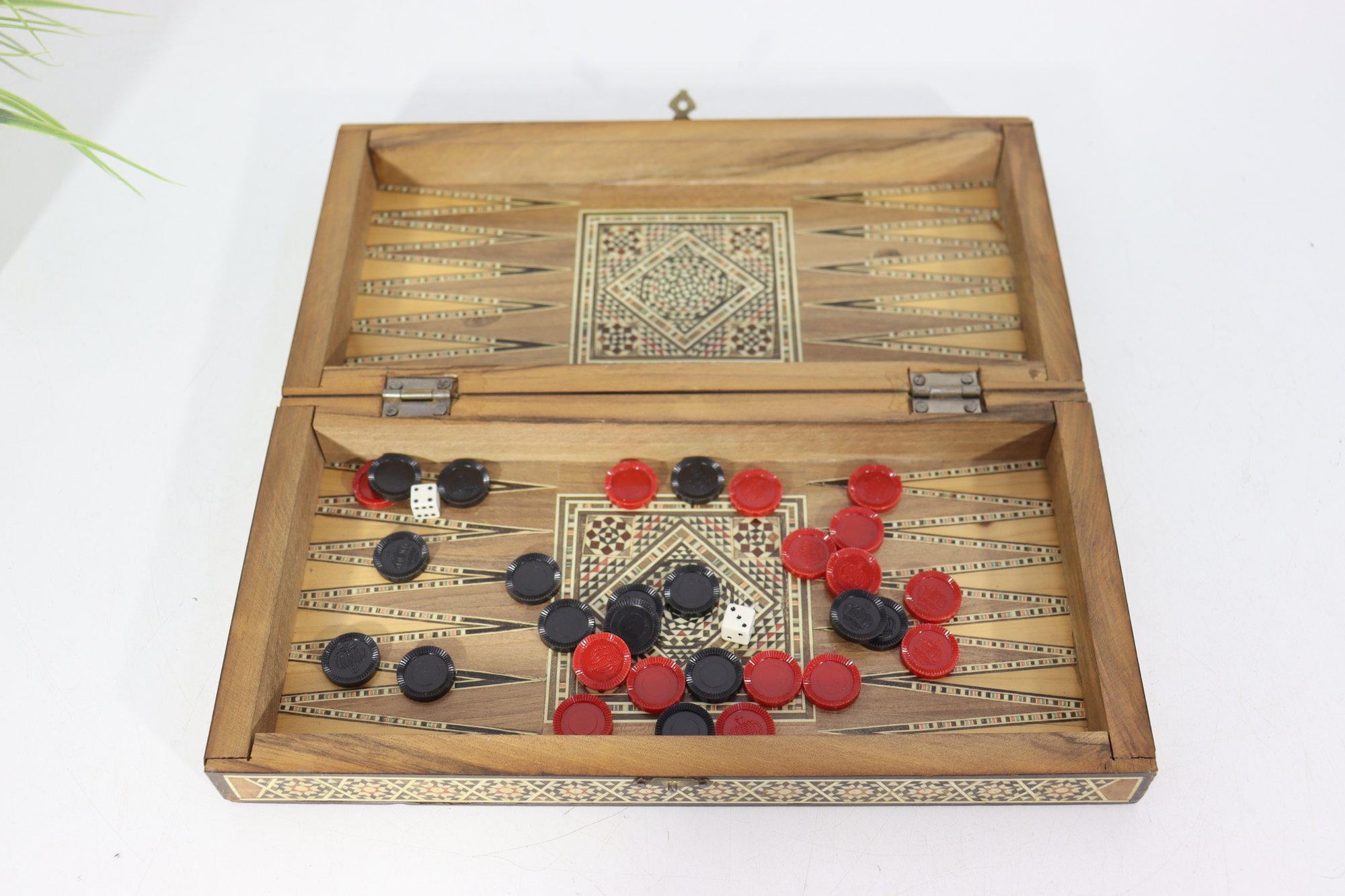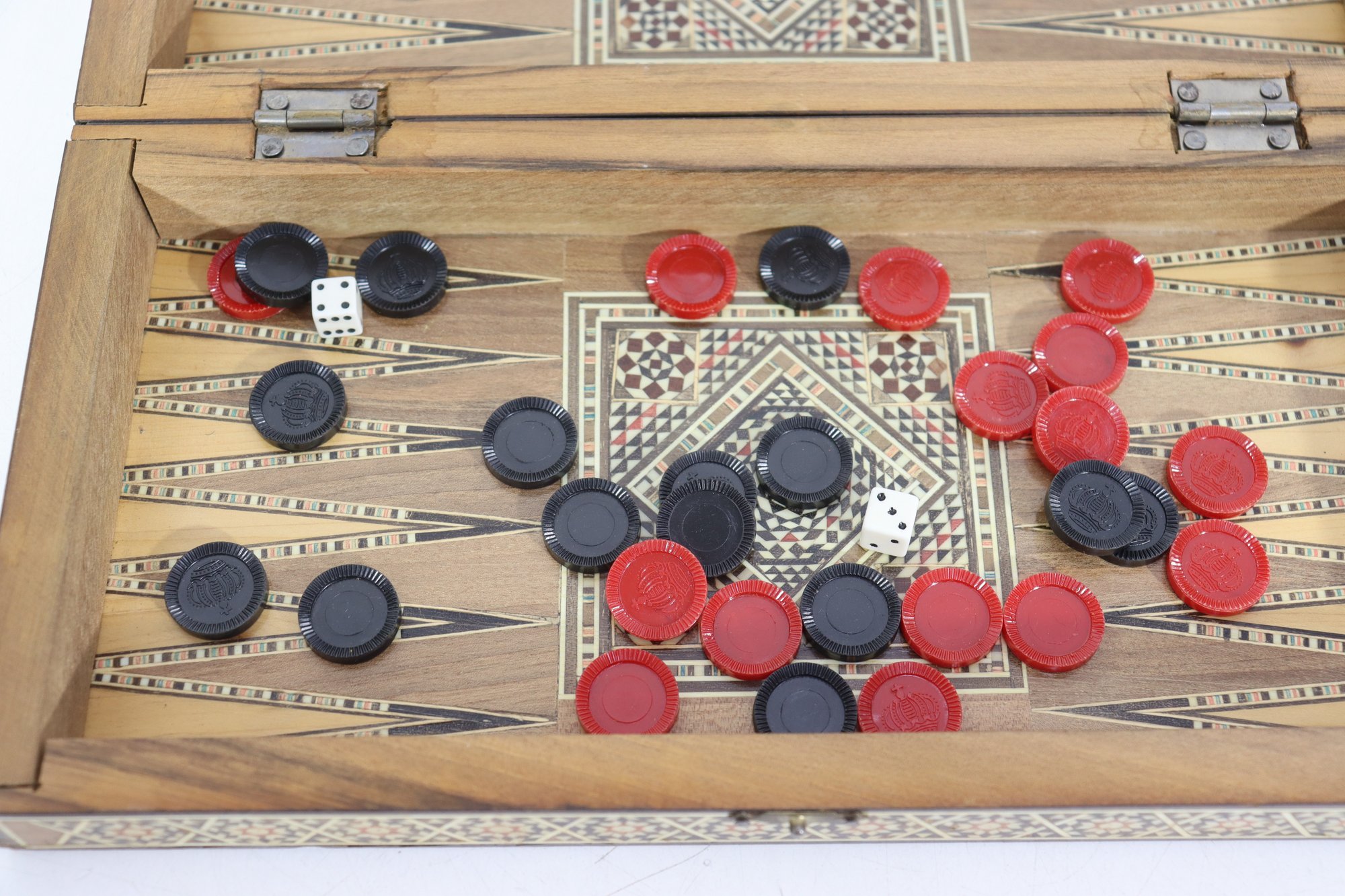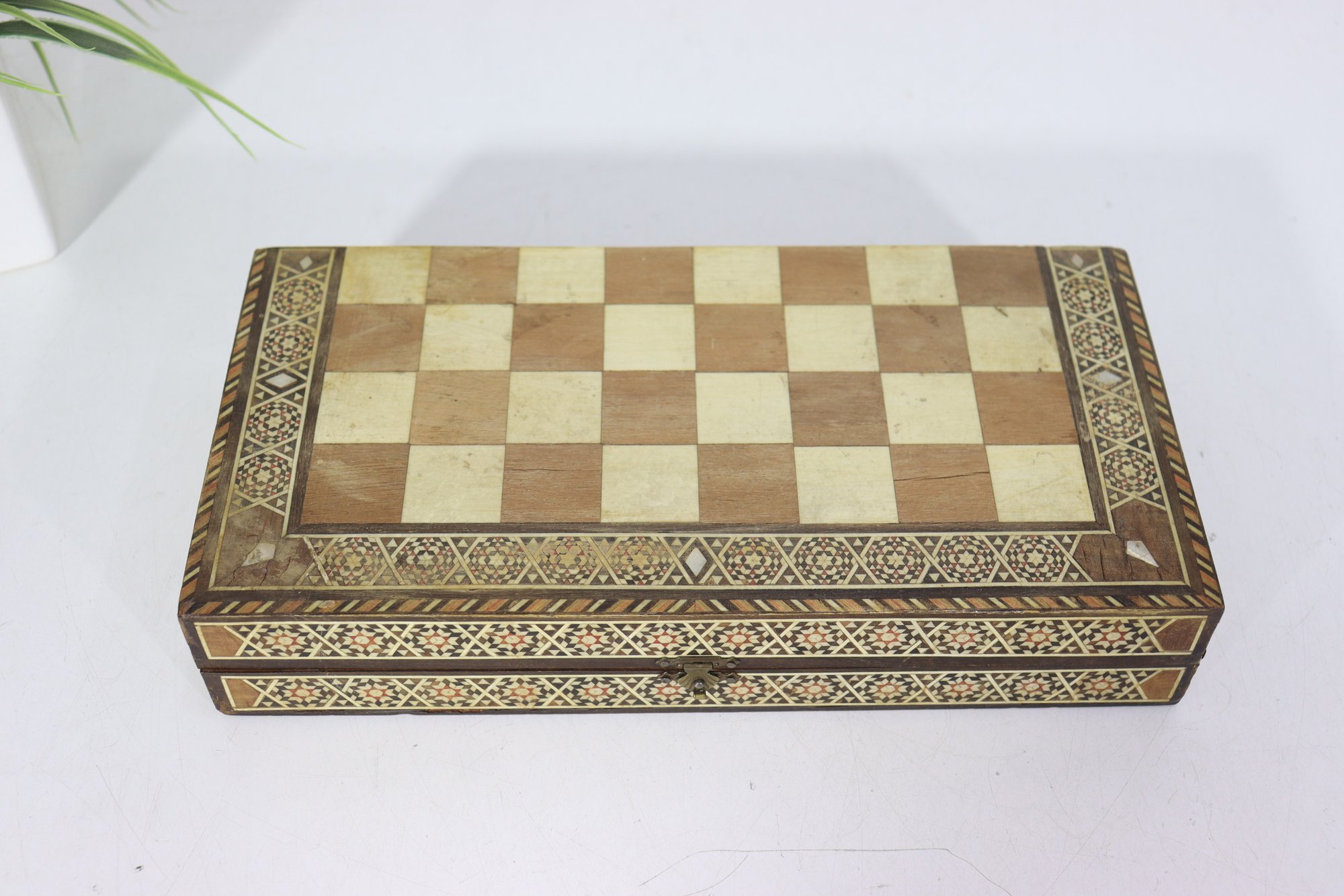 Beautiful vintage wooden backgammon and checker game set, featuring detailed geometric inlay work throughout the exterior and interior. The folding case opens to reveal a classic backgammon board, while the exterior functions as a checkerboard, offering two traditional games in one elegant piece.