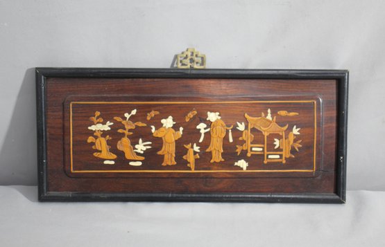 featuring figures in traditional attire engaged in what appears to be a serene garden scene, possibly depicting a narrative from folklore. The inlaid materials give a contrasting color that stands out against the dark wooden background, highlighting the artistry of the piece.