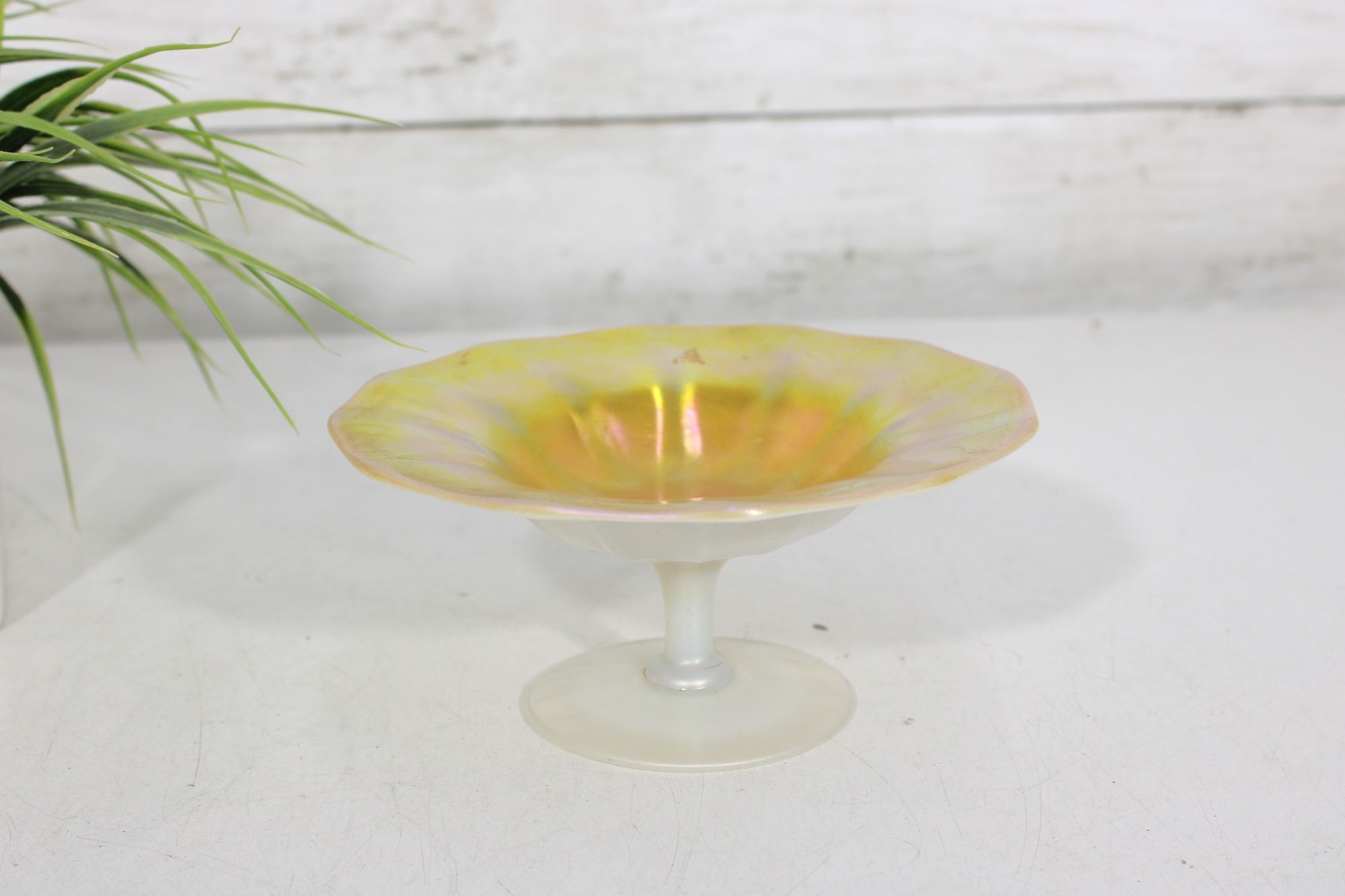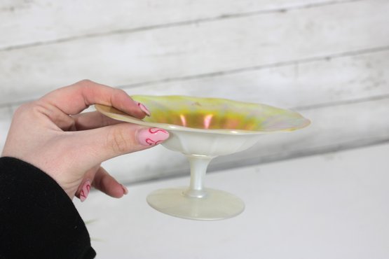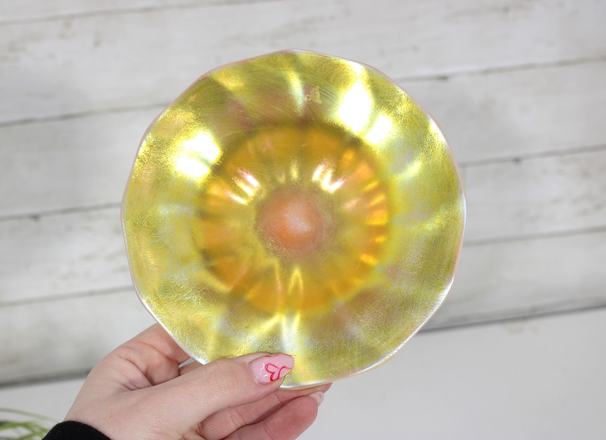 vintage iridescent art glass compote featuring a ruffled edge bowl atop a pedestal base. The glass displays a beautiful golden carnival-style iridescence, with shifting tones of yellow, amber, and soft opalescent highlights depending on the light.