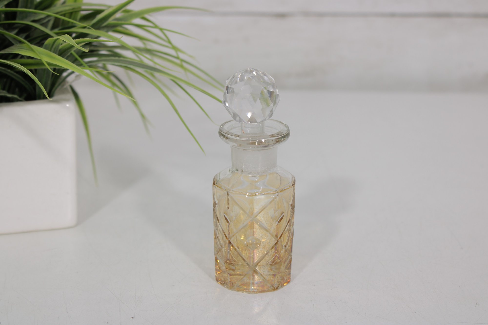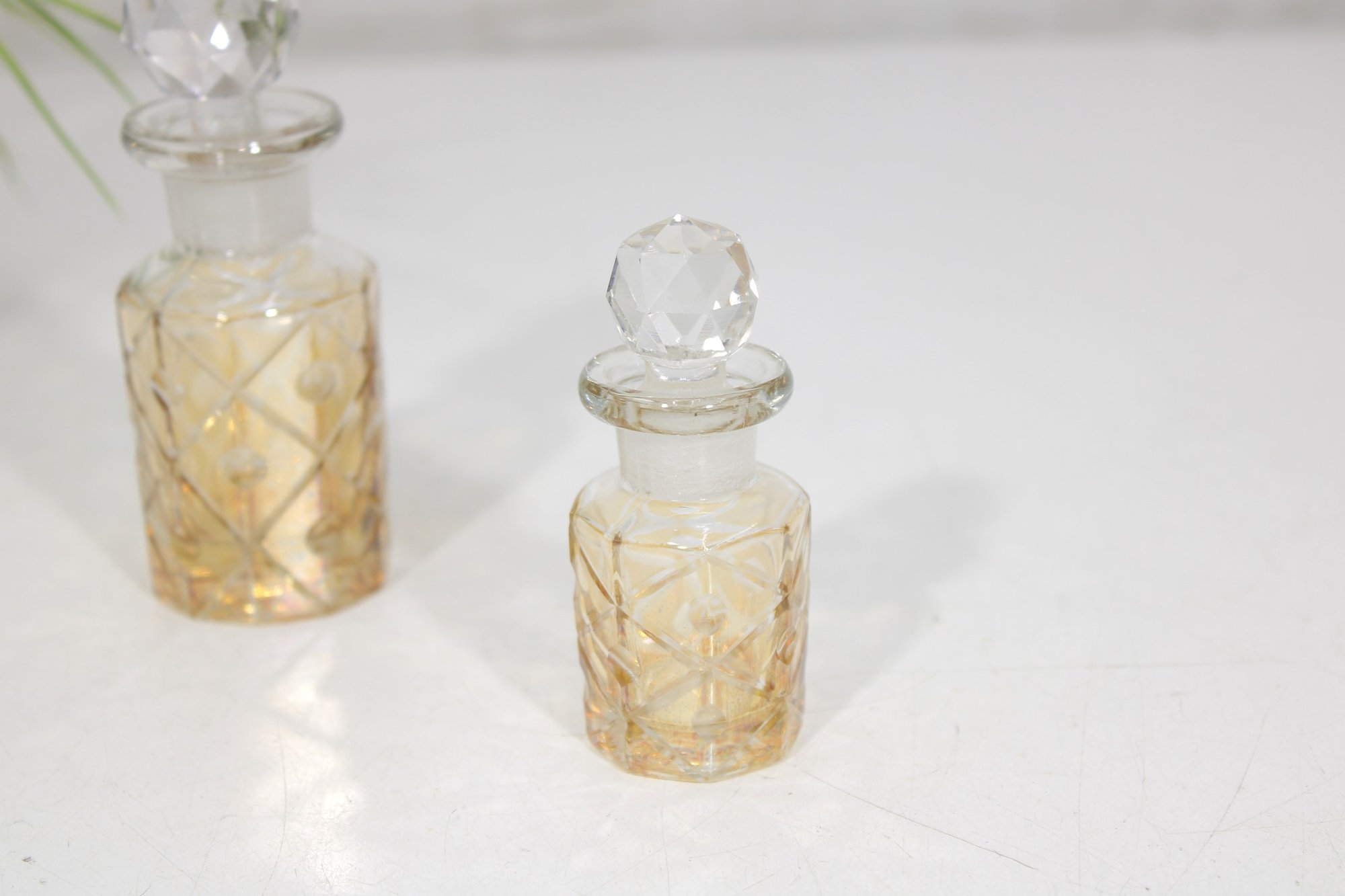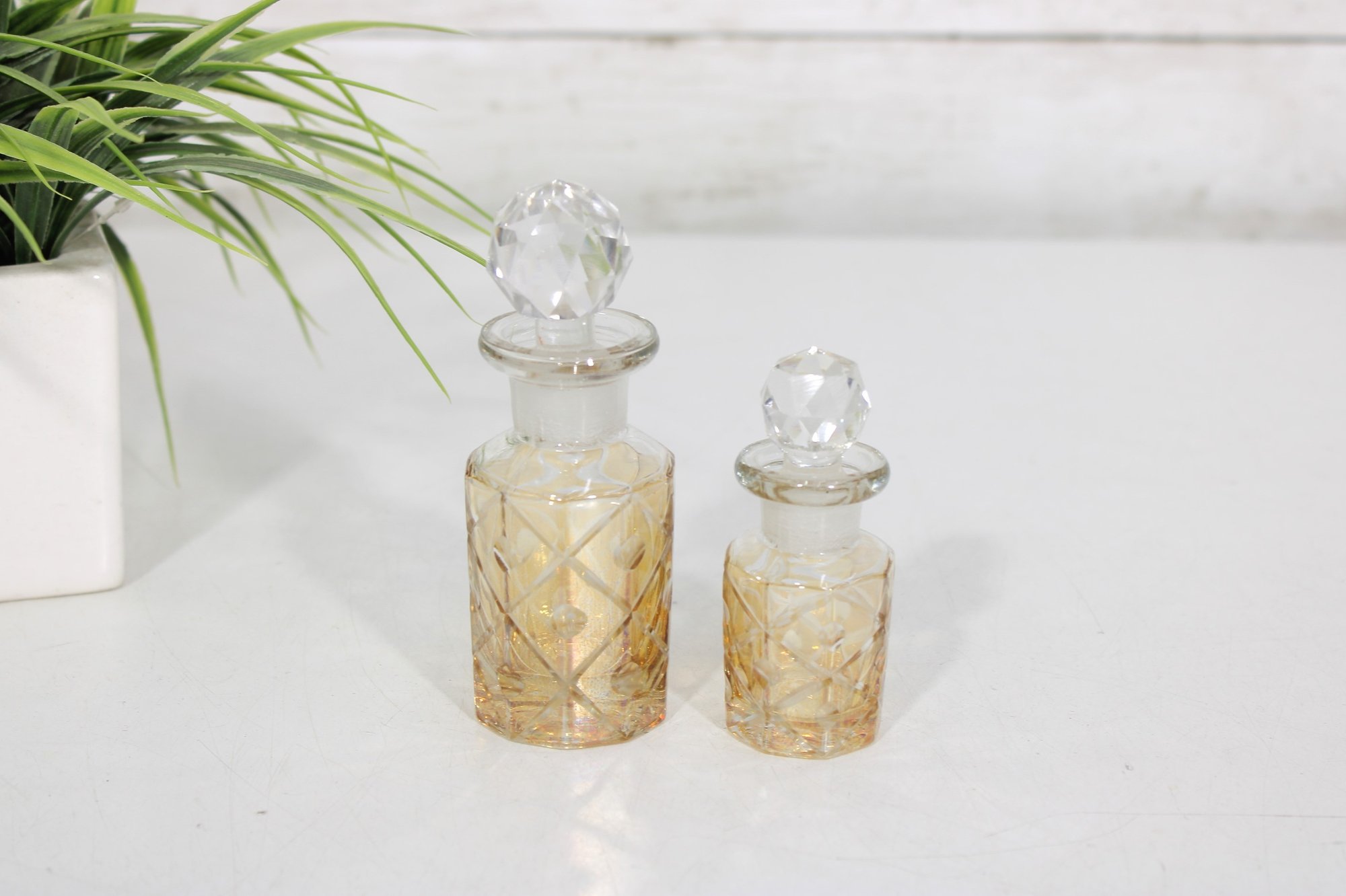 These charming bottles feature a diamond-cut pattern that catches the light beautifully, enhanced by a warm amber/orange iridescent finish. The classic rectangular form combined with the crystal-style faceted stoppers gives them an elegant, timeless look.