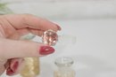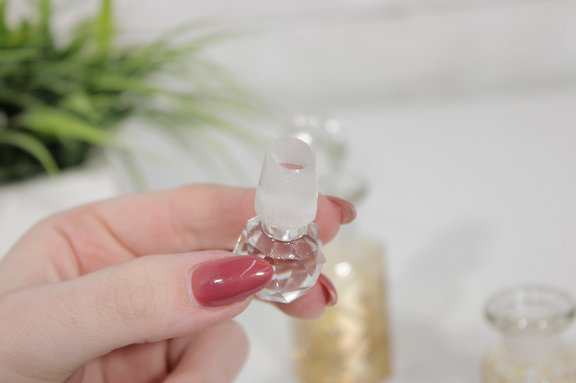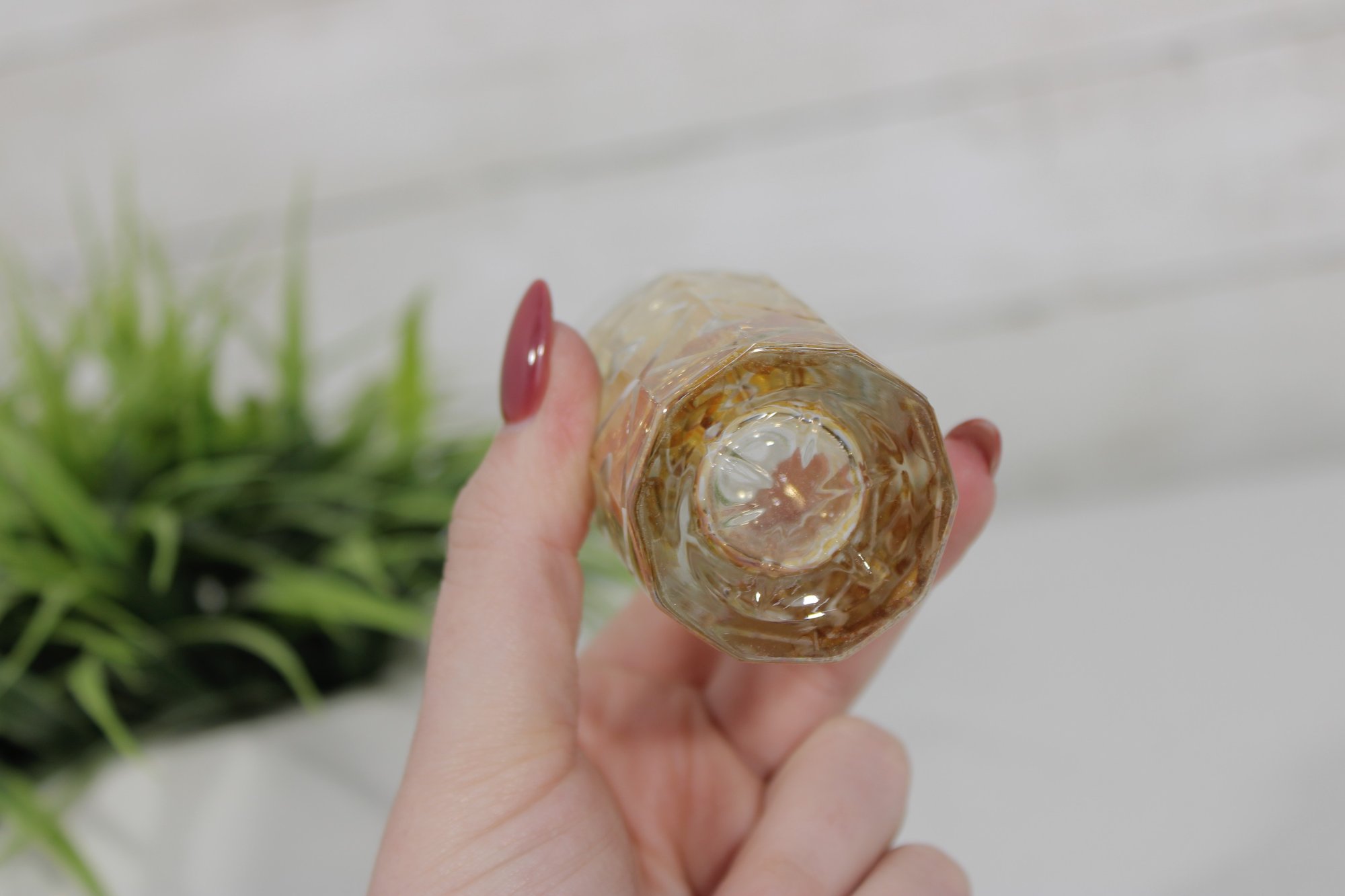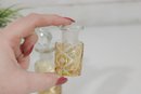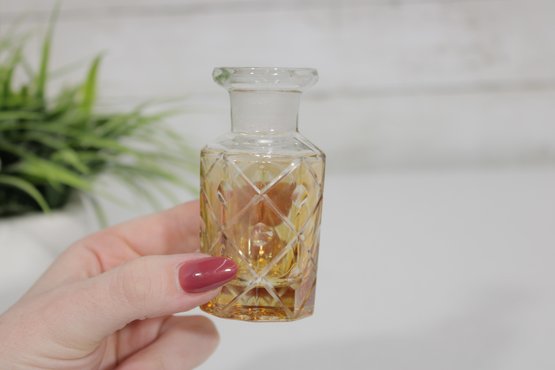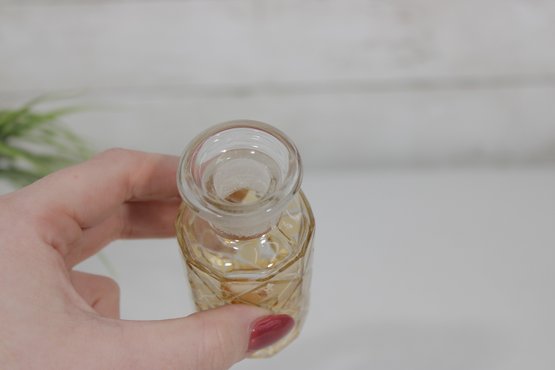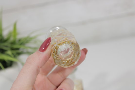 These charming bottles feature a diamond-cut pattern that catches the light beautifully, enhanced by a warm amber/orange iridescent finish. The classic rectangular form combined with the crystal-style faceted stoppers gives them an elegant, timeless look.
