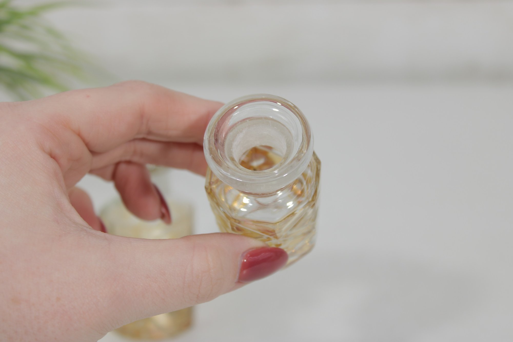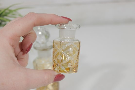 Pre-owned vintage condition. Light wear consistent with age and handling. No major cracks observed. Some minor residue may be present inside from previous contents. Stoppers fit securely. Please review all photos carefully as they are part of the description.