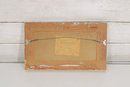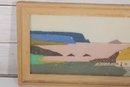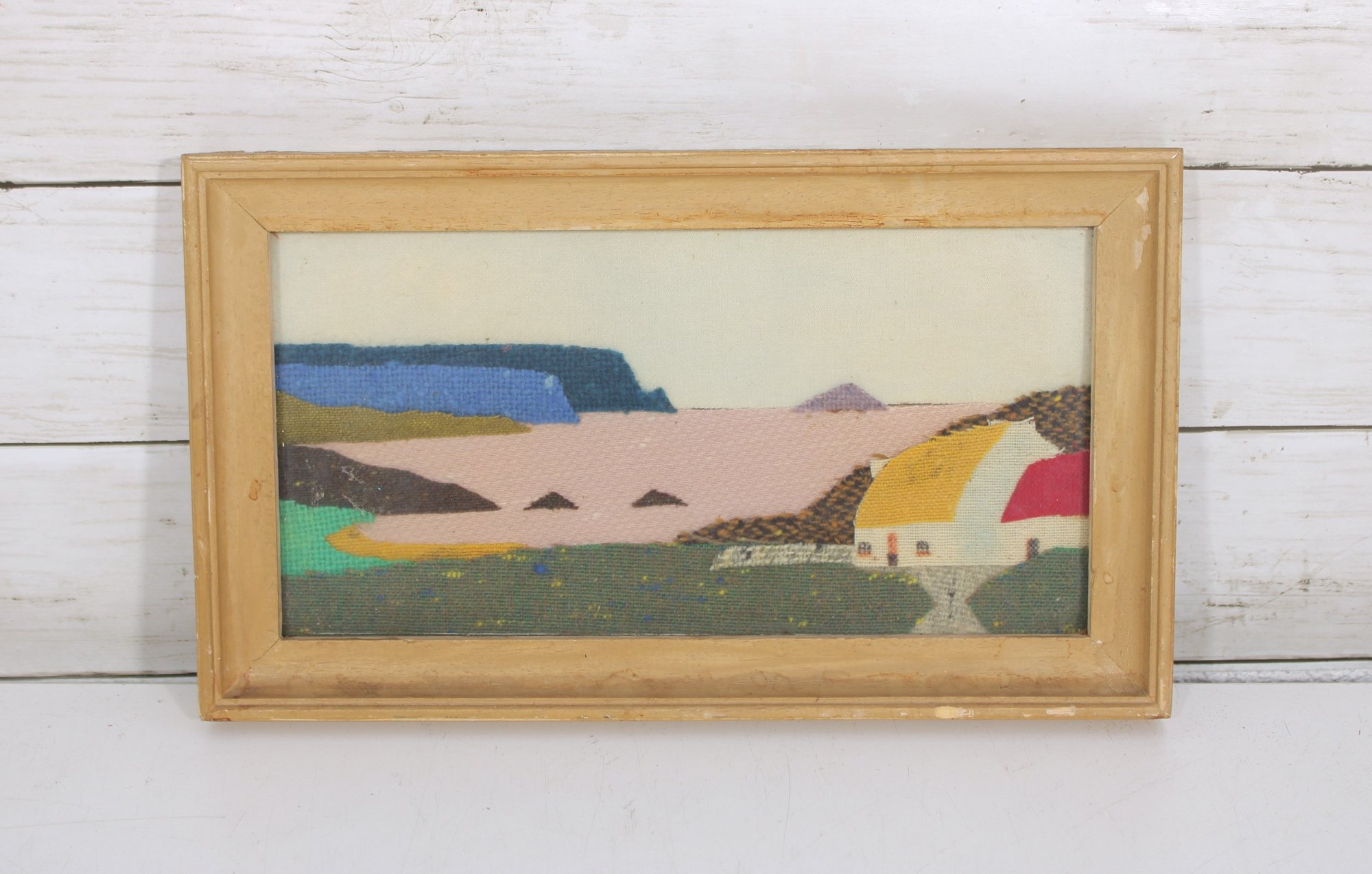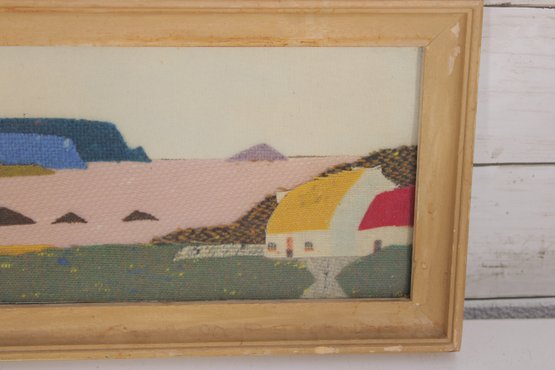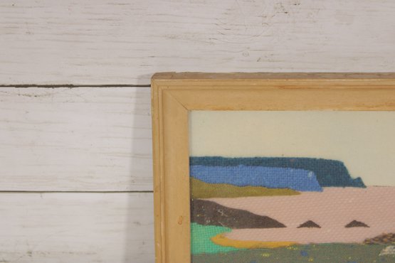 This handcrafted piece features a stylized coastal landscape scene, created using woven Irish tweed fabric to form the image. The design depicts a peaceful shoreline with cliffs, water, and cottages, rendered in soft, natural tones with subtle texture from the tweed material.