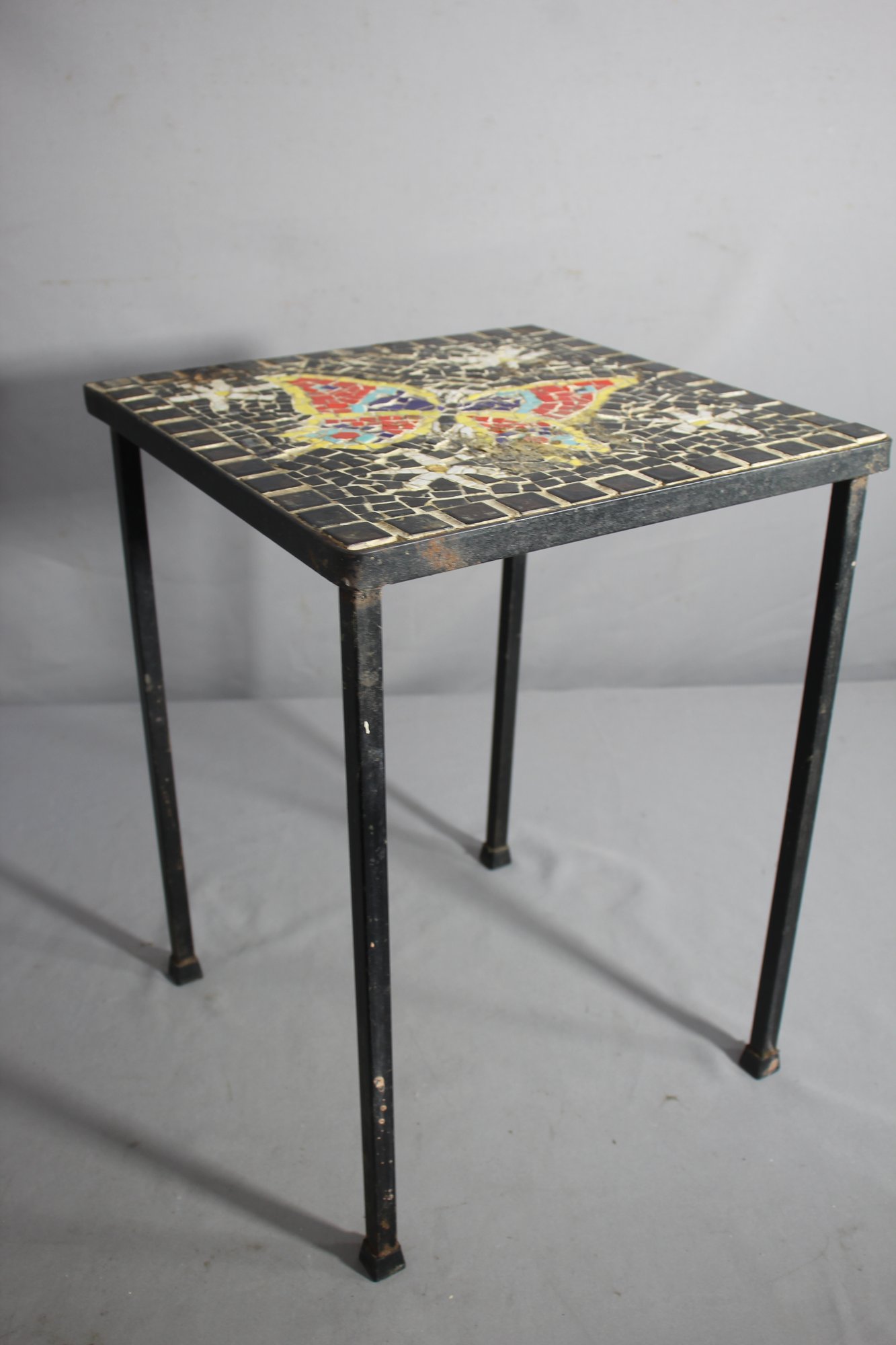 featuring a robust iron base and a vibrant mosaic tabletop. The mosaic design showcases a butterfly motif in a vivid array of colors, including red, blue, yellow, and white, set against a dark backdrop. Each tile has been meticulously placed to form a captivating and intricate pattern. Despite some wear, which adds to its vintage charm, the table remains sturdy and visually striking.
