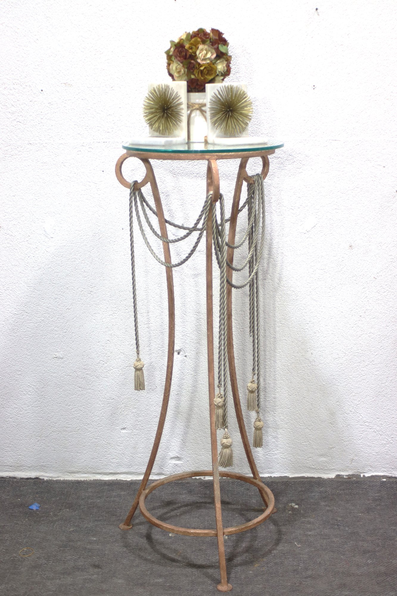 This unique vintage iron side pedestal features an ornate iron base with an elegant draped rope and tassel motif, topped with a round glass surface. The curved metal frame has a distressed finish, giving it a classic aged look, perfect for French, neoclassical, or eclectic interiors.