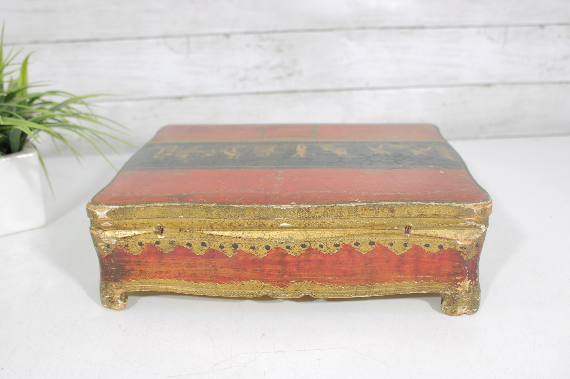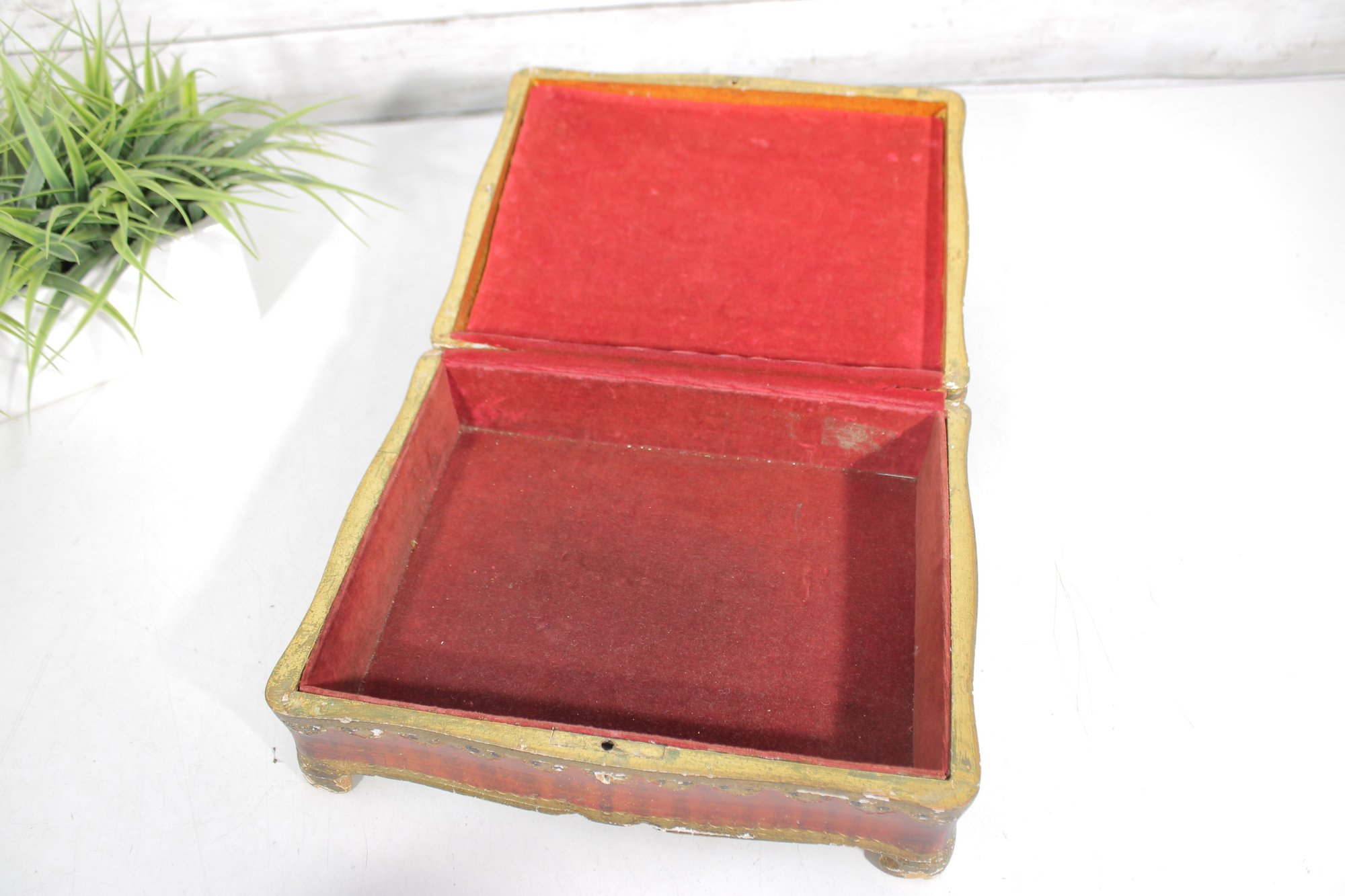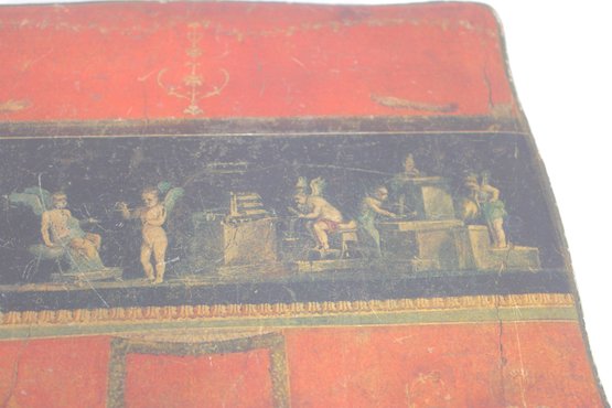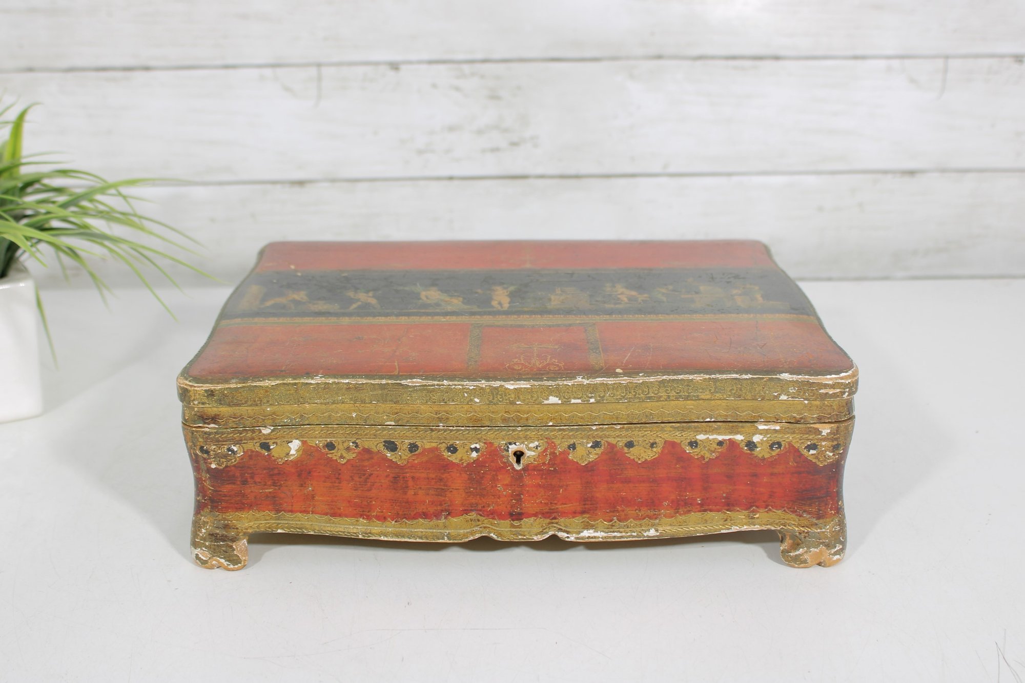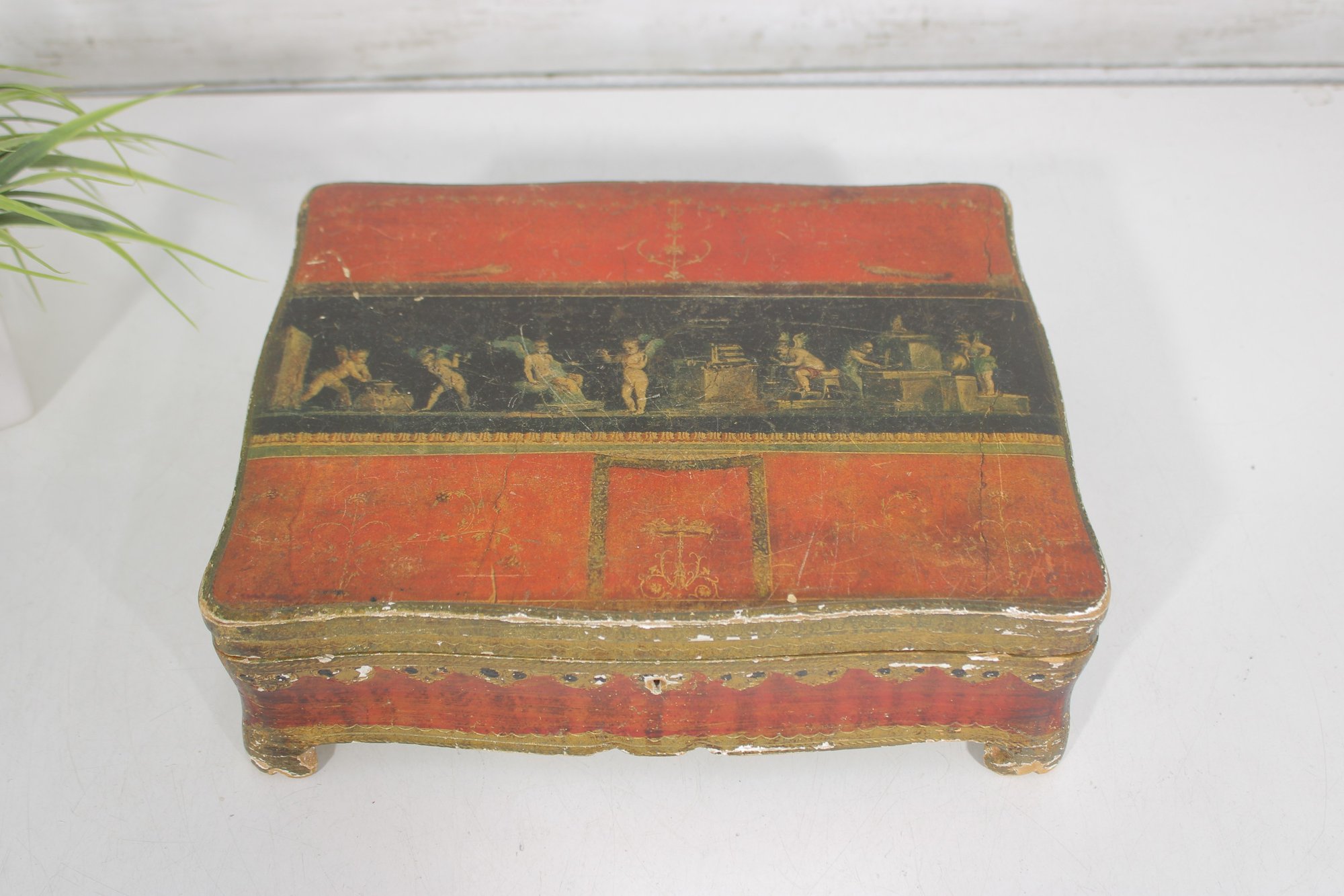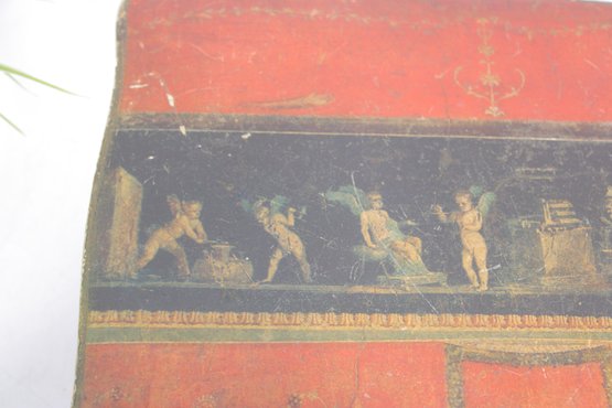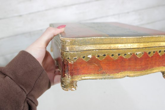 a beautiful vintage Florentine-style decorative jewelry box, featuring a rich red and gold finish with classical cherub artwork across the lid. The design is reminiscent of traditional Italian Florentine toleware, known for its ornate gilded detailing and romantic classical scenes.