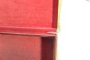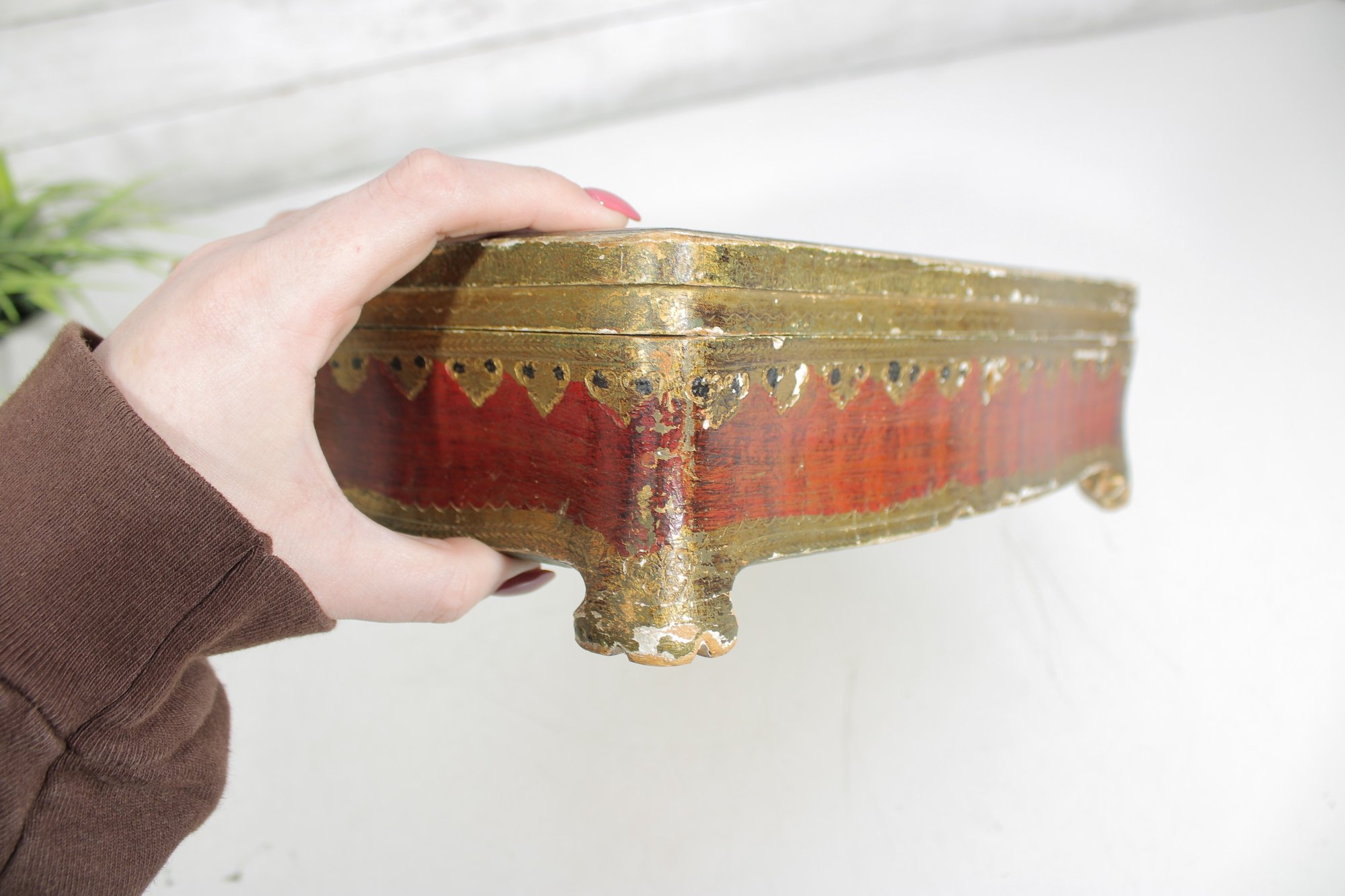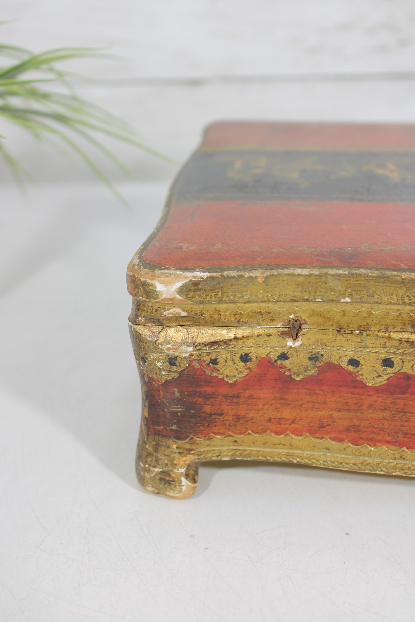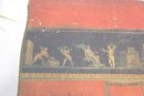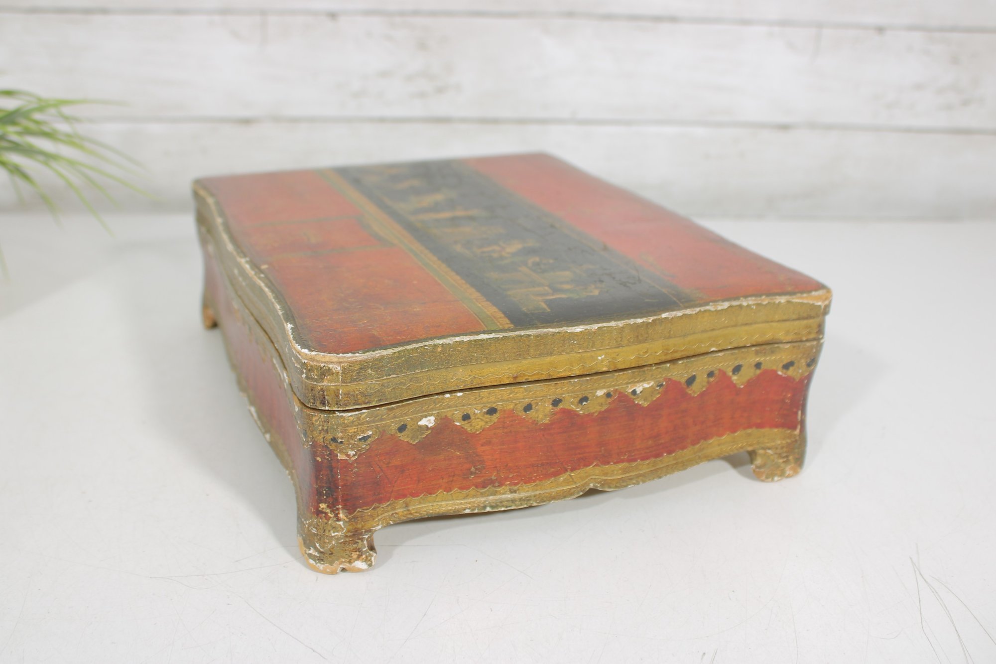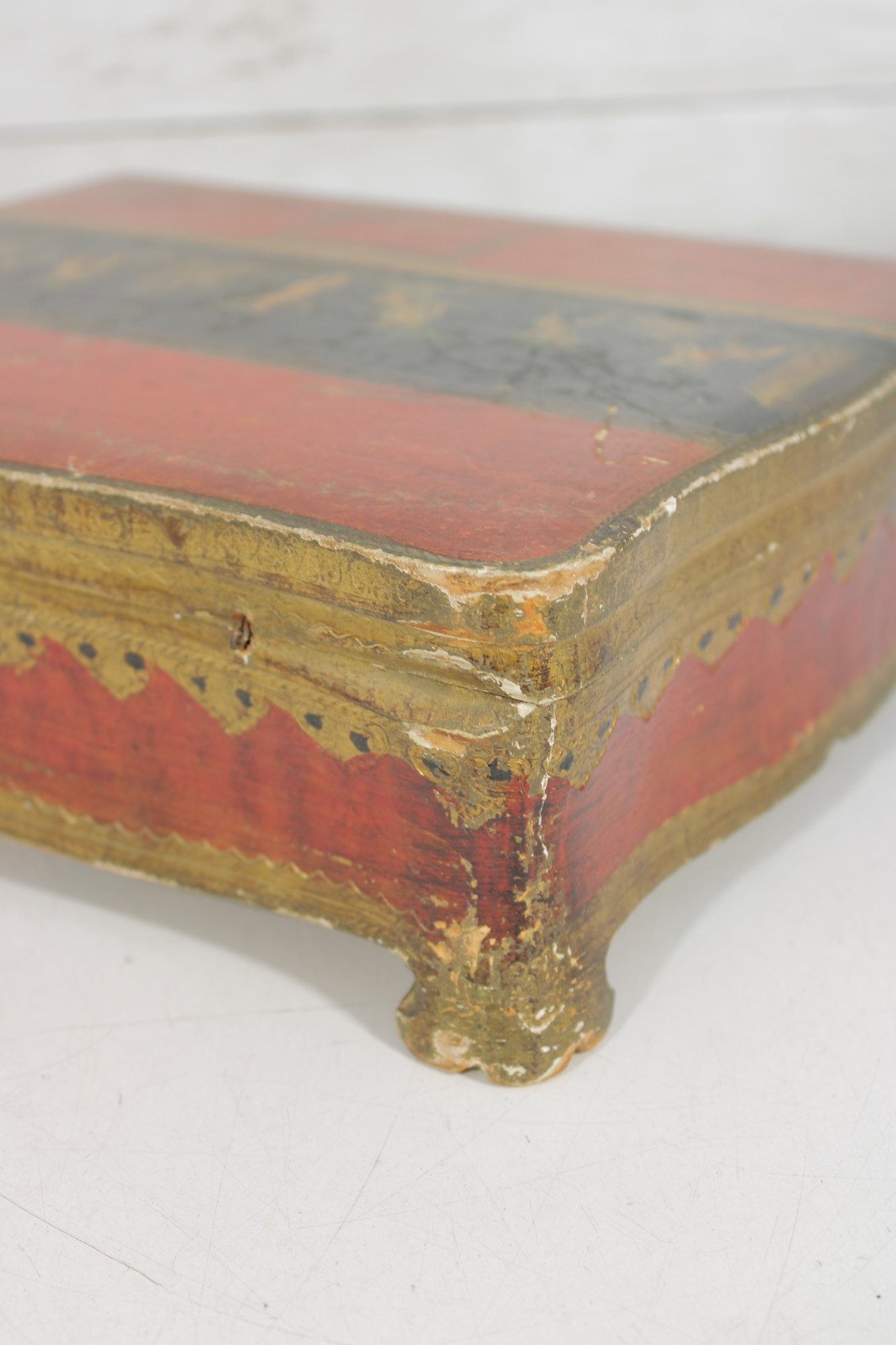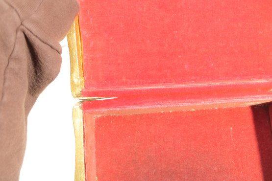 a beautiful vintage Florentine-style decorative jewelry box, featuring a rich red and gold finish with classical cherub artwork across the lid. The design is reminiscent of traditional Italian Florentine toleware, known for its ornate gilded detailing and romantic classical scenes.