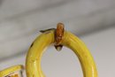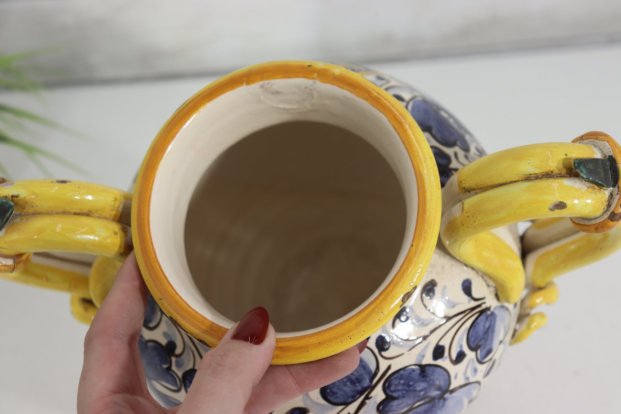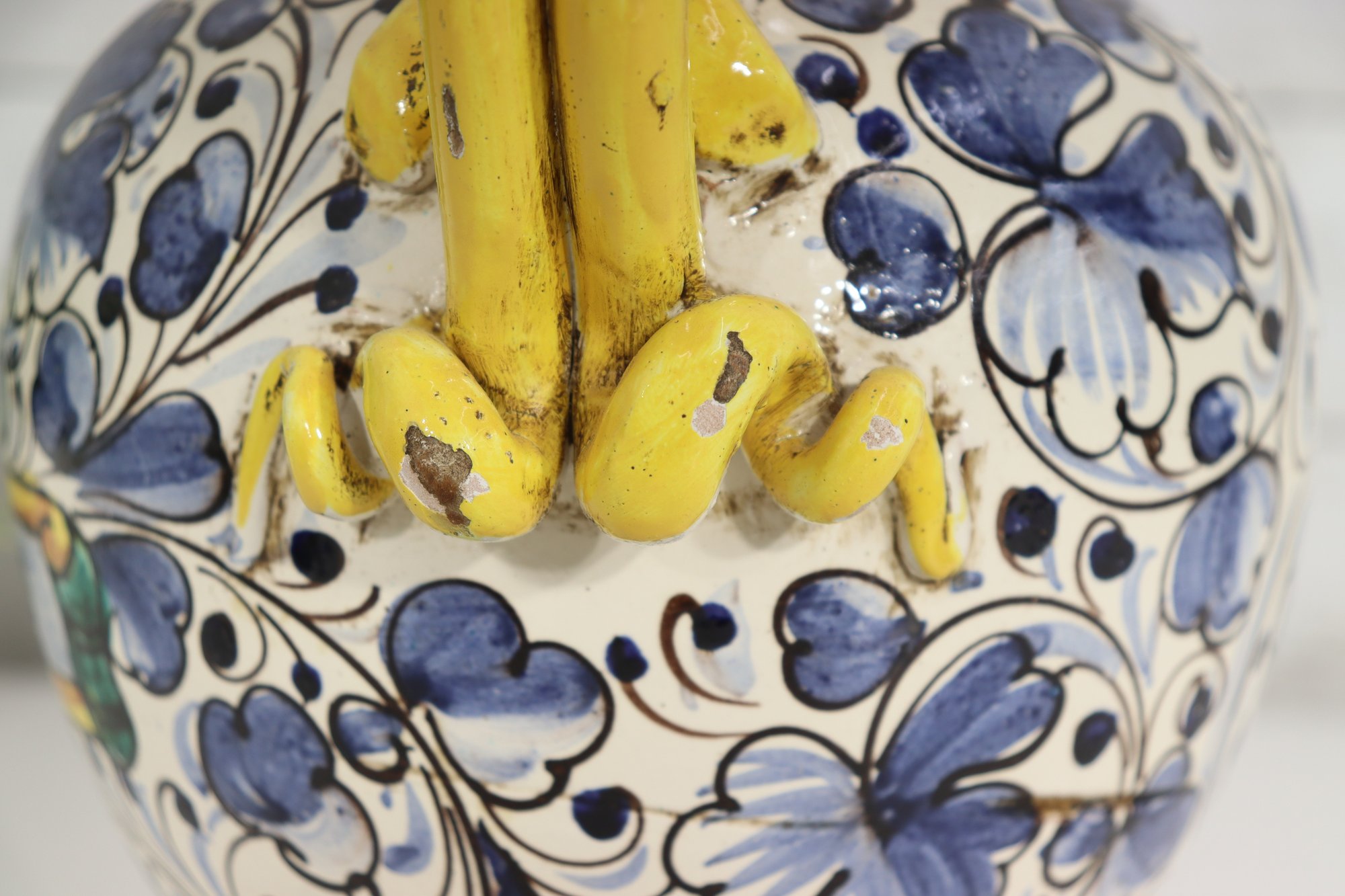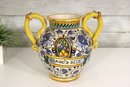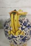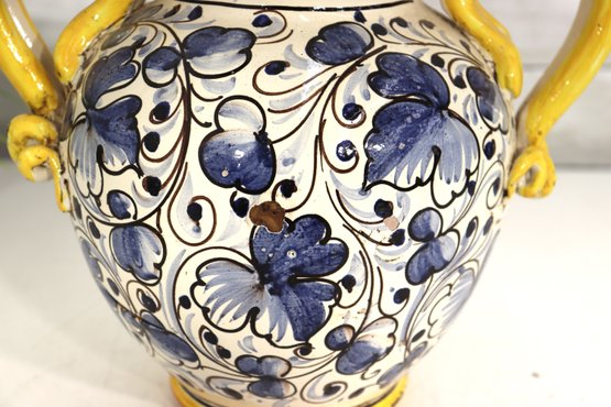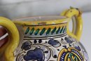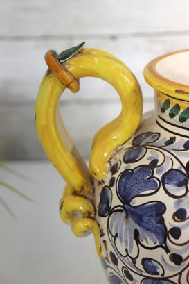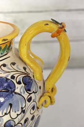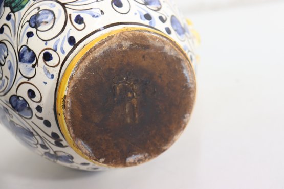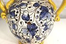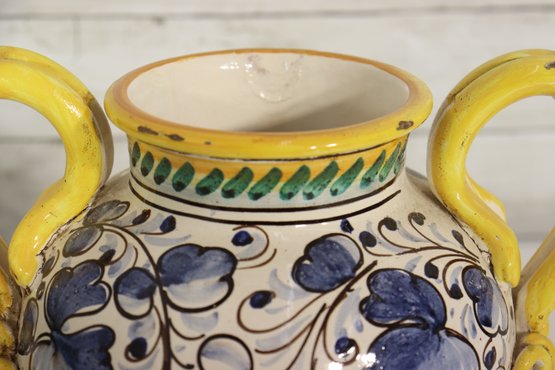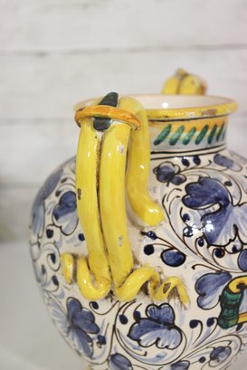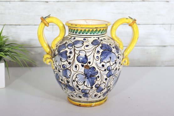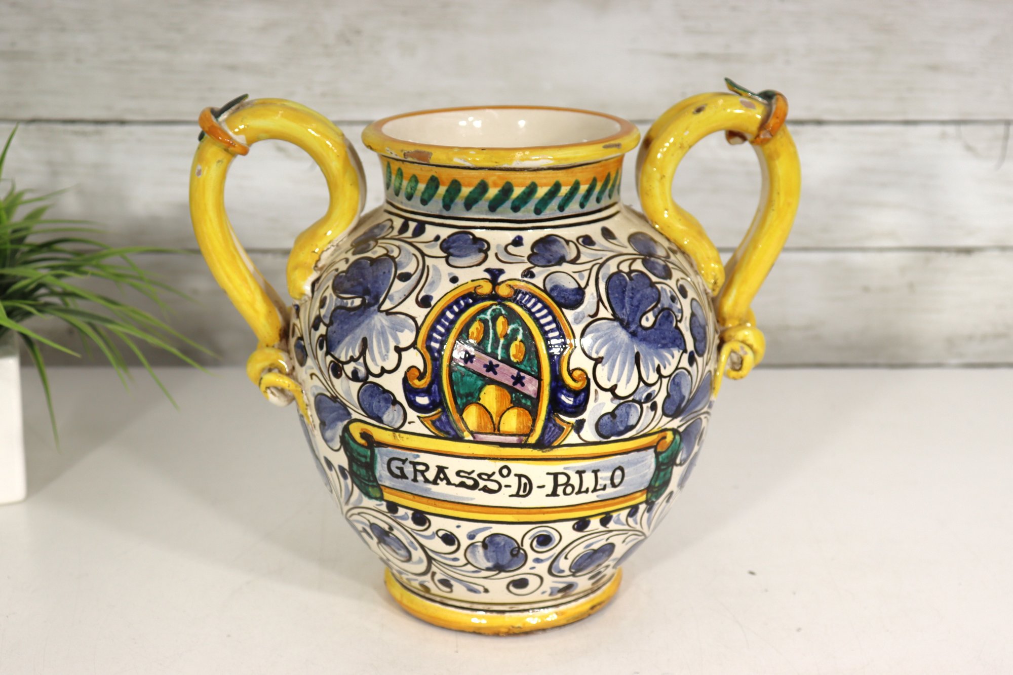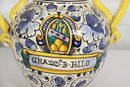 Beautiful vintage Italian Majolica style apothecary jar featuring vibrant hand painted floral décor in blue, yellow, and green with scroll detailing throughout. Classic dual side sculpted handles in bright yellow. Front cartouche reads “Grass D’ Rillo” – typical of old world herbal / pharmacy style labeling.