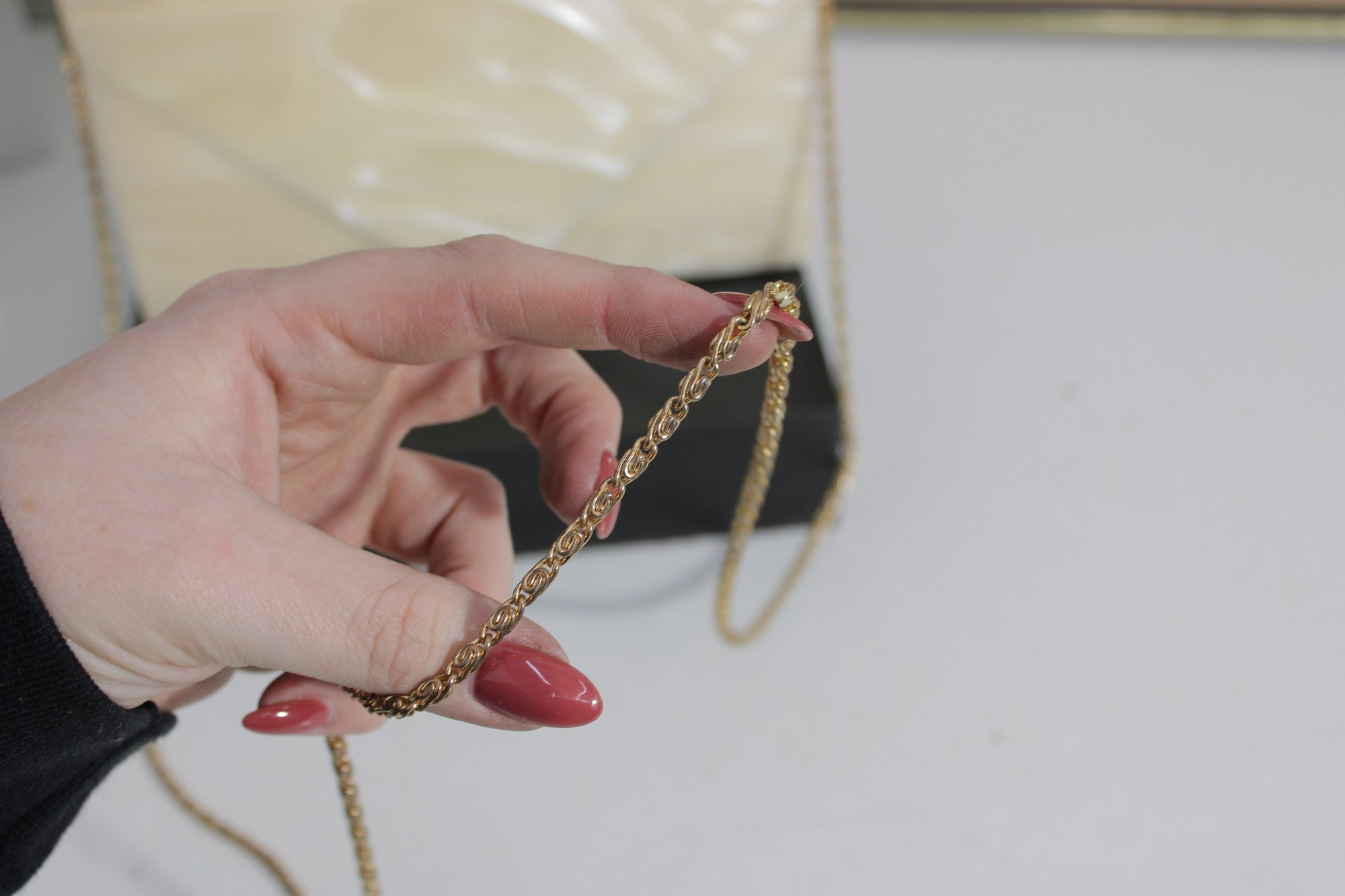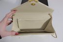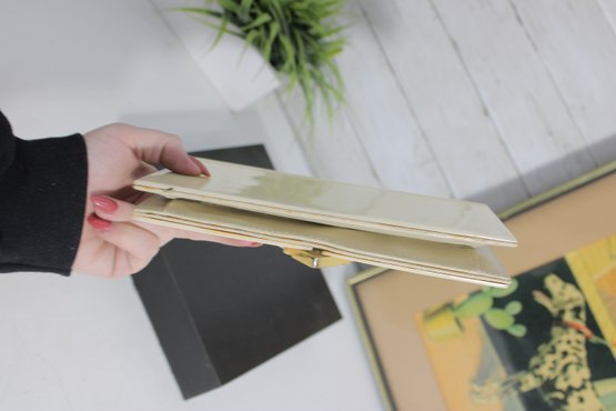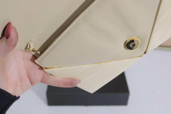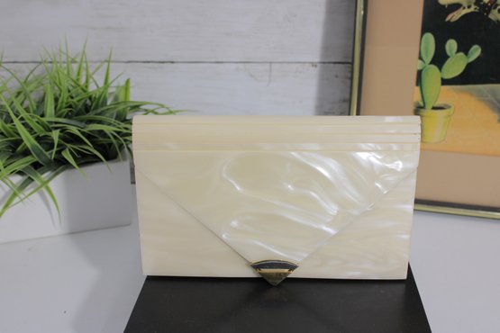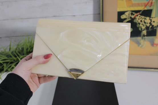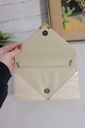 vintage envelope-style clutch in a beautiful ivory tone with a subtle pearlized swirl finish. This timeless handbag features a sleek, structured design with a gold-tone accent at the flap and a removable gold chain strap for shoulder or crossbody wear.