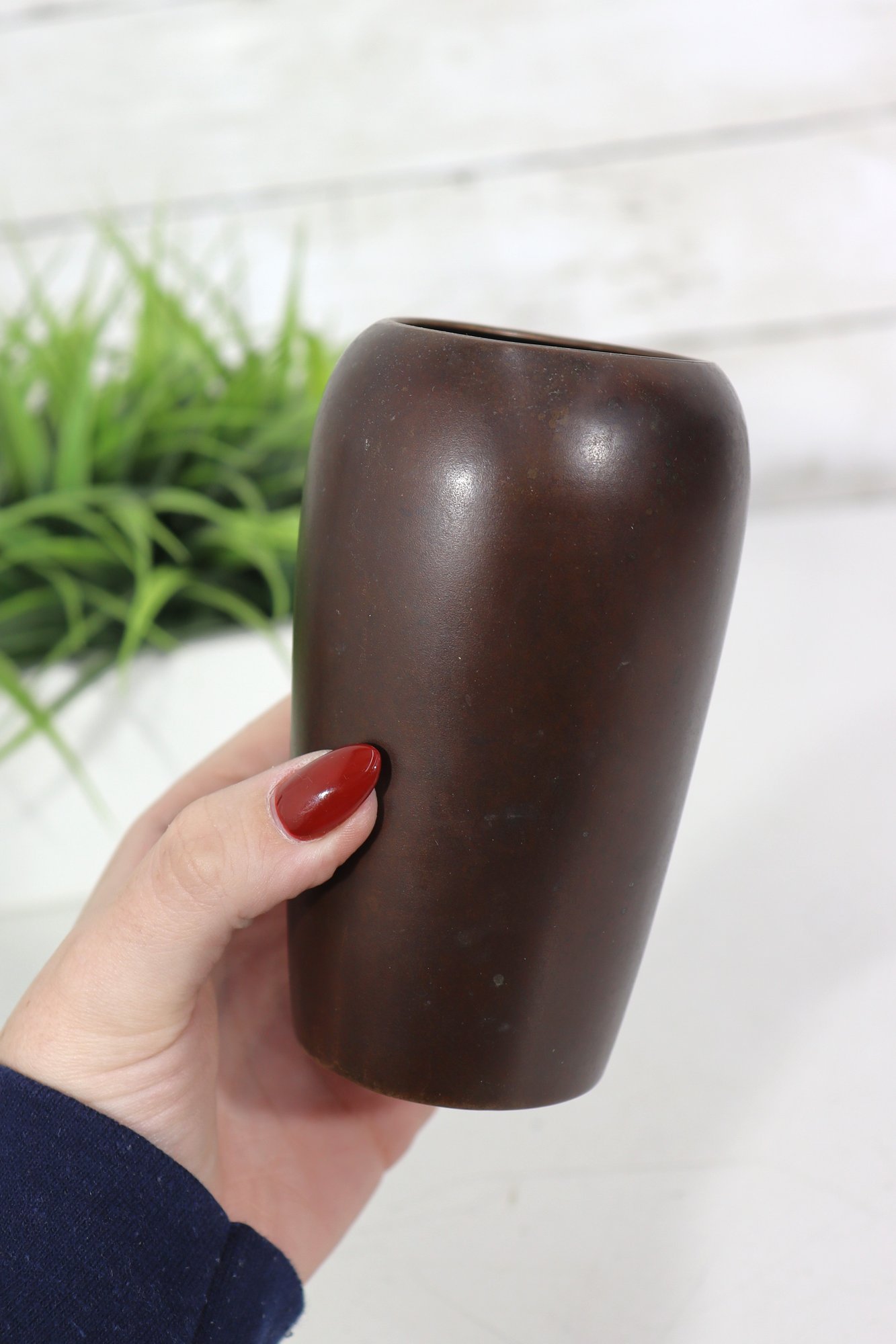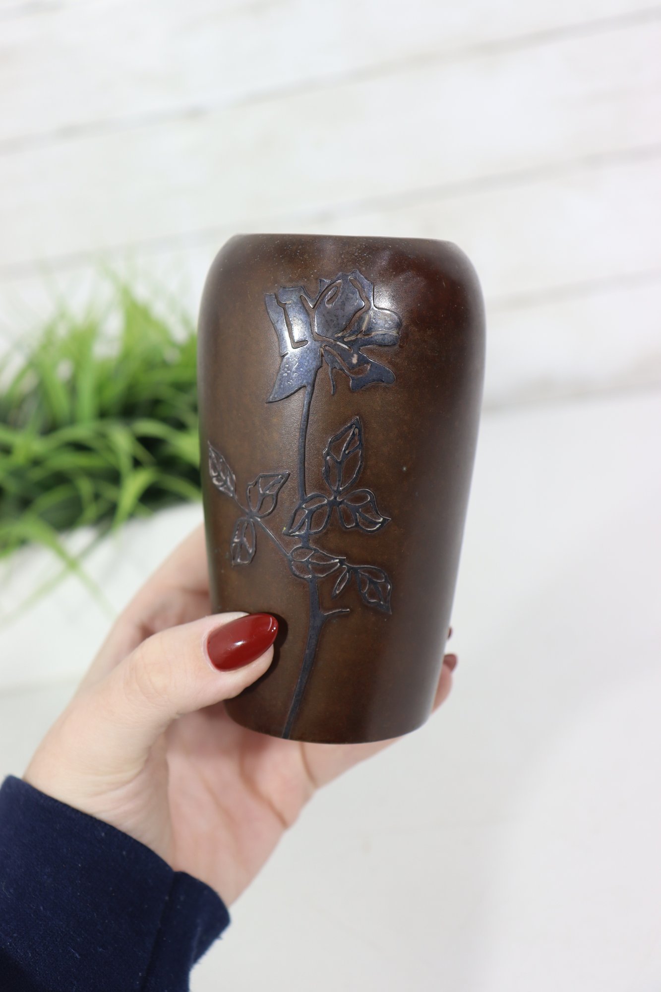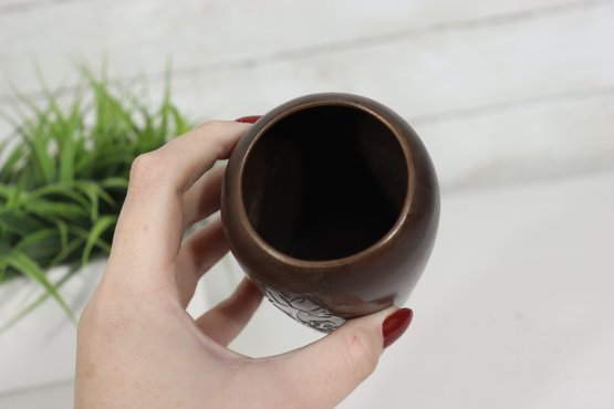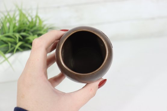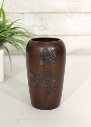 Elegant and finely detailed, this vintage Japanese bronze vase stands 5 inches tall and features a beautifully cast floral relief design on the front. The rich bronze-brown finish highlights the depth of the design, giving the piece both texture and warmth.