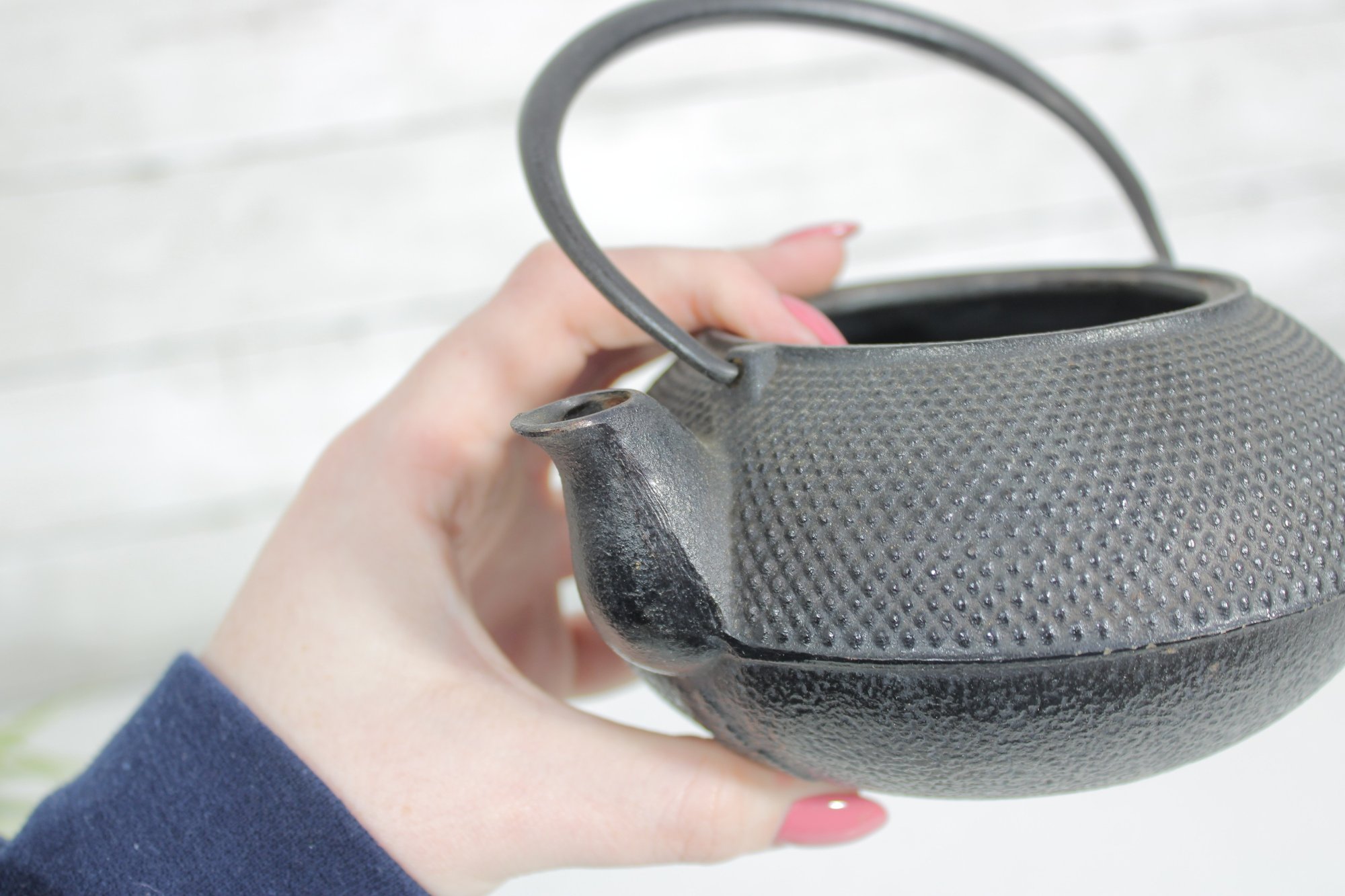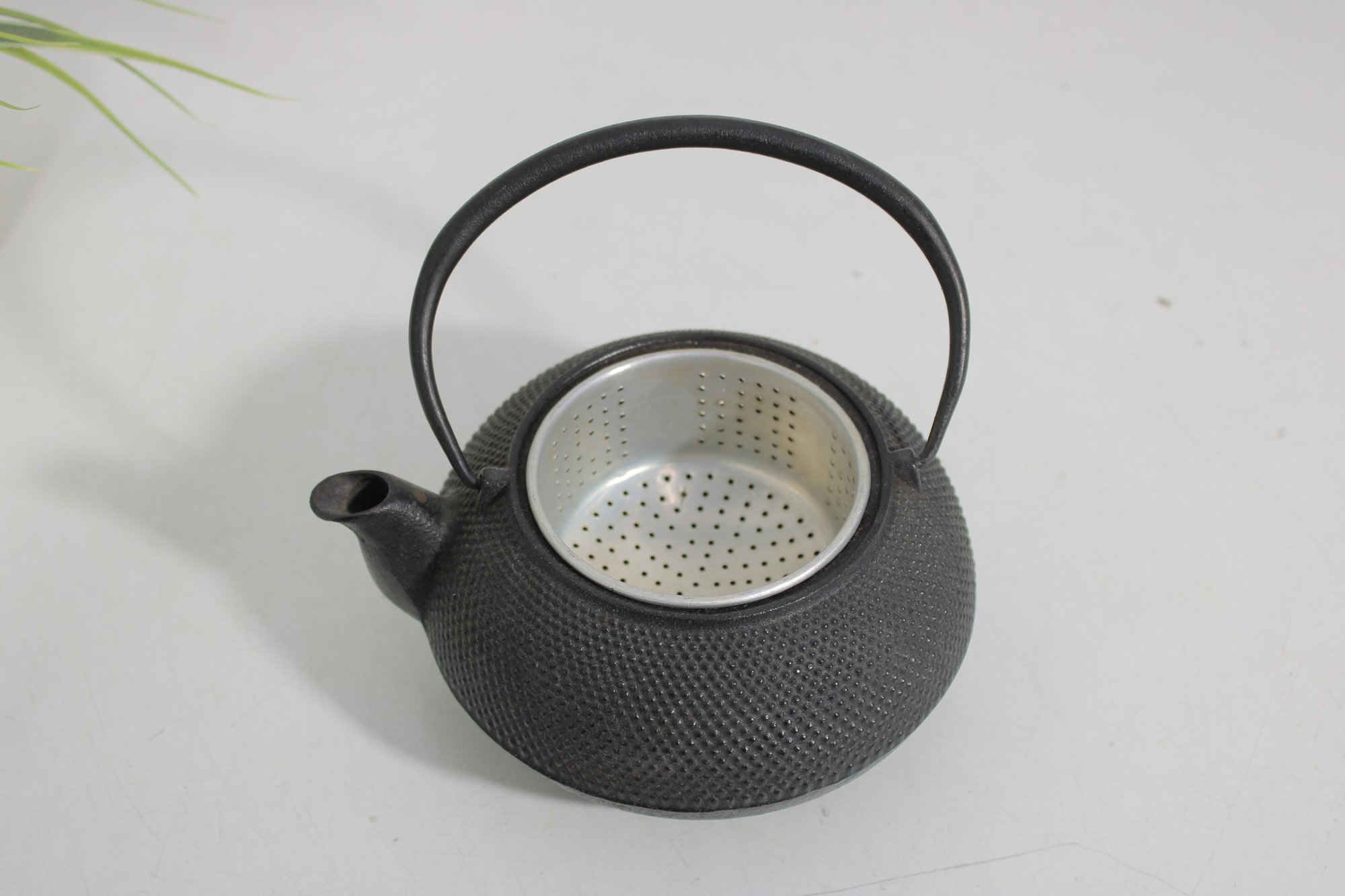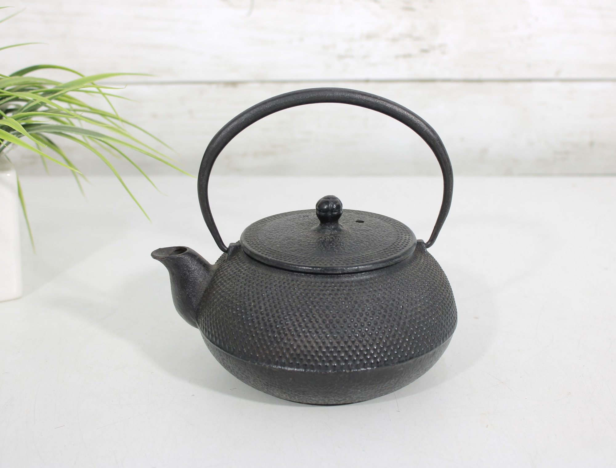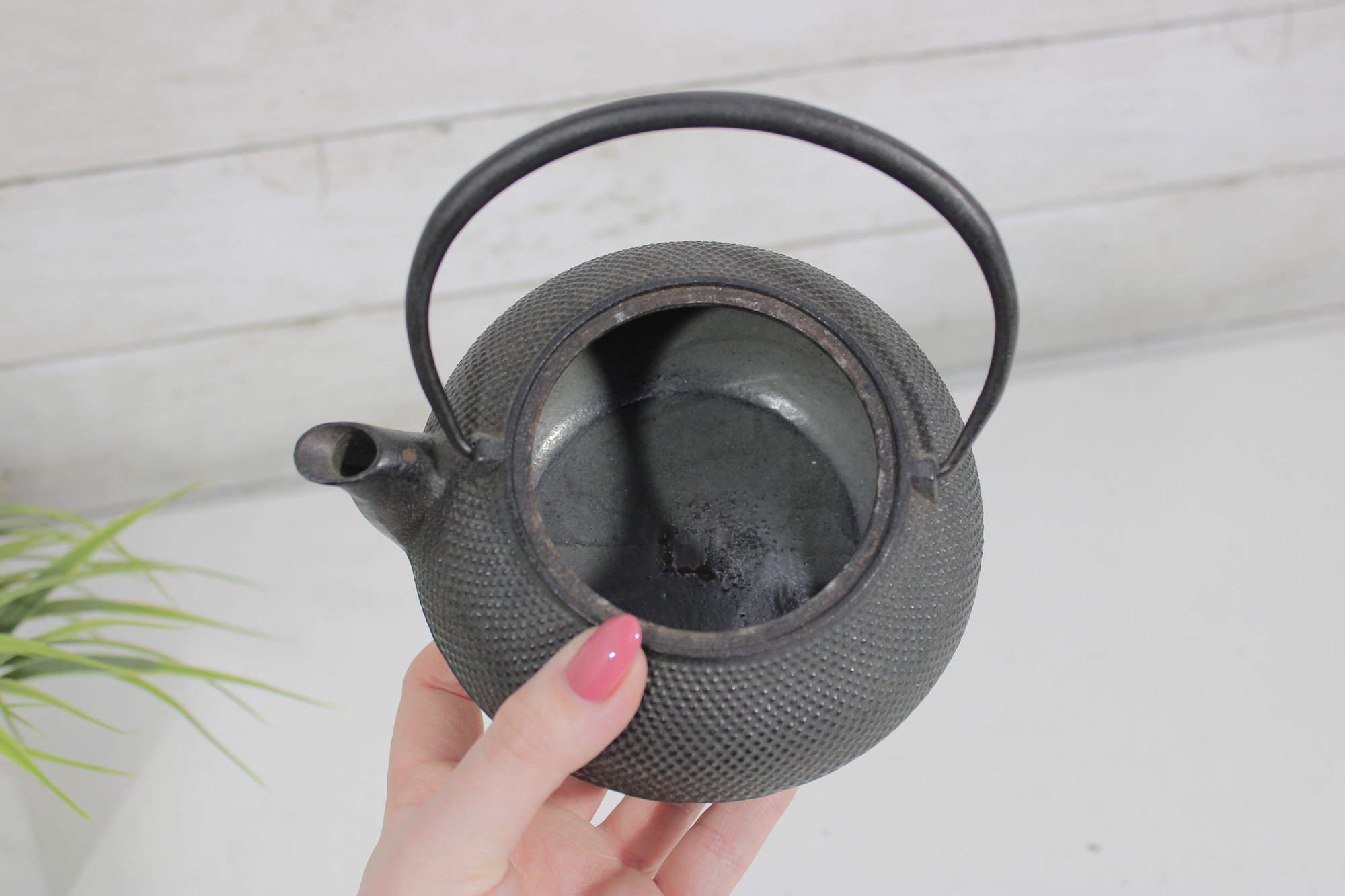 vintage Japanese-style cast iron tetsubin teapot featuring a classic hobnail (arare) textured design. This traditional teapot has a beautiful black cast iron finish, a sturdy swing handle, and comes with a removable metal tea infuser basket, perfect for loose leaf tea.