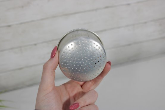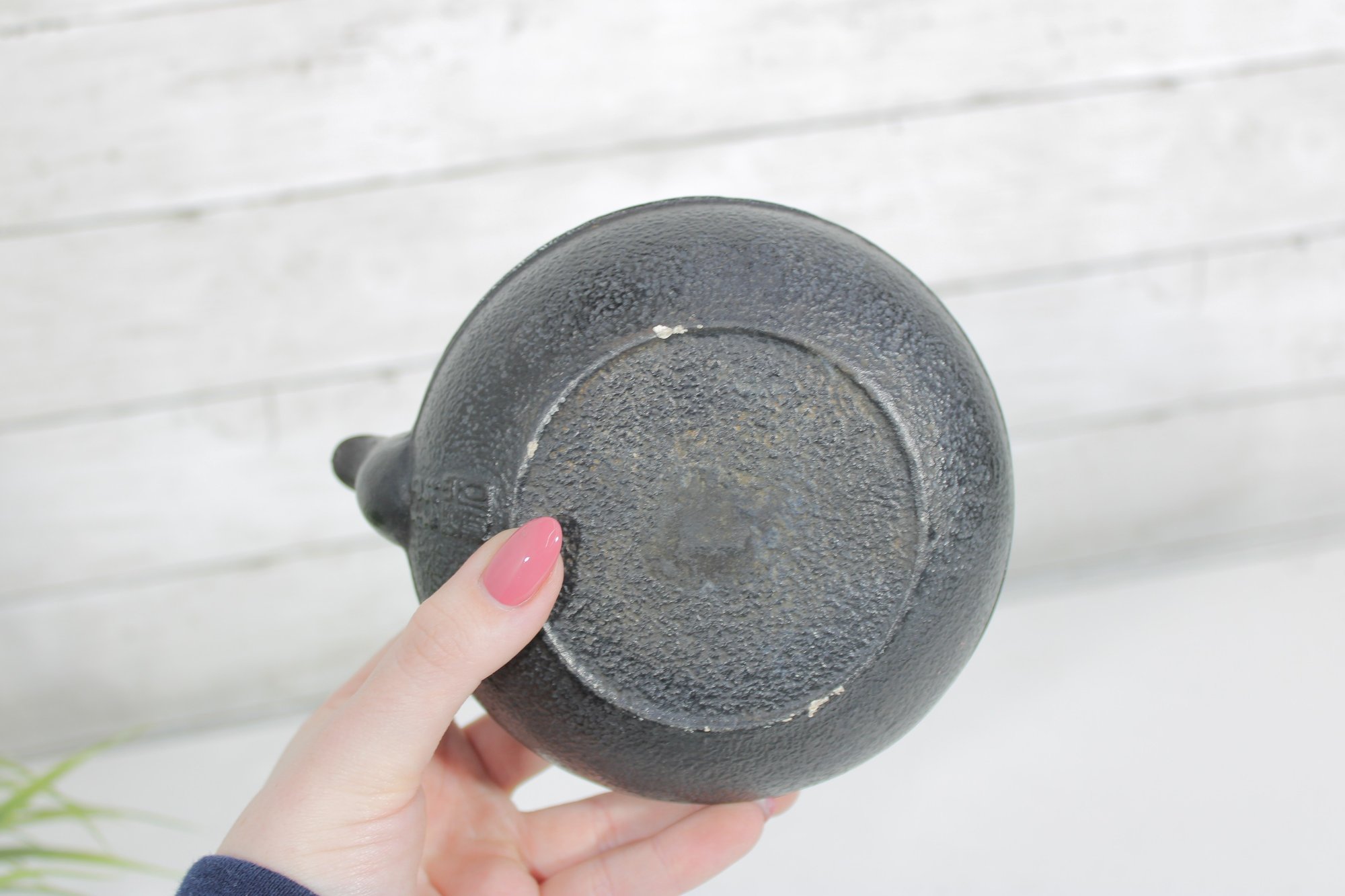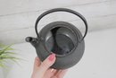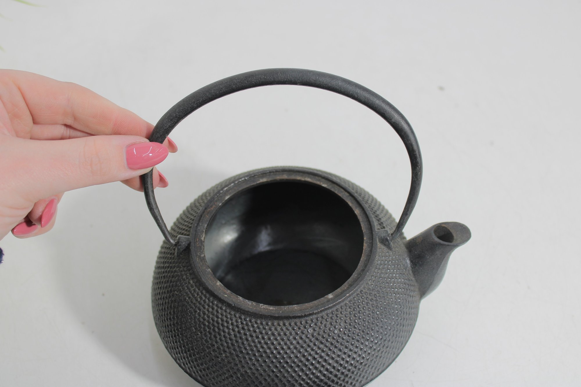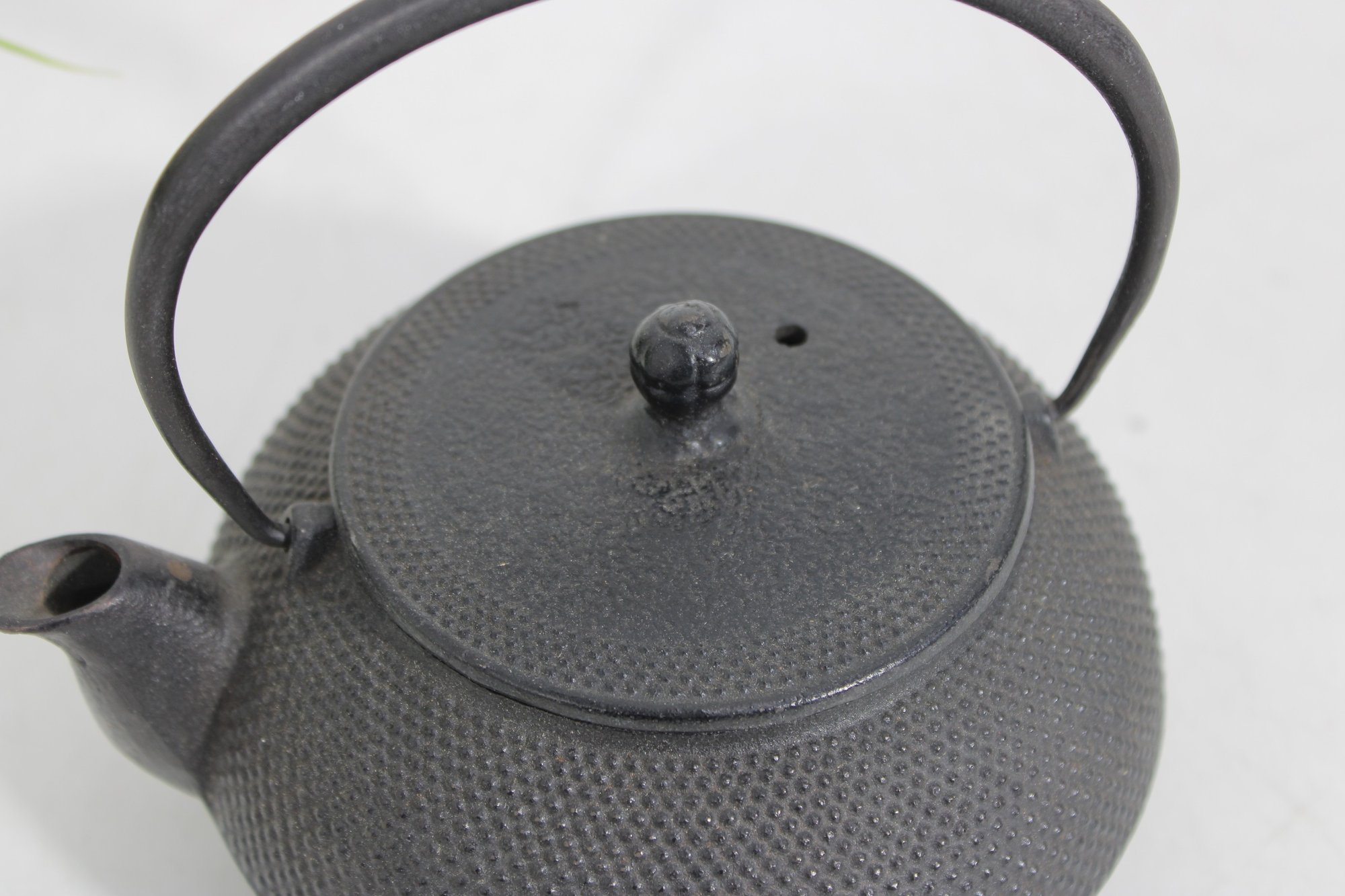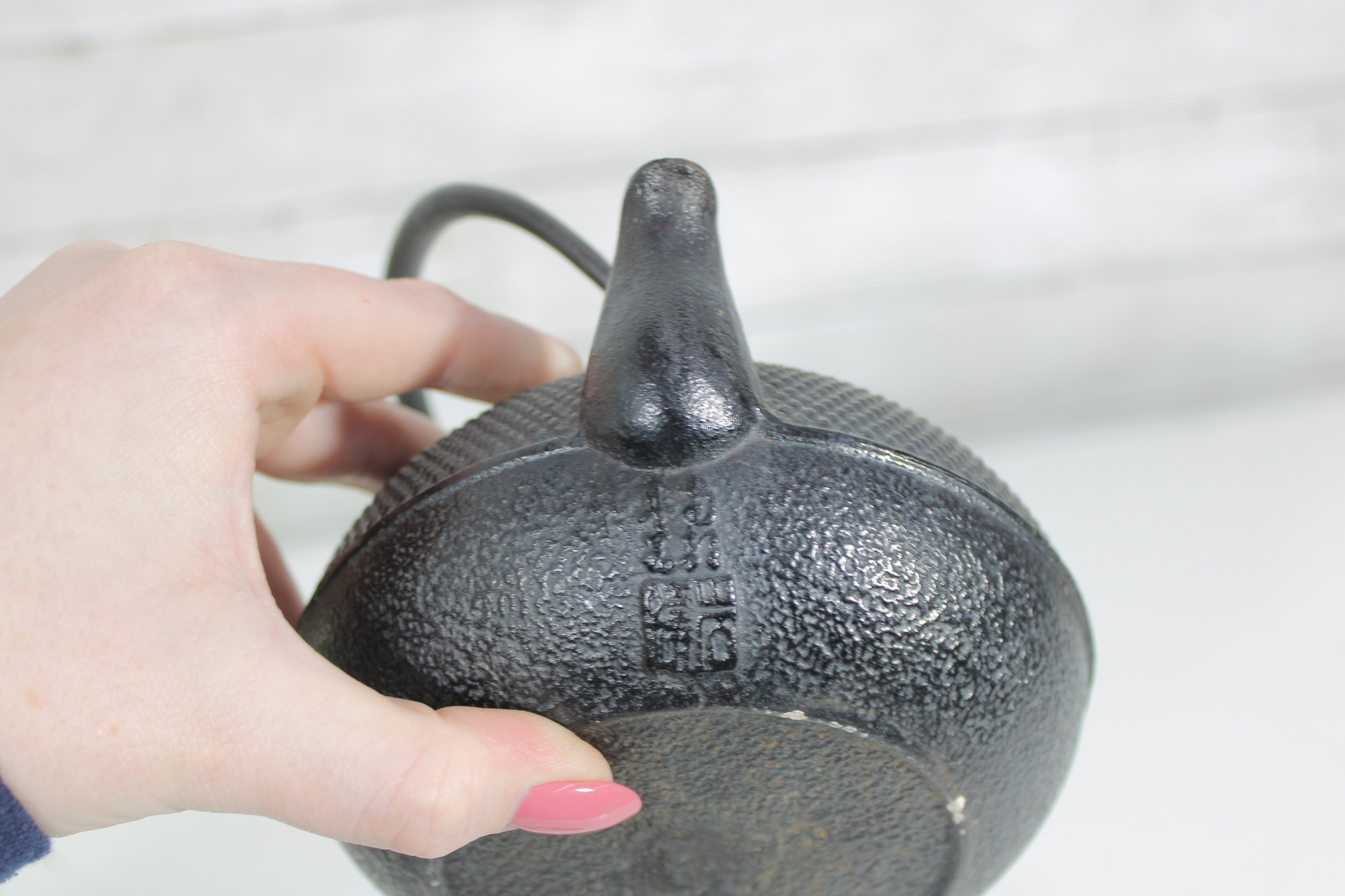 vintage Japanese-style cast iron tetsubin teapot featuring a classic hobnail (arare) textured design. This traditional teapot has a beautiful black cast iron finish, a sturdy swing handle, and comes with a removable metal tea infuser basket, perfect for loose leaf tea.
