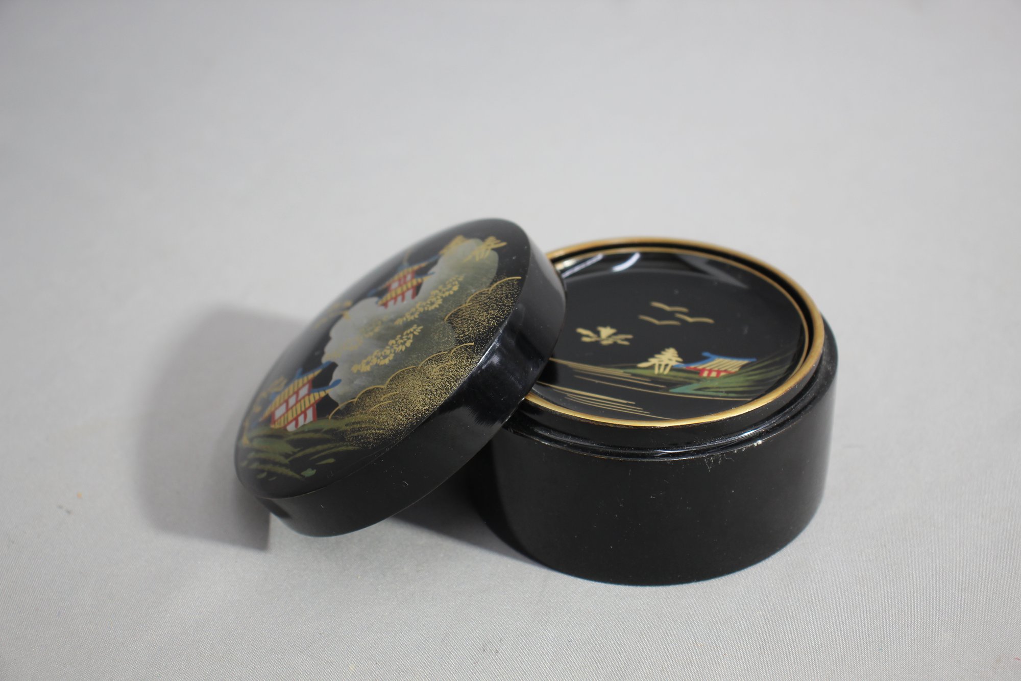 Japanese lacquerware with this vintage coaster set, complete with six hand-painted coasters nestled in their original container. Each coaster is a miniature canvas displaying scenes of traditional Japanese landscapes