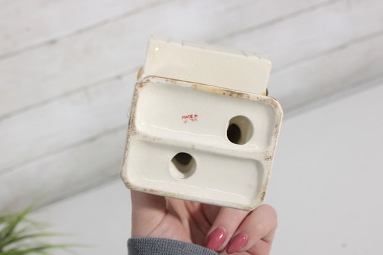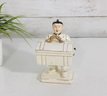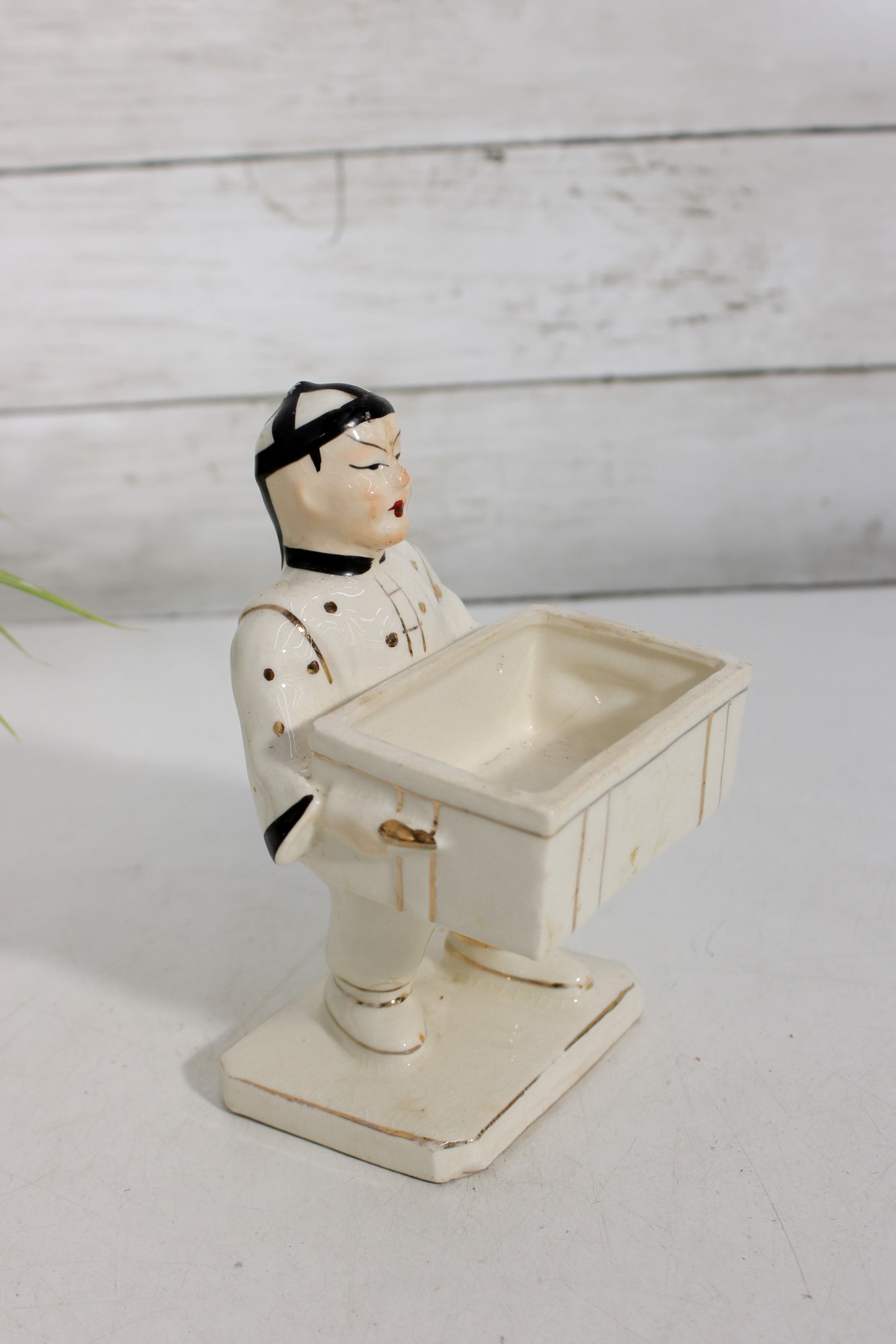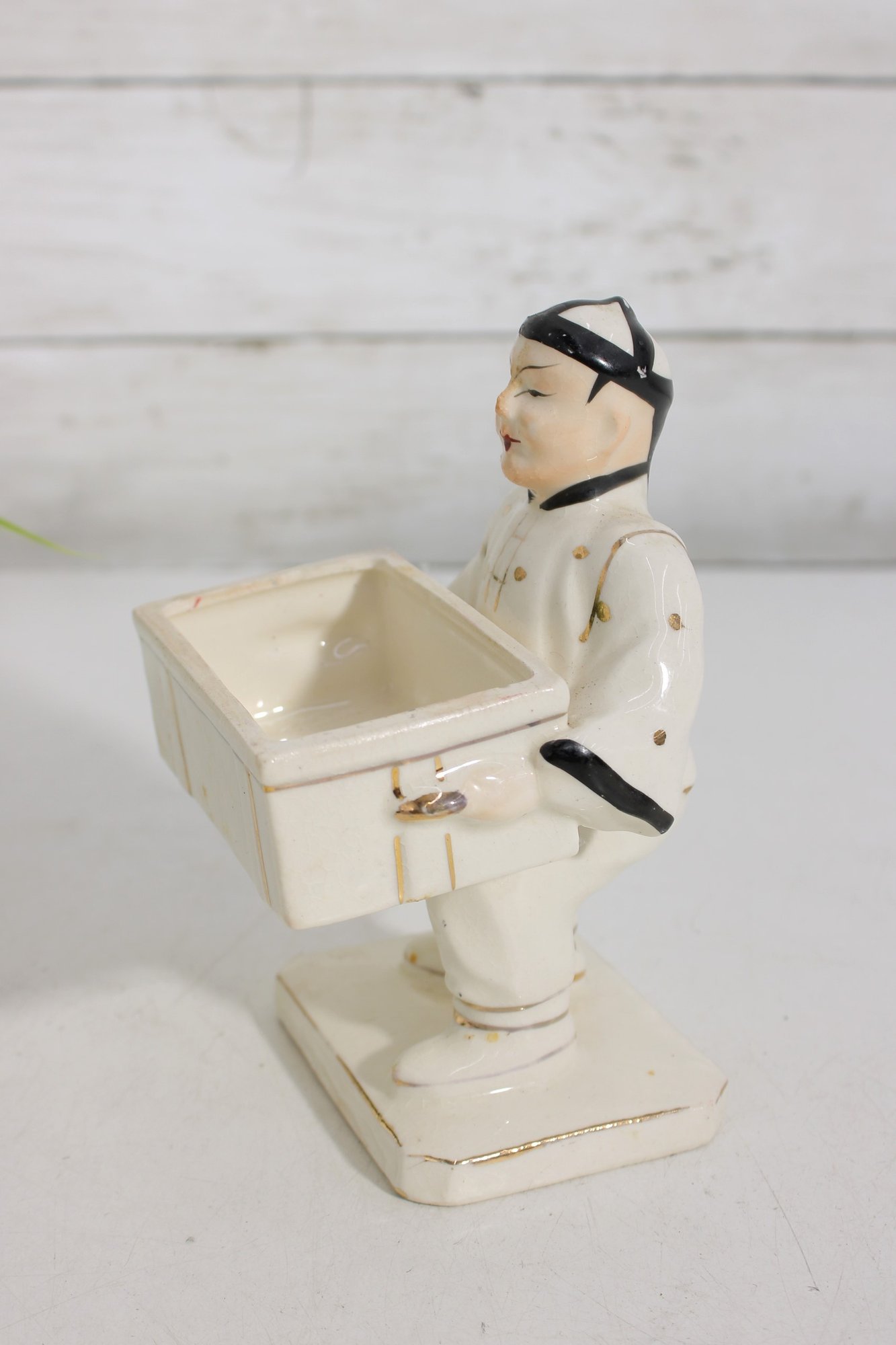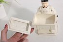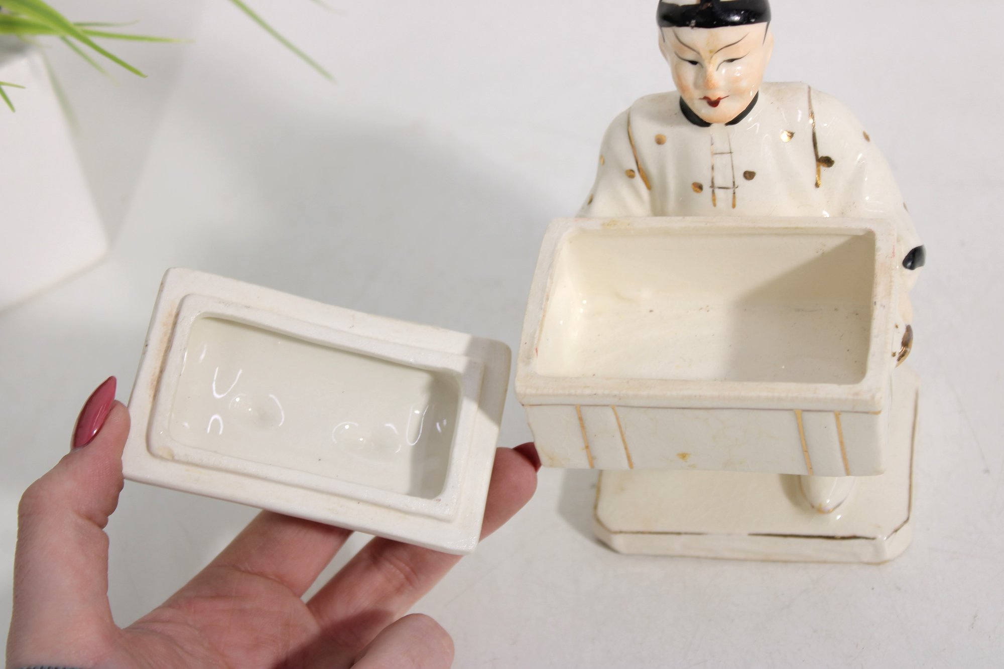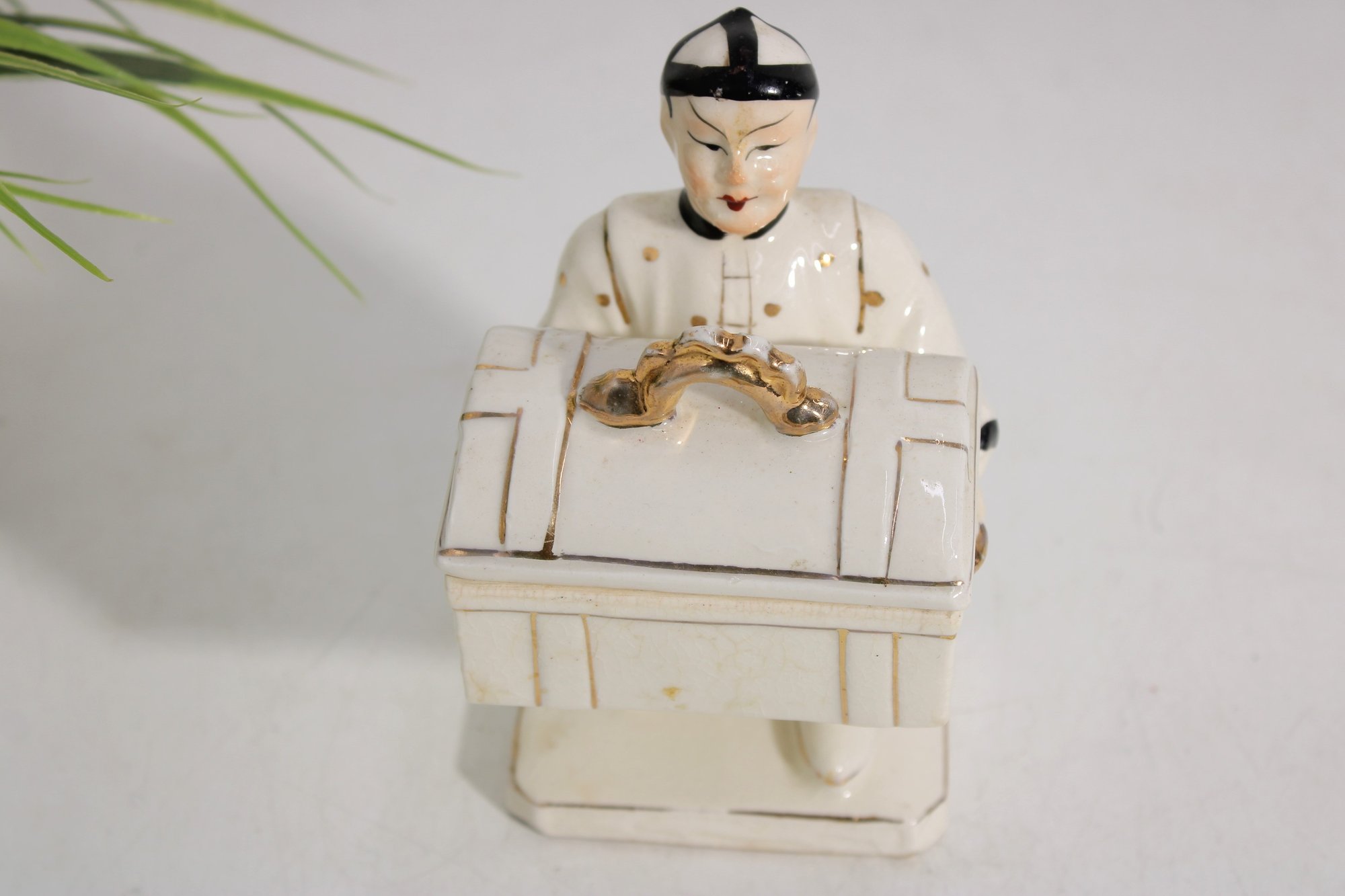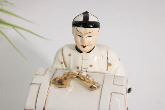 Unique vintage Japanese porcelain figurine box featuring an Asian man carrying a chest adorned with a striking serpent-form handle. This decorative piece combines sculptural artistry with functionality, as the chest opens to reveal a small storage compartment.