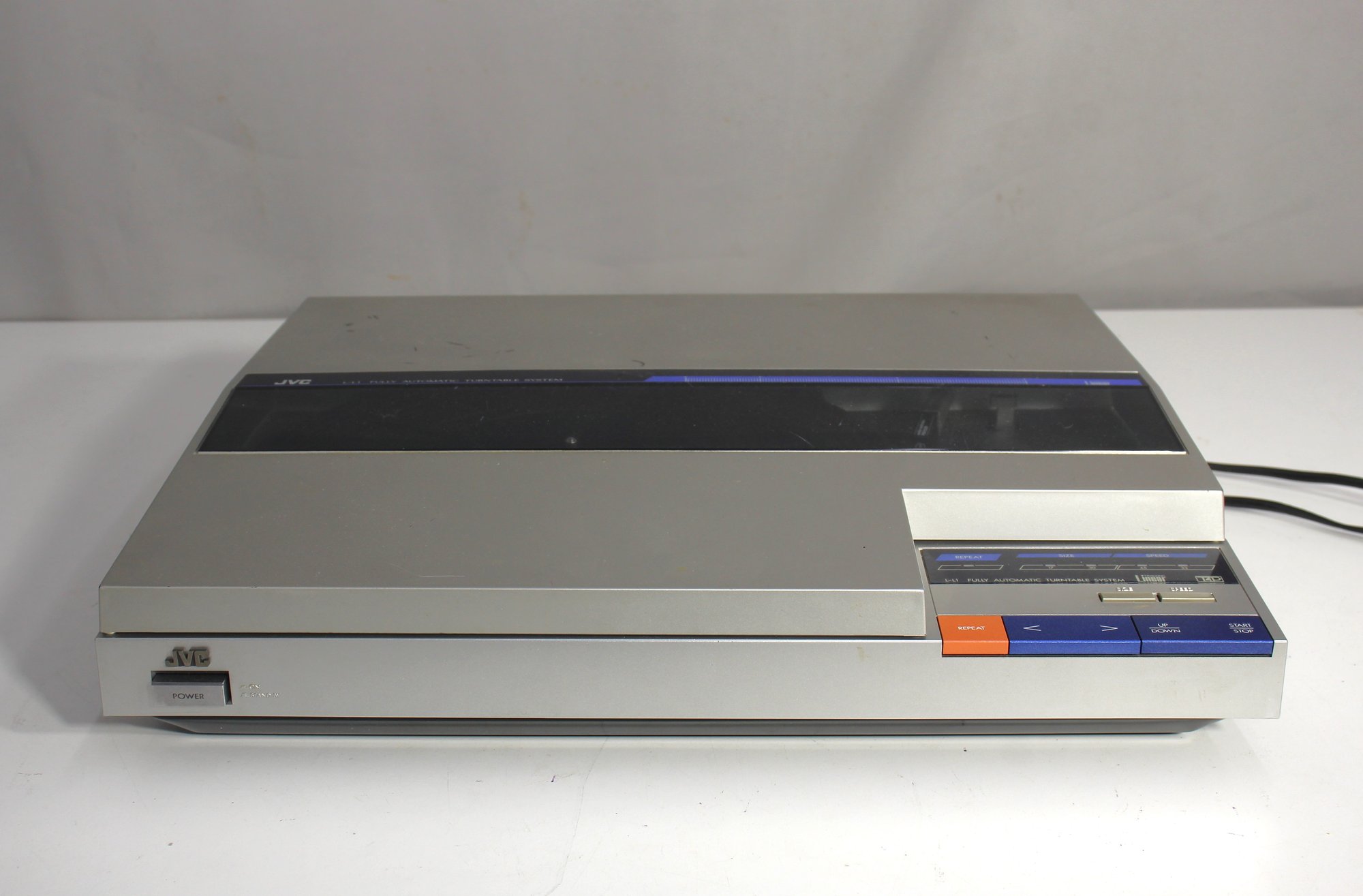 This vintage JVC L-L1 fully automatic turntable system is a fantastic find for audiophiles and vintage electronics collectors. Featuring a sleek silver design with blue and orange accents, this turntable offers both style and functionality. It comes equipped with controls for repeat, speed adjustment, and cueing, allowing for a versatile listening experience. The unit has a sturdy build and a dust cover to protect the turntable when not in use.