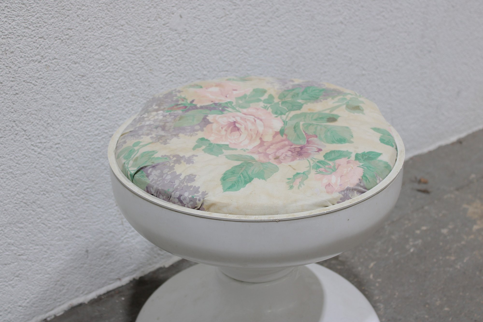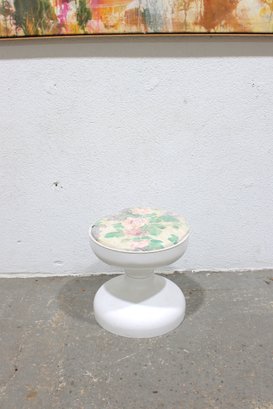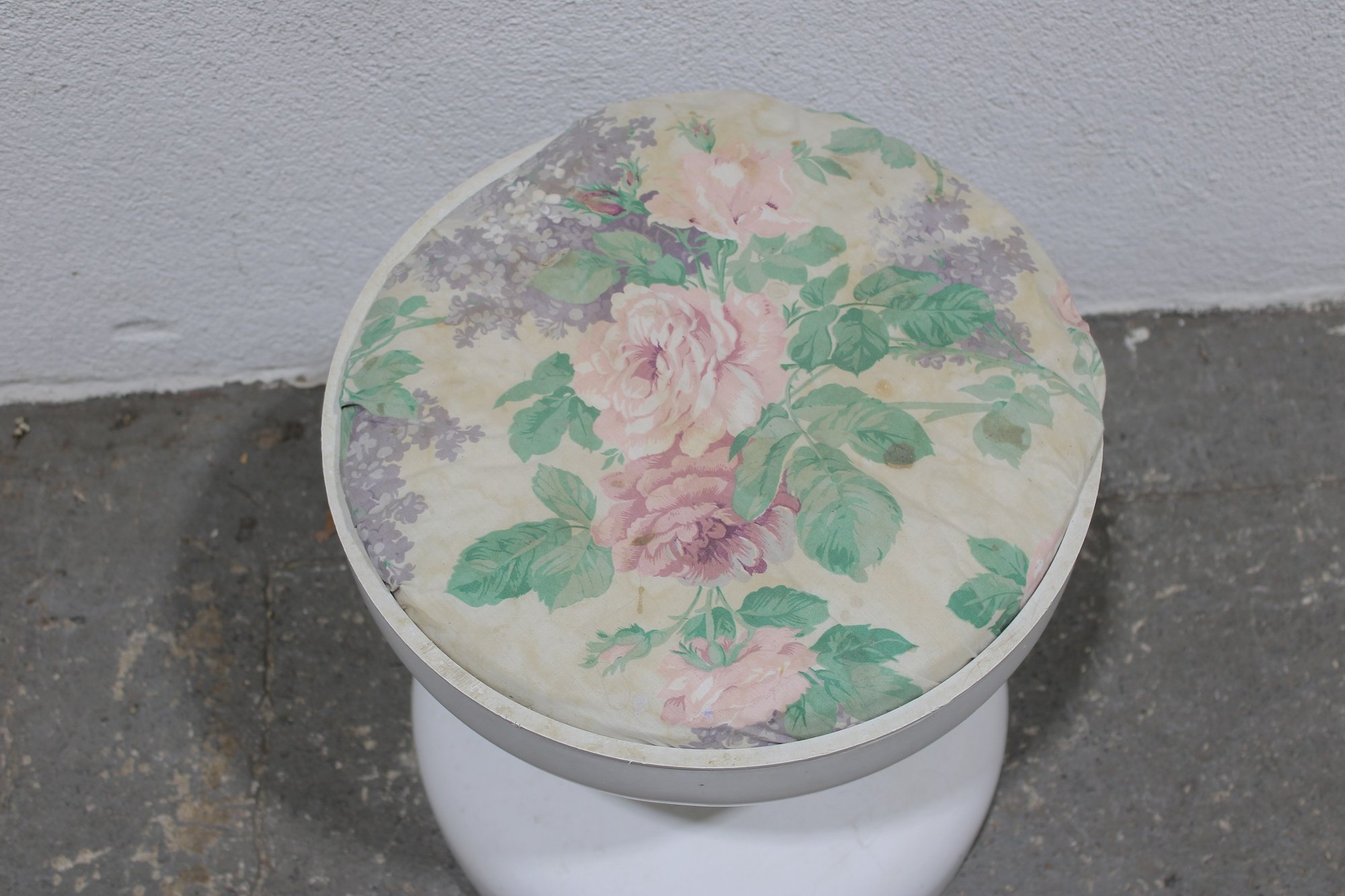 The stool is topped with a removable floral upholstered cushion, adding a touch of vintage charm and comfort. Its compact size makes it ideal as a vanity stool, accent seat, or decorative piece.