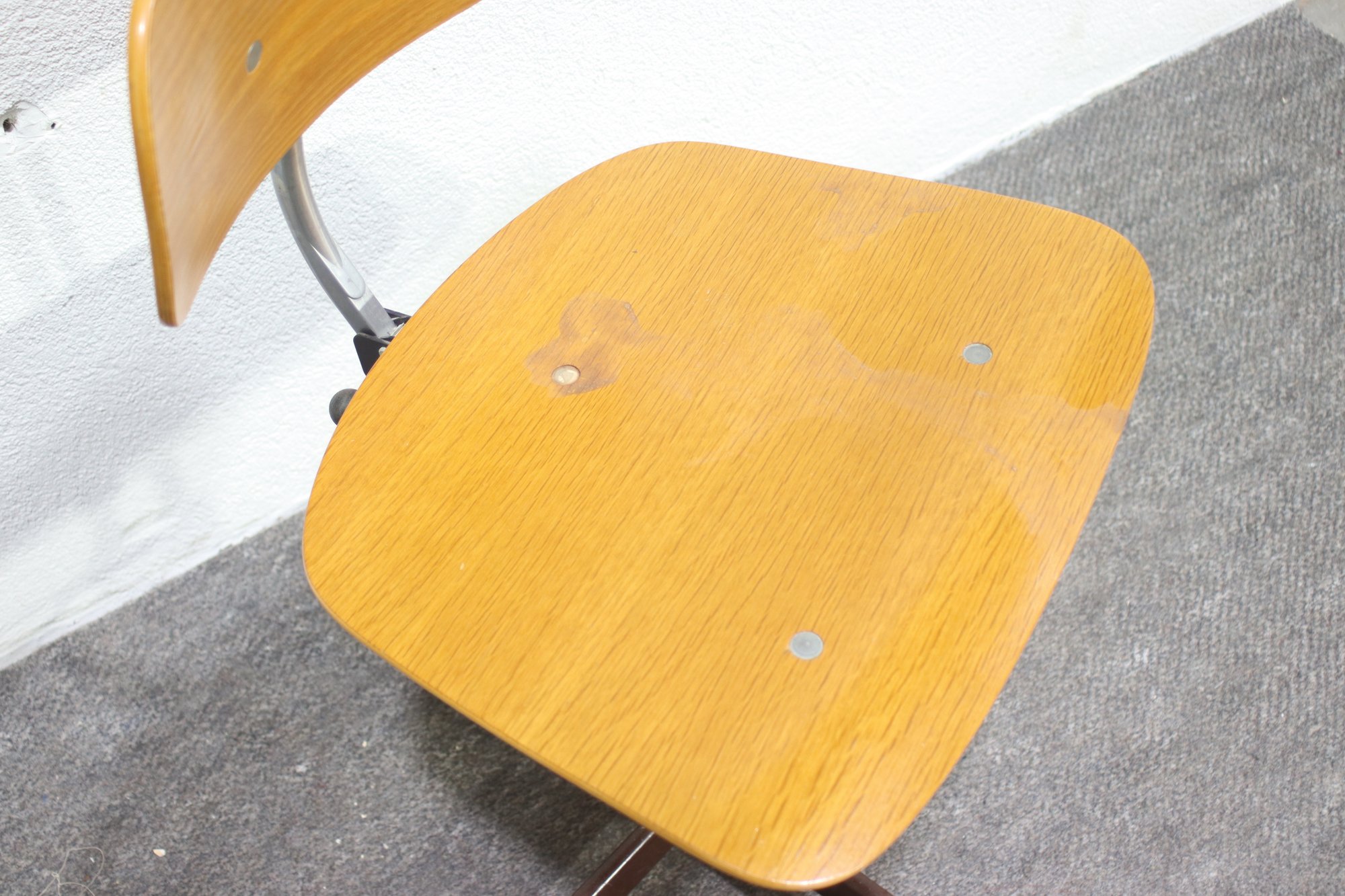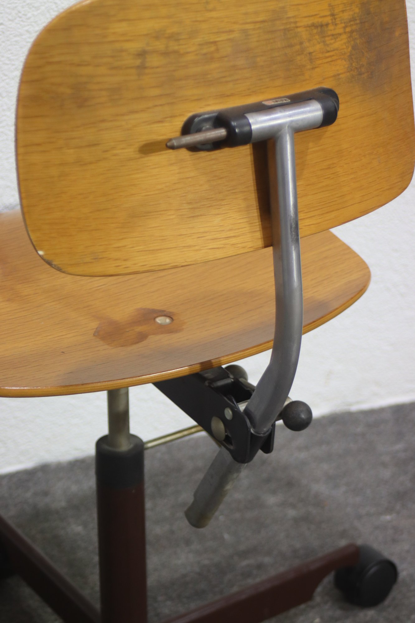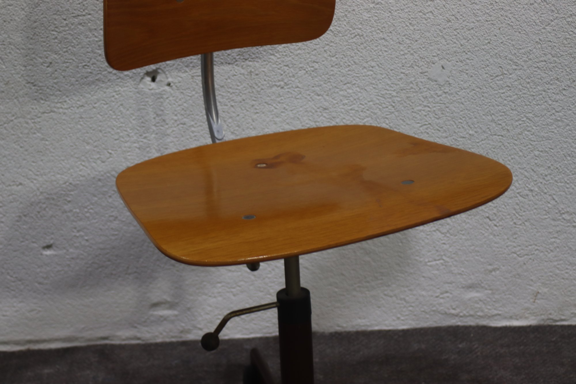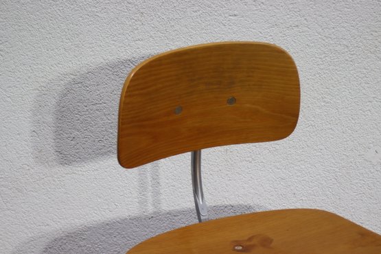 This vintage KEVI swivel office chair is a classic example of Danish mid-century modern design, featuring a minimalist wooden seat and backrest, adjustable height, and a sturdy metal base with casters for easy movement. Designed for functionality and style, this chair is a great addition to any workspace, home office, or collector's setup.