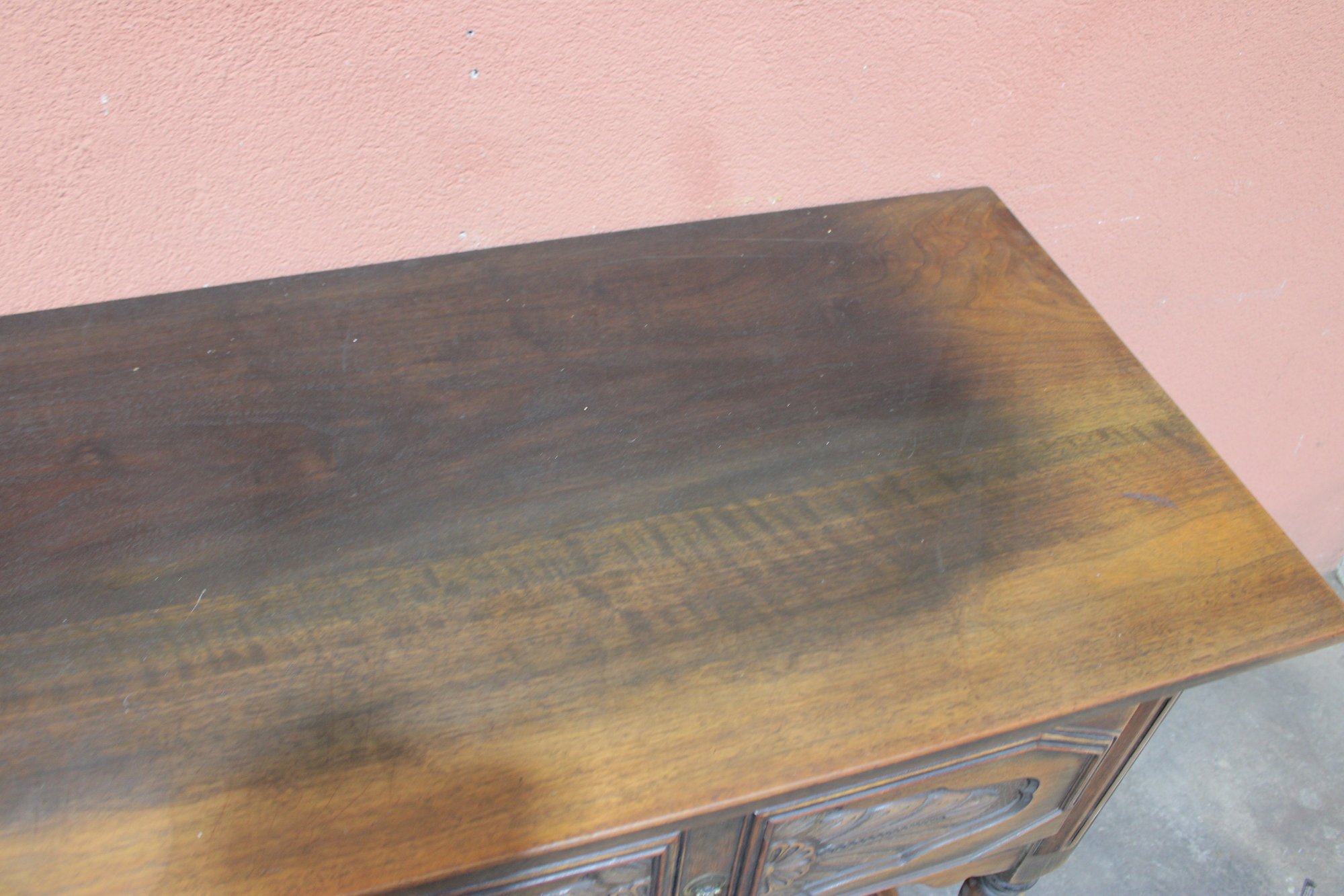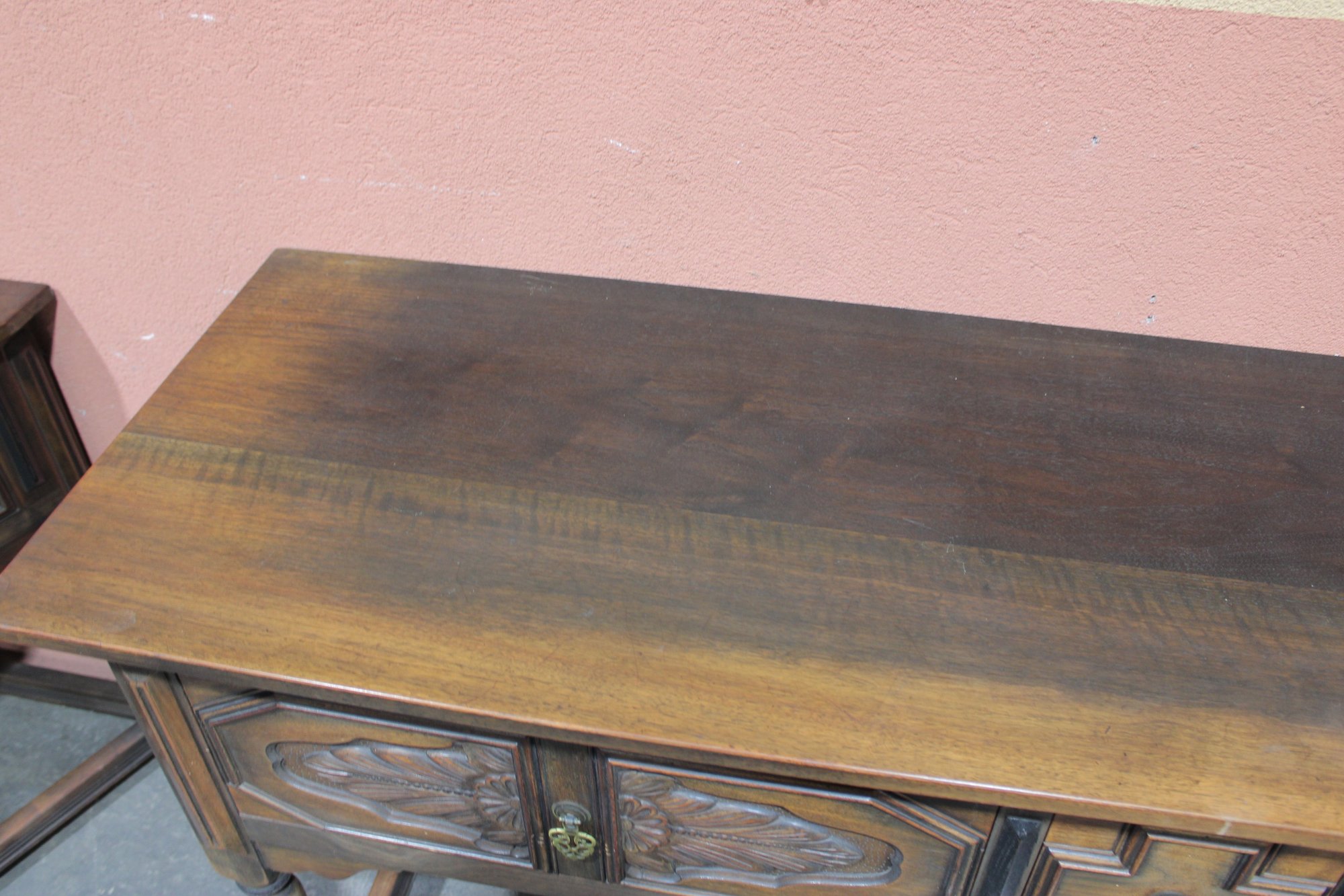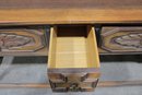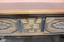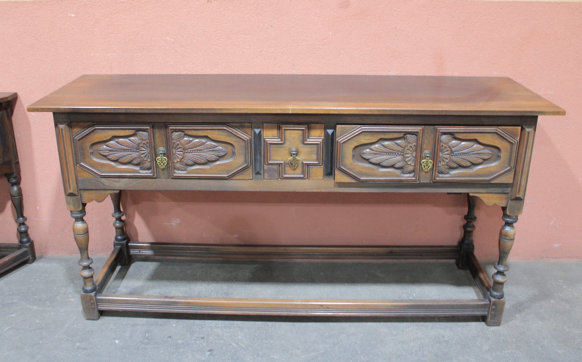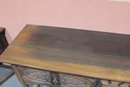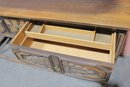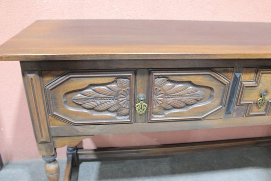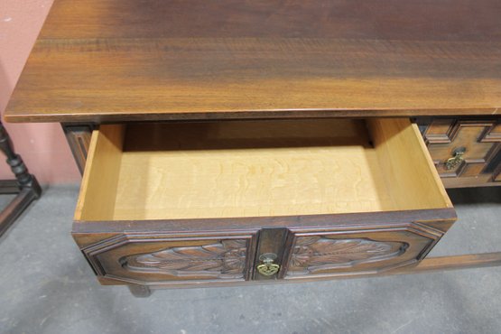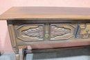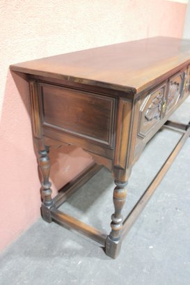 This impressive vintage console table offers both elegance and function, crafted from solid wood with beautifully carved front panels and classic turned legs. Measuring a substantial 72 inches wide, it makes a striking statement as a hallway console, dining room sideboard, sofa table, or entryway piece.