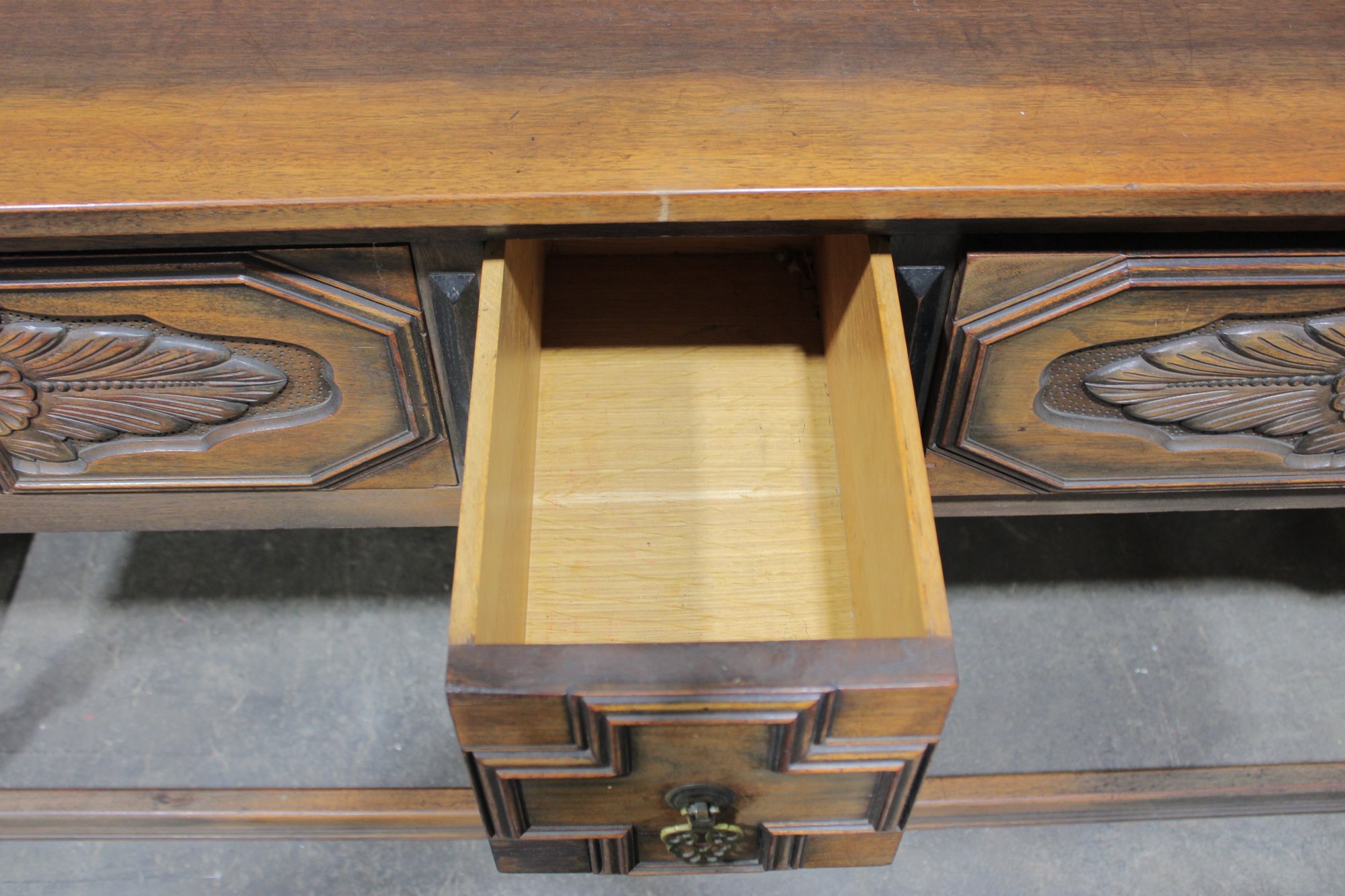 The front features decorative carved motifs and brass-tone hardware, with multiple drawers for convenient storage. Inside, the drawers include fitted compartments—perfect for organizing silverware, documents, or accessories. A full-length lower shelf adds even more display and storage space.