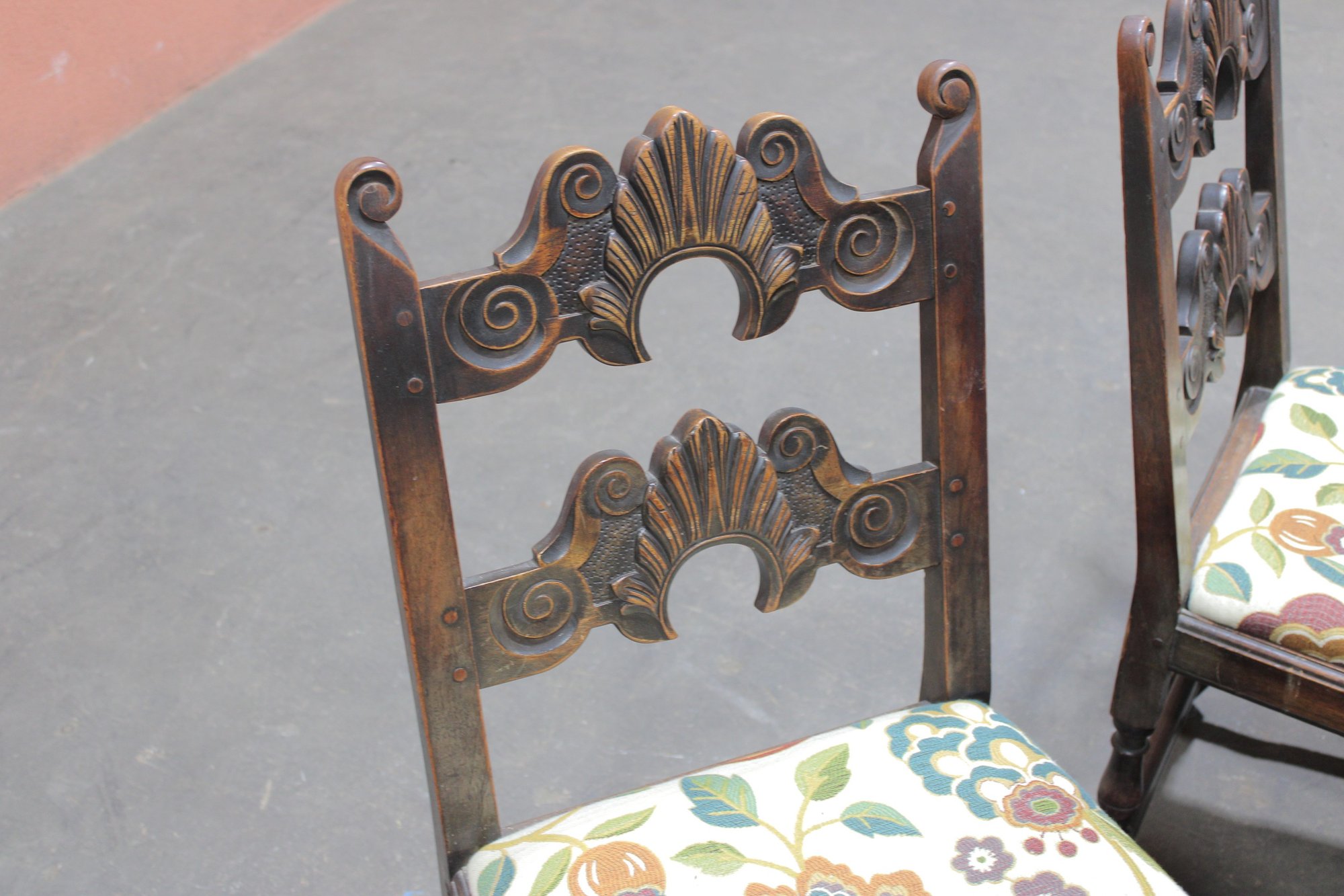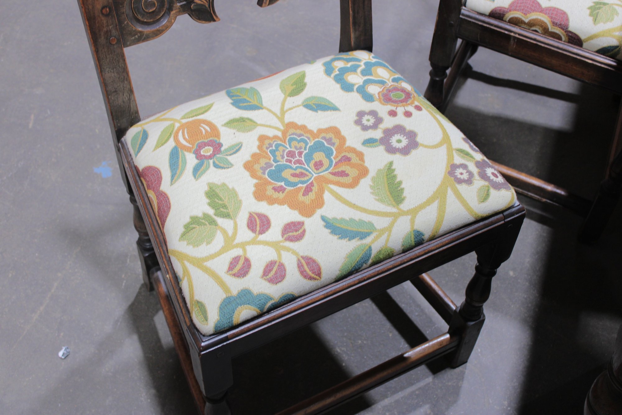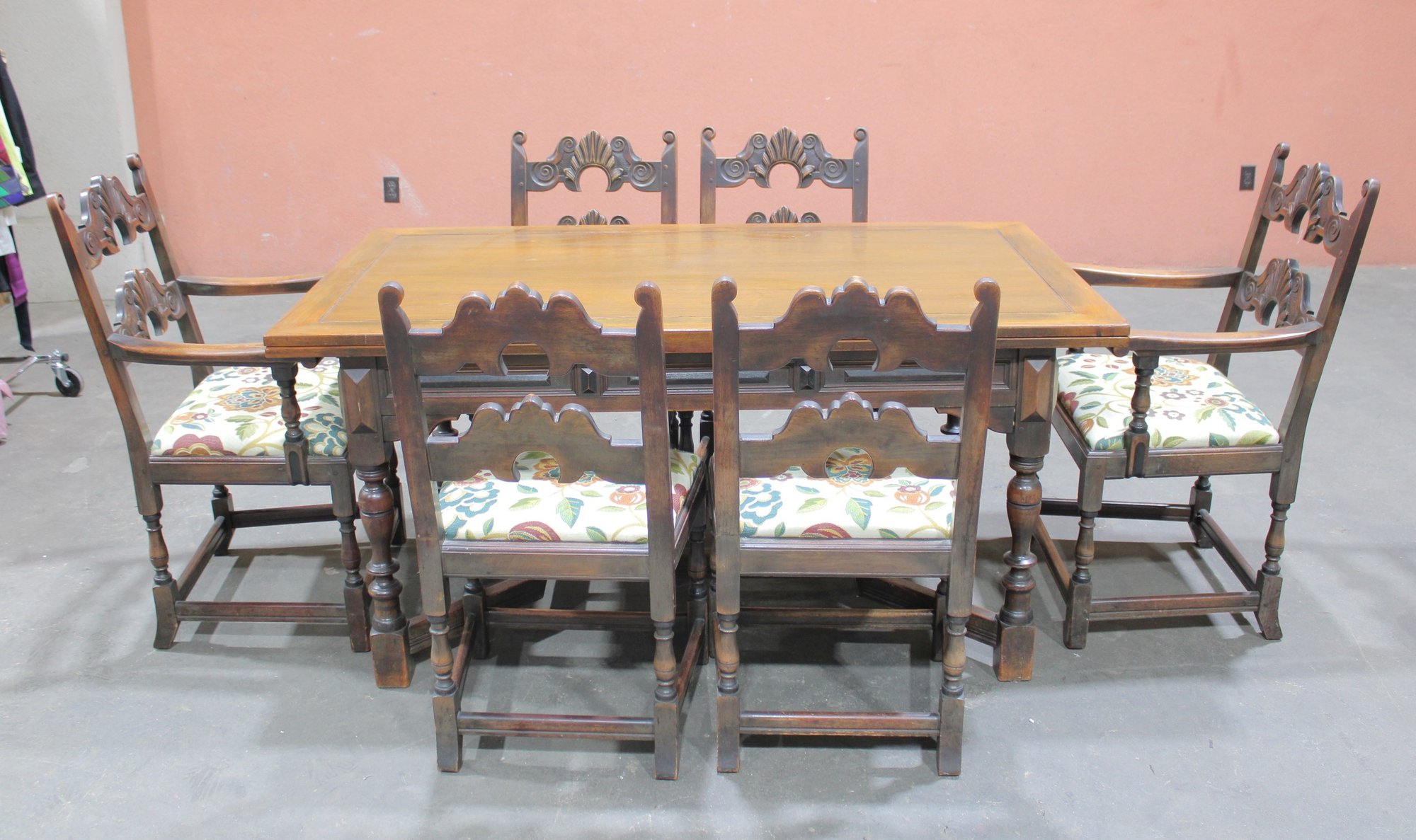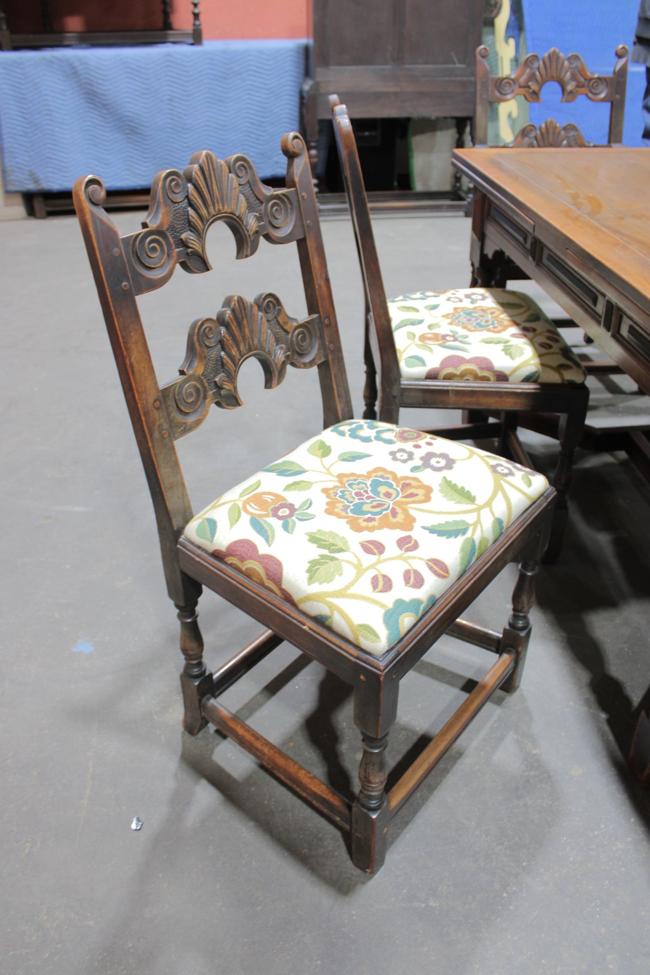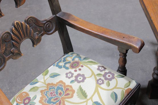 The chairs are beautifully detailed with ornate carved backs and arms, paired with upholstered seats in a colorful floral fabric that adds warmth and charm. The table is equally impressive, with a thick solid wood top, paneled apron, and sturdy trestle-style base with turned legs and stretchers.
