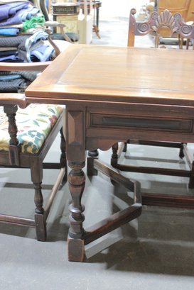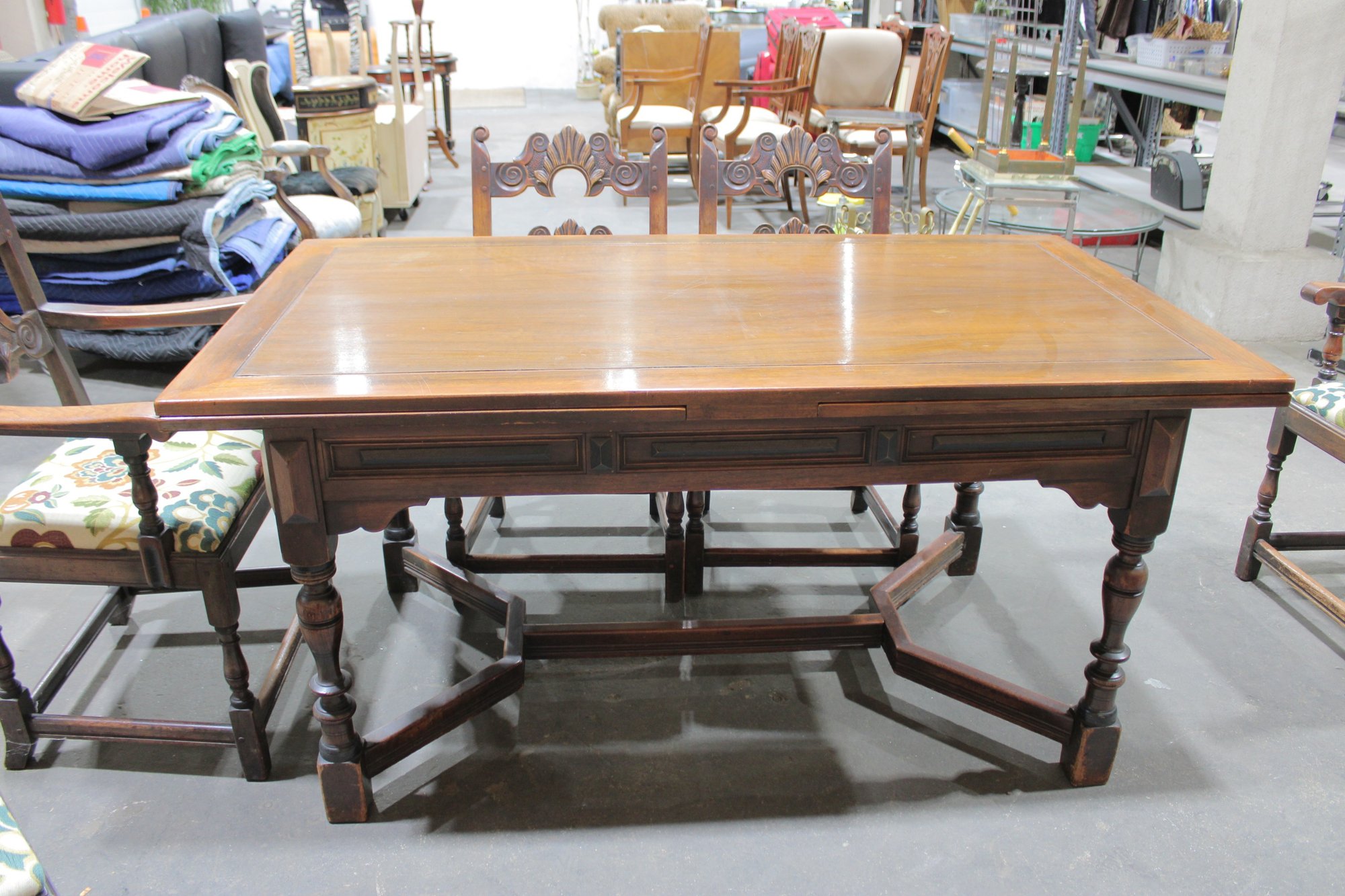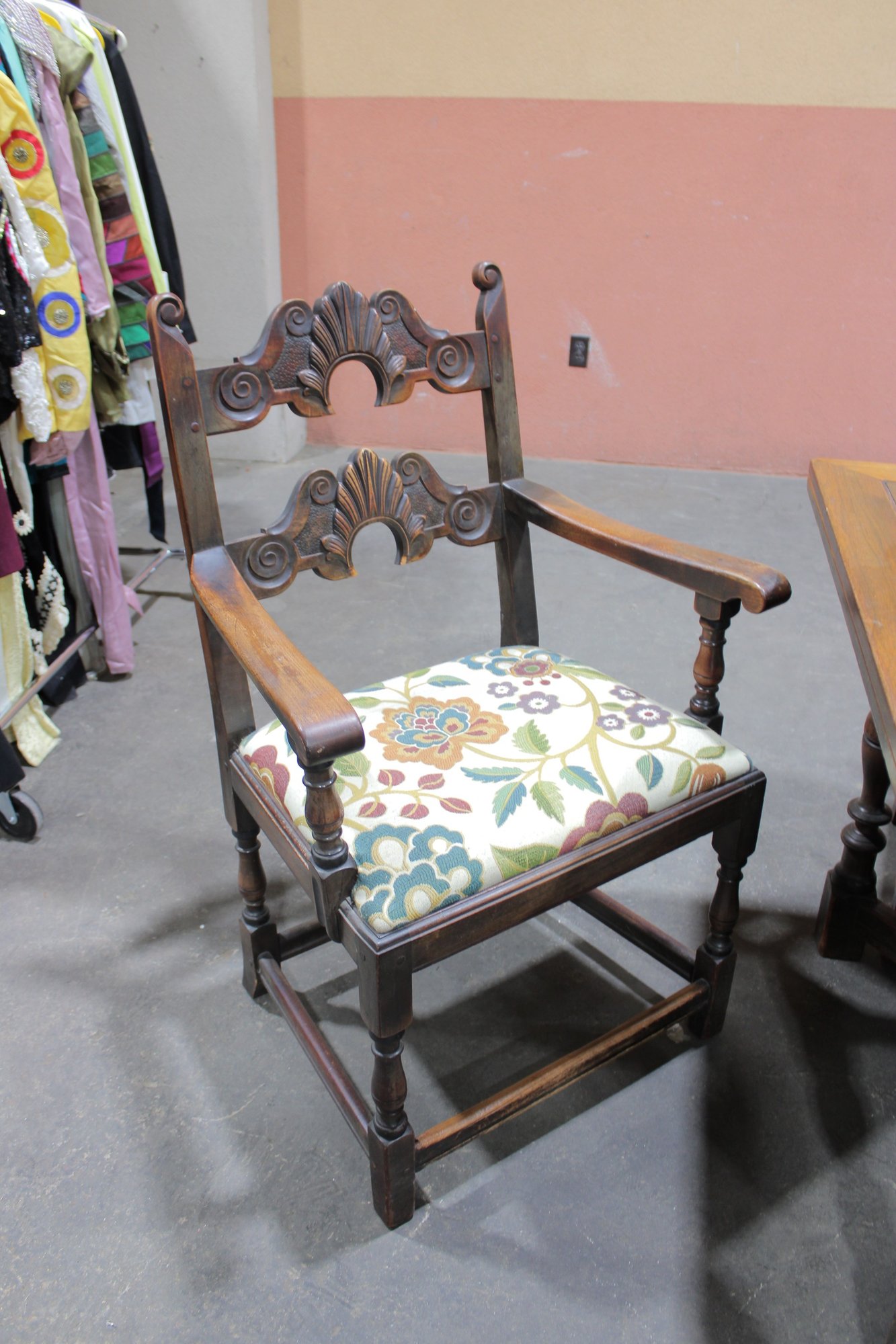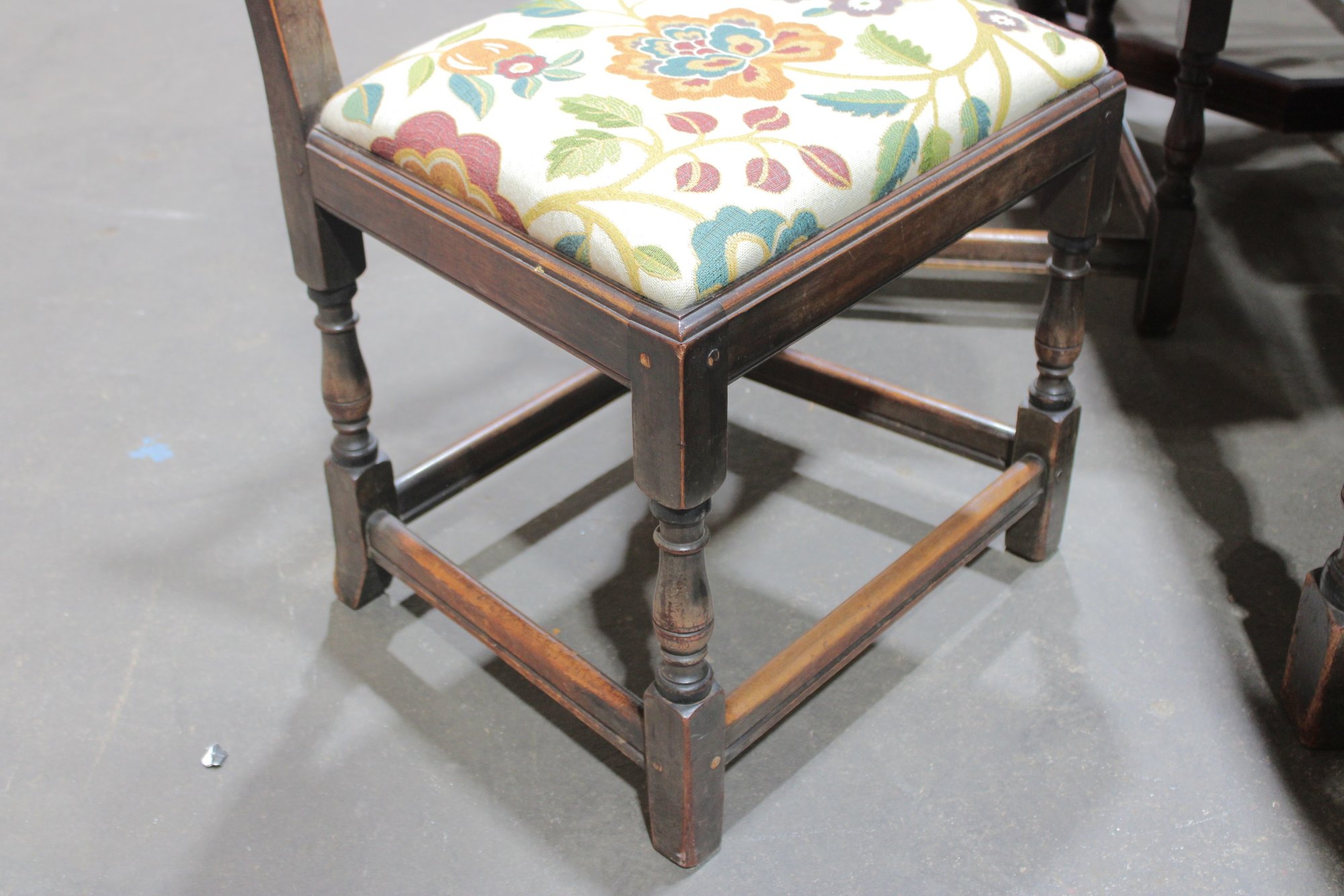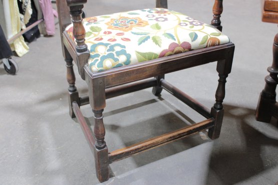 The chairs are beautifully detailed with ornate carved backs and arms, paired with upholstered seats in a colorful floral fabric that adds warmth and charm. The table is equally impressive, with a thick solid wood top, paneled apron, and sturdy trestle-style base with turned legs and stretchers.