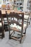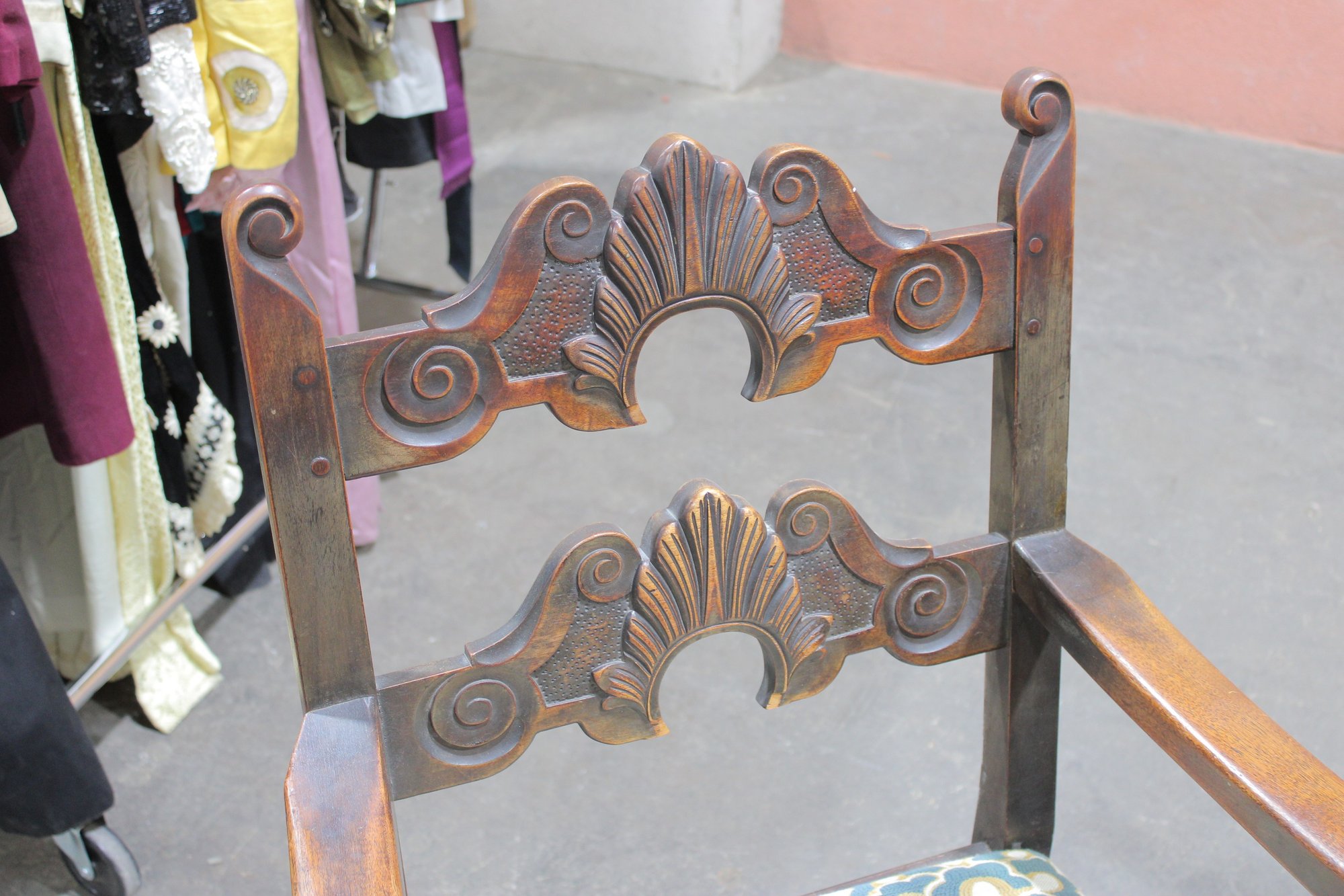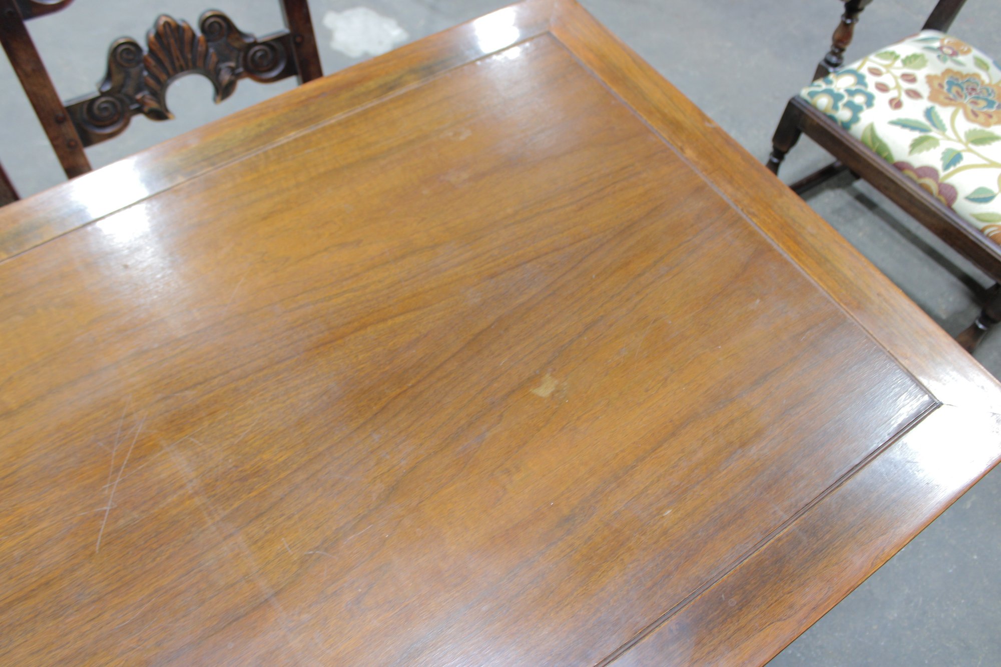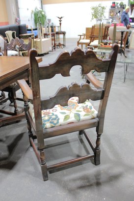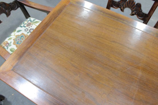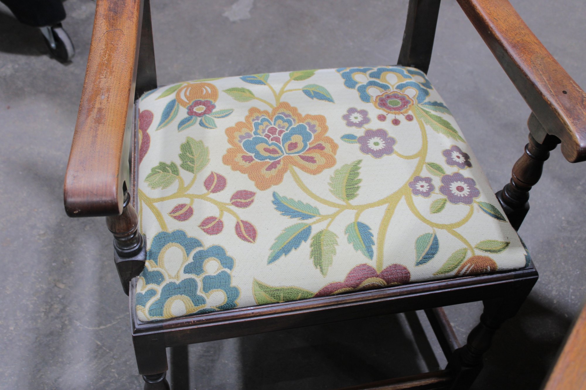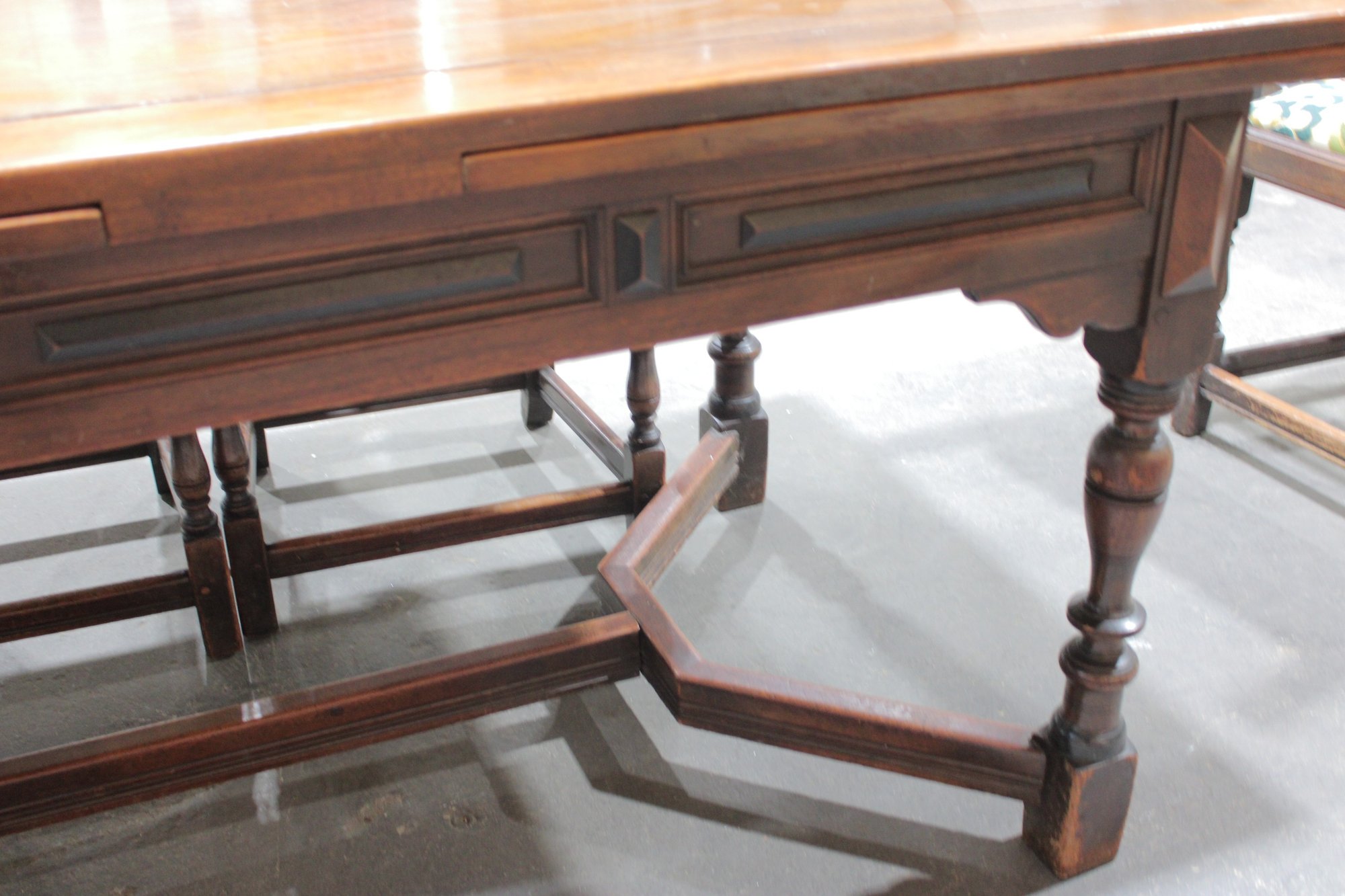 The chairs are beautifully detailed with ornate carved backs and arms, paired with upholstered seats in a colorful floral fabric that adds warmth and charm. The table is equally impressive, with a thick solid wood top, paneled apron, and sturdy trestle-style base with turned legs and stretchers.