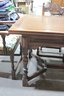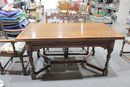 This striking vintage dining set showcases bold craftsmanship and timeless character. Featuring a substantial solid wood dining table and six matching carved chairs, this set reflects classic Spanish Revival / Mediterranean styling with dramatic scrollwork, shell motifs, and turned legs.