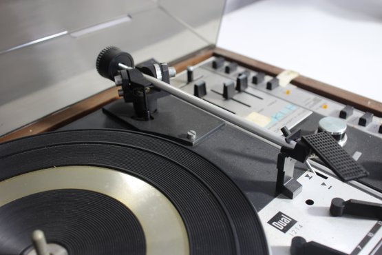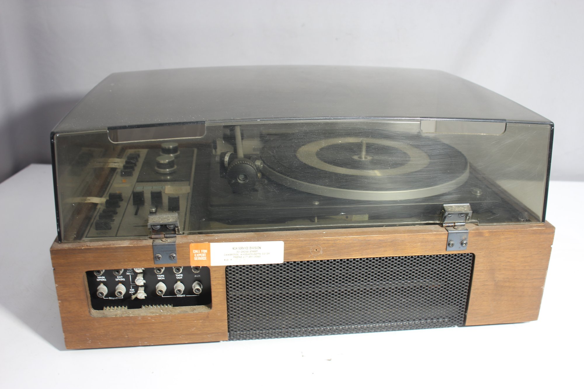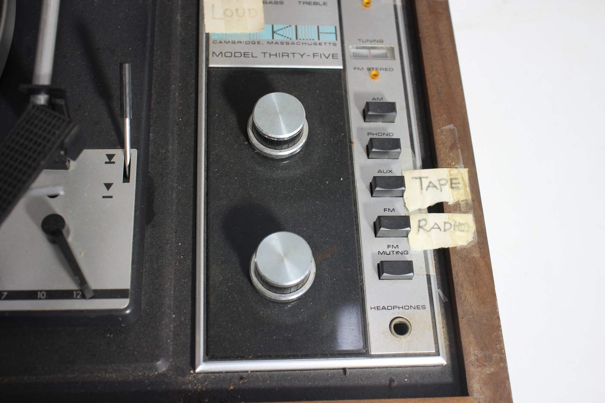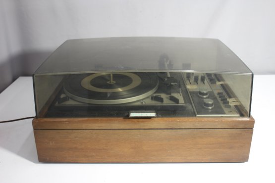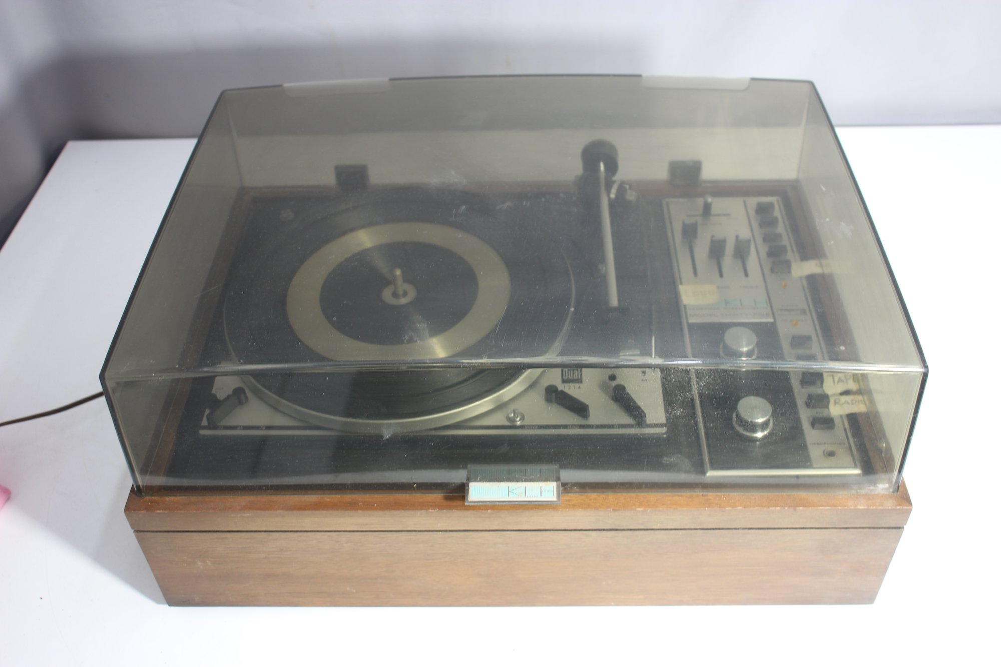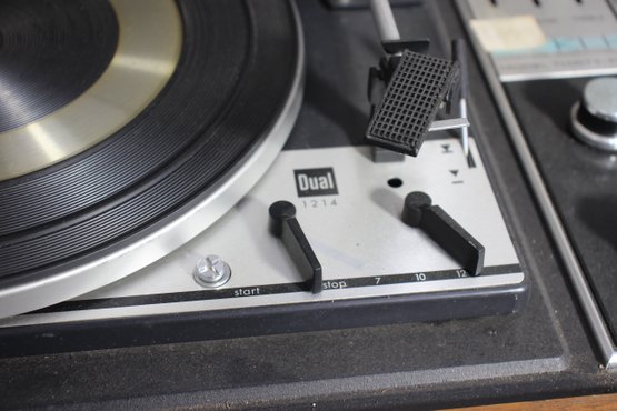 a vintage KLH Model Thirty-Five turntable and receiver unit, combined with a Dual 1214 turntable. The classic wooden casing and integrated controls reflect mid-century modern audio design. The unit includes sliders for balance, bass, and treble control, along with various input options for radio, tape, and auxiliary use.