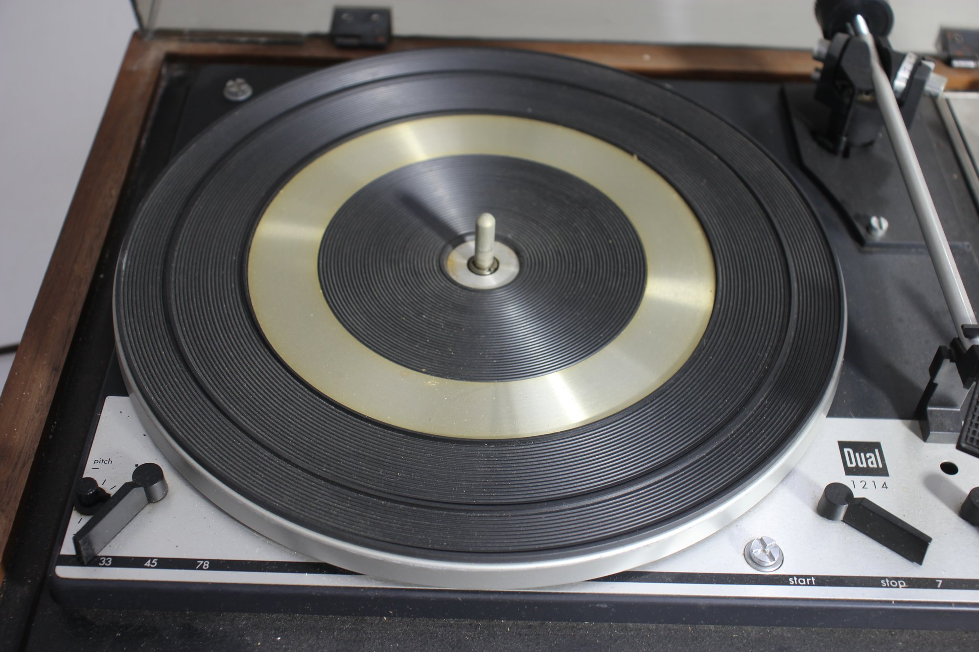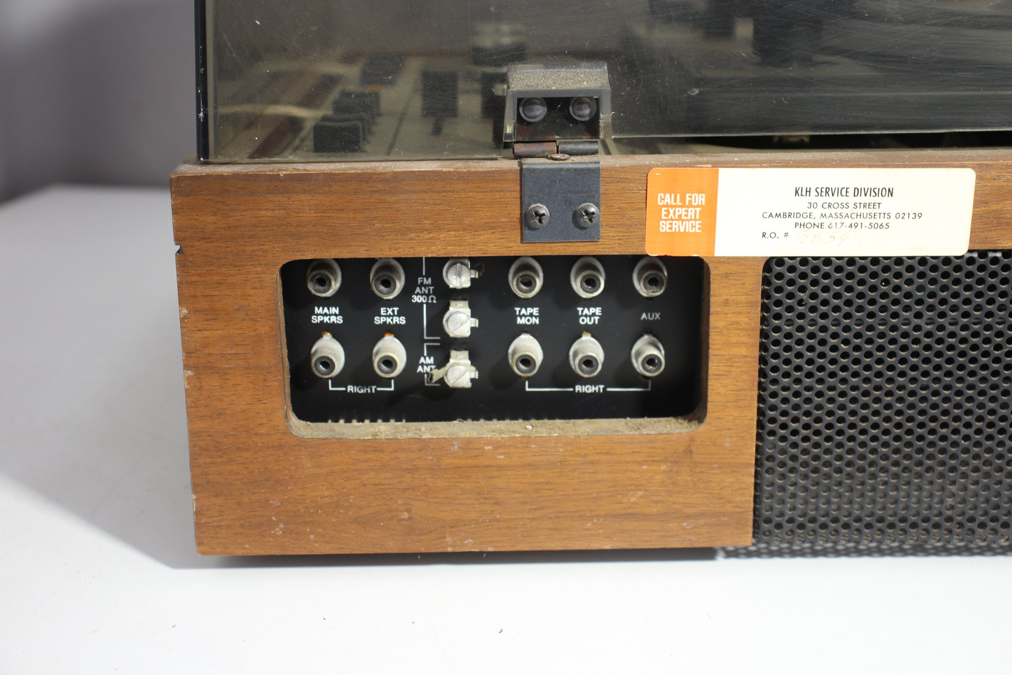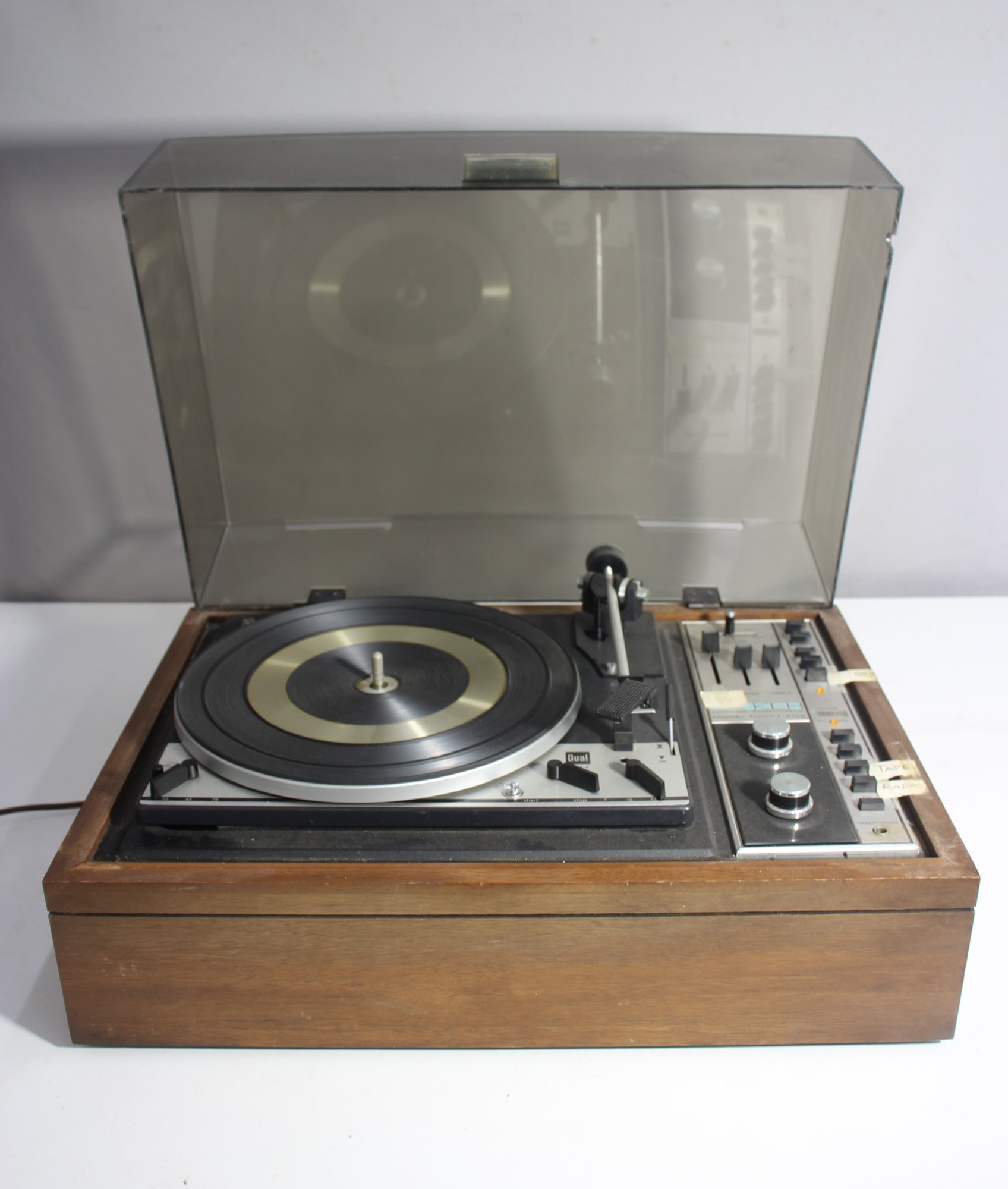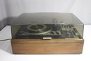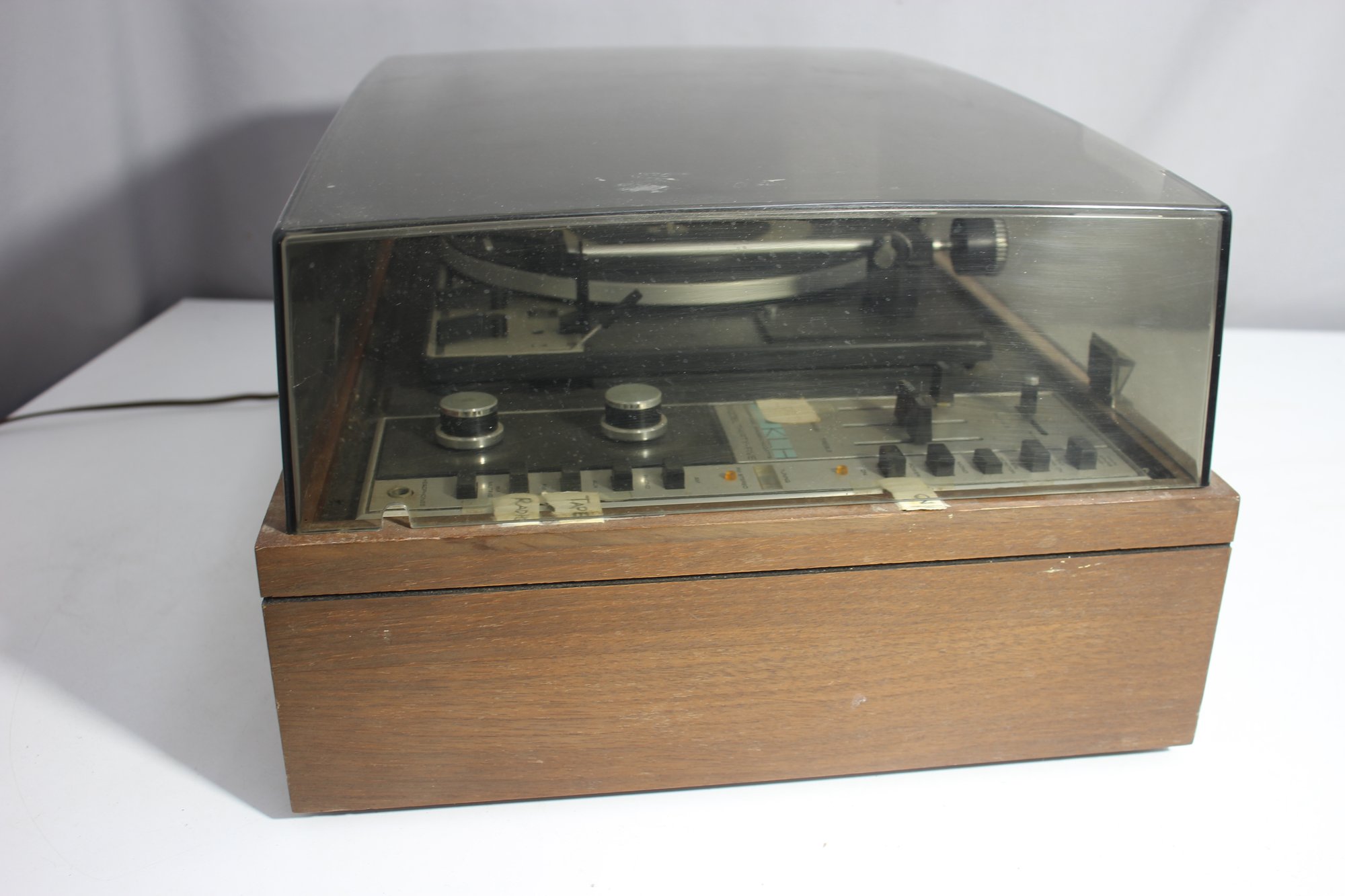 a vintage KLH Model Thirty-Five turntable and receiver unit, combined with a Dual 1214 turntable. The classic wooden casing and integrated controls reflect mid-century modern audio design. The unit includes sliders for balance, bass, and treble control, along with various input options for radio, tape, and auxiliary use.