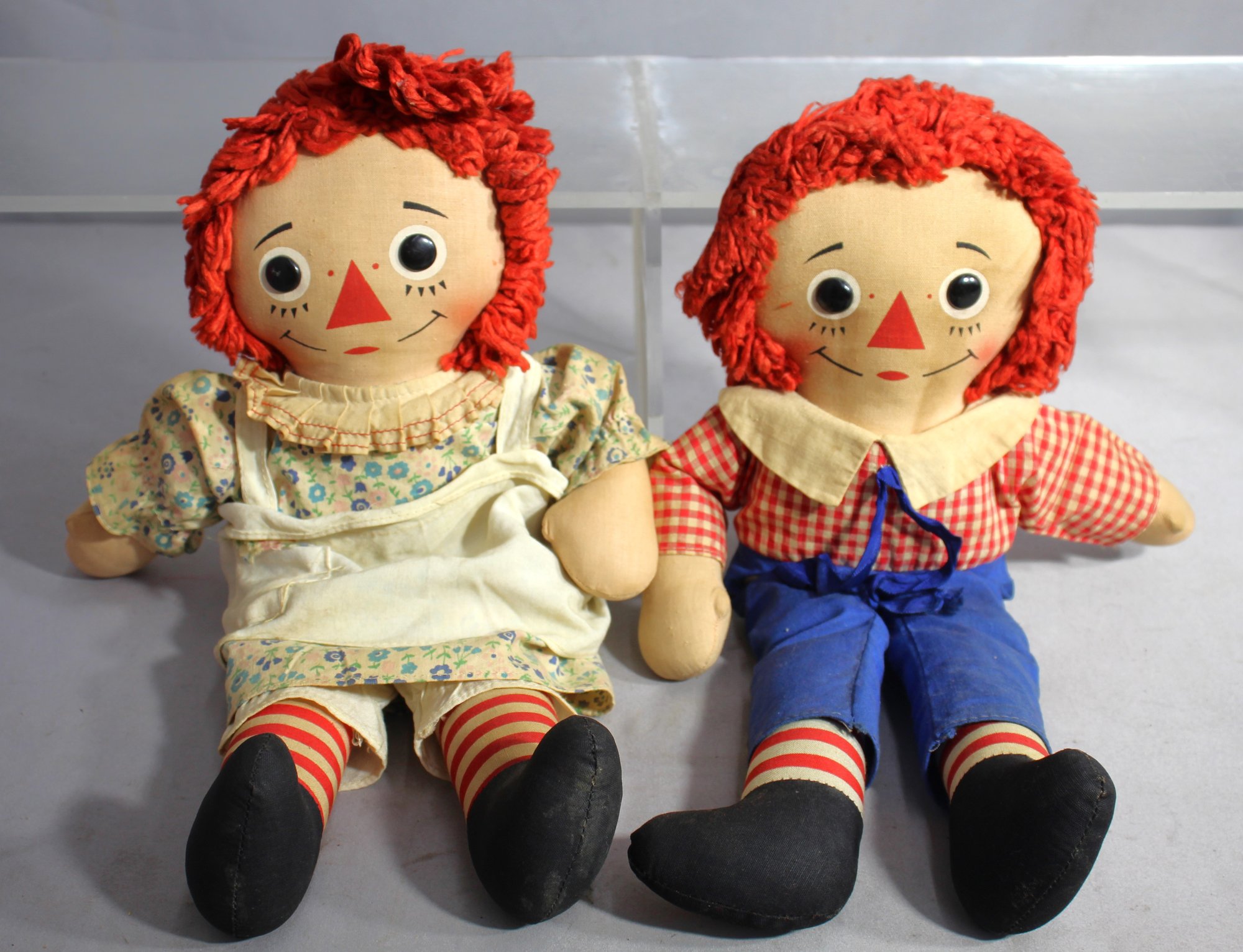 this delightful pair of vintage Raggedy Ann and Andy dolls by Knickerbocker Toy Company. These classic dolls, featuring their signature red yarn hair and timeless outfits, are perfect for collectors and fans of vintage toys alike.