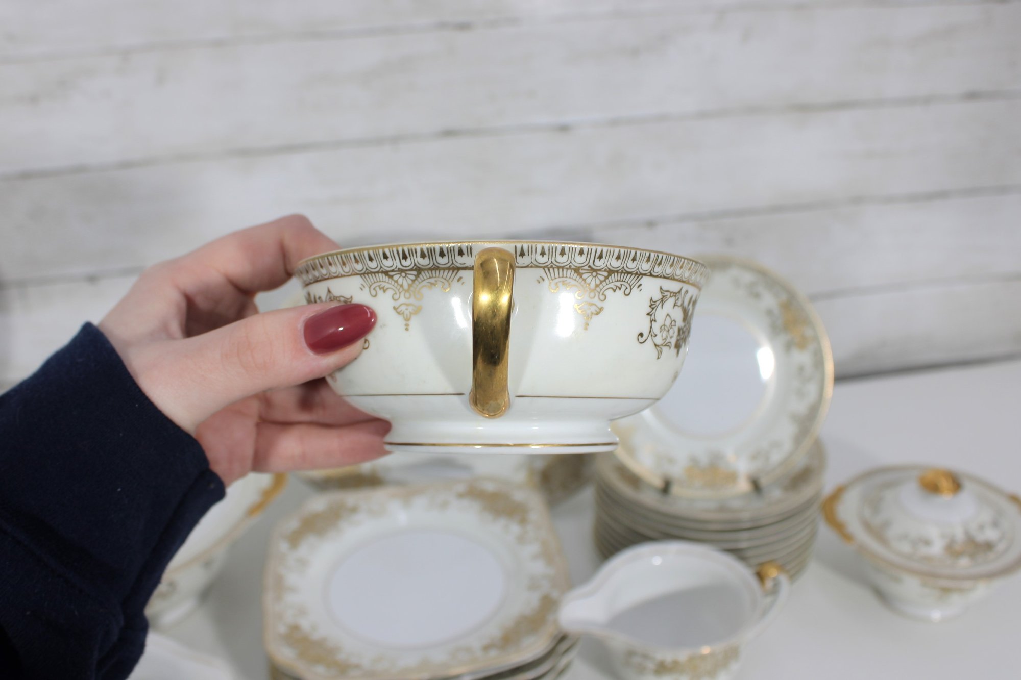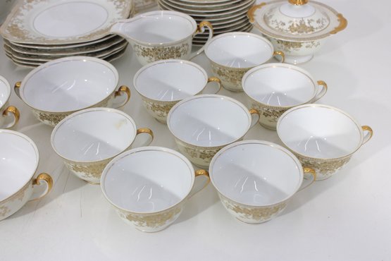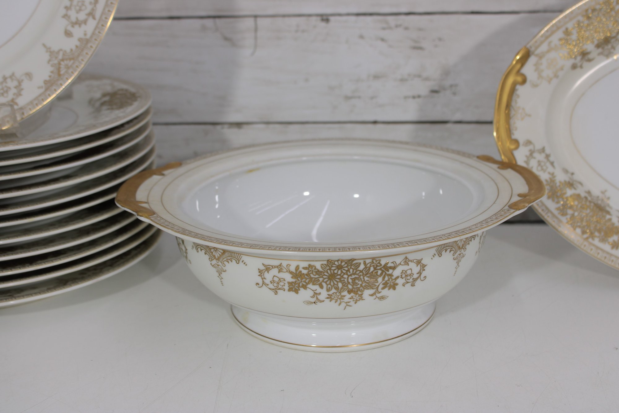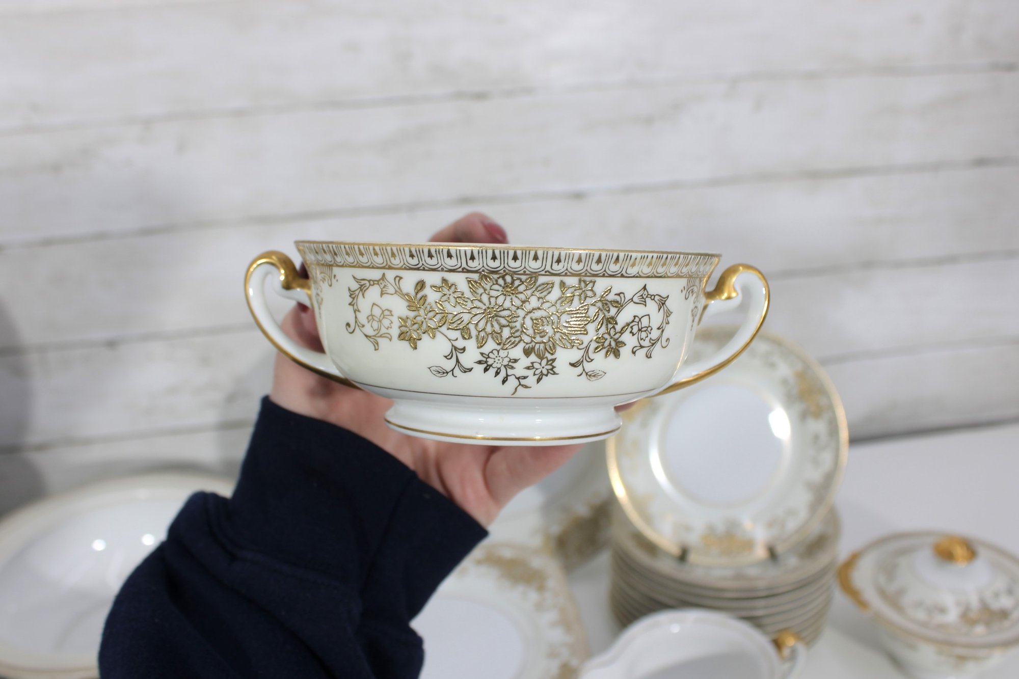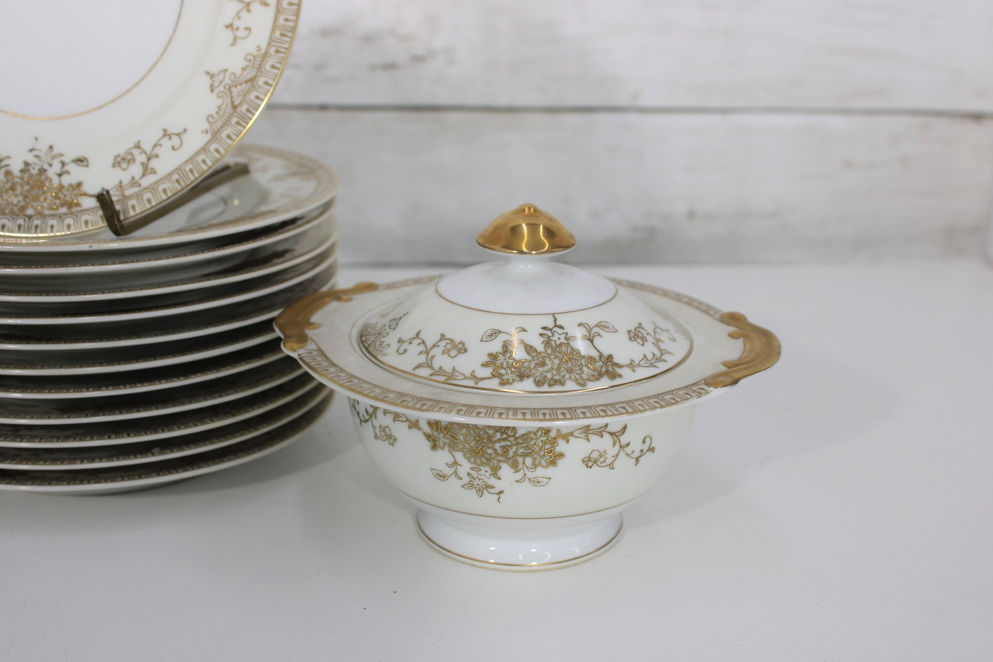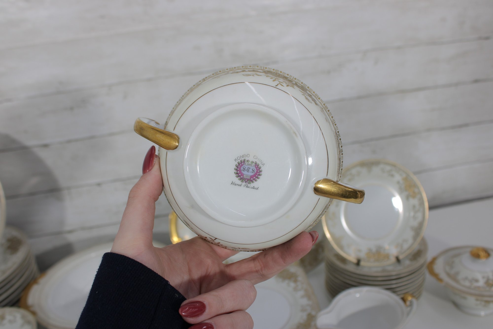 Beautiful vintage Kongo China partial dinnerware set featuring an elegant white ground with intricate gold floral detailing and rich gilt trim accents.