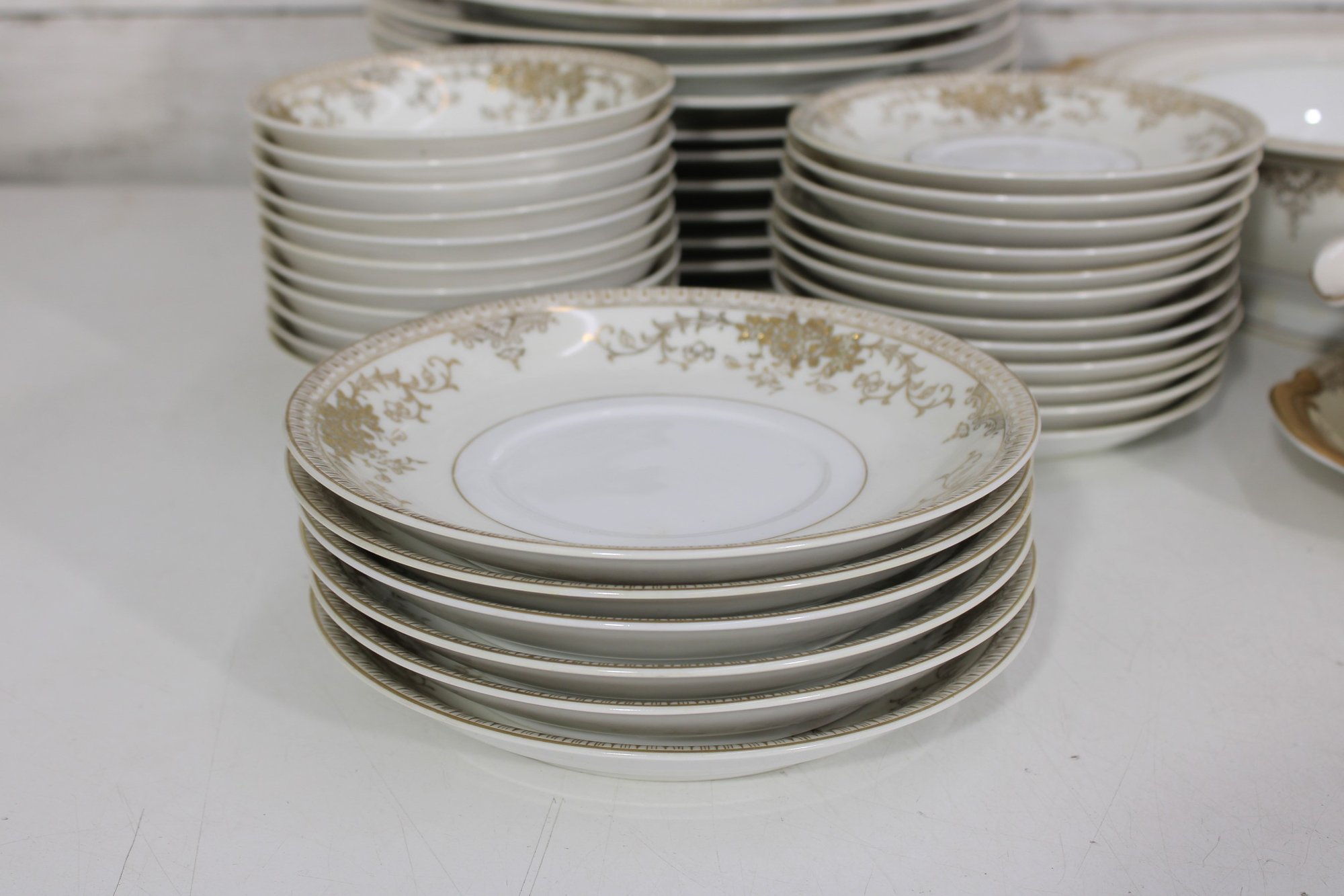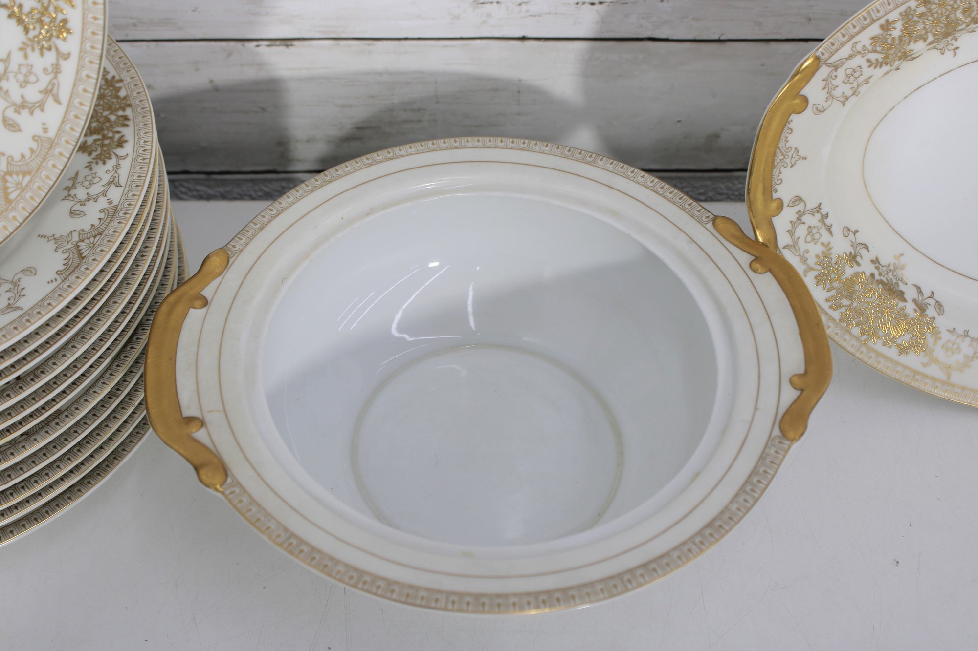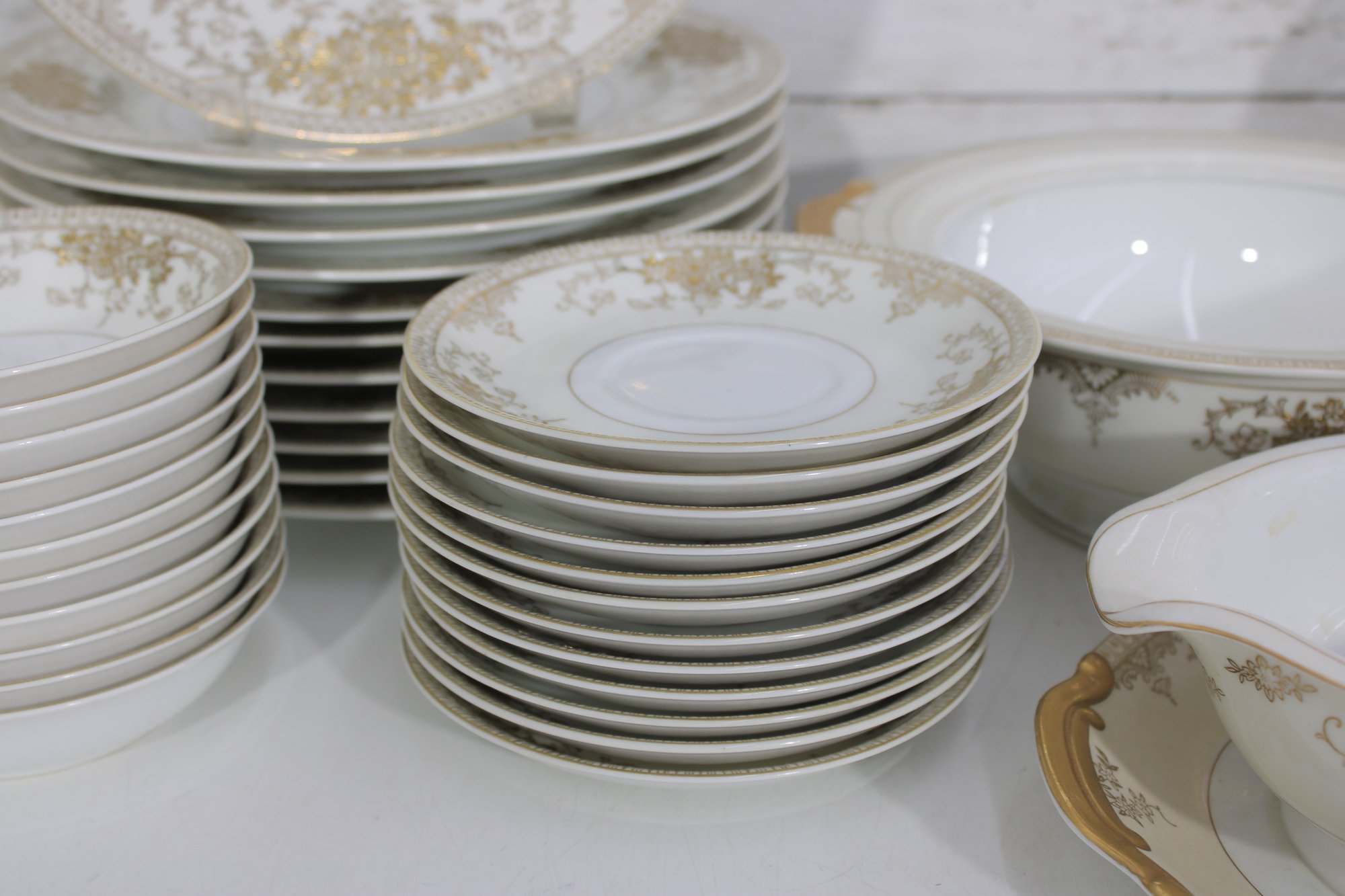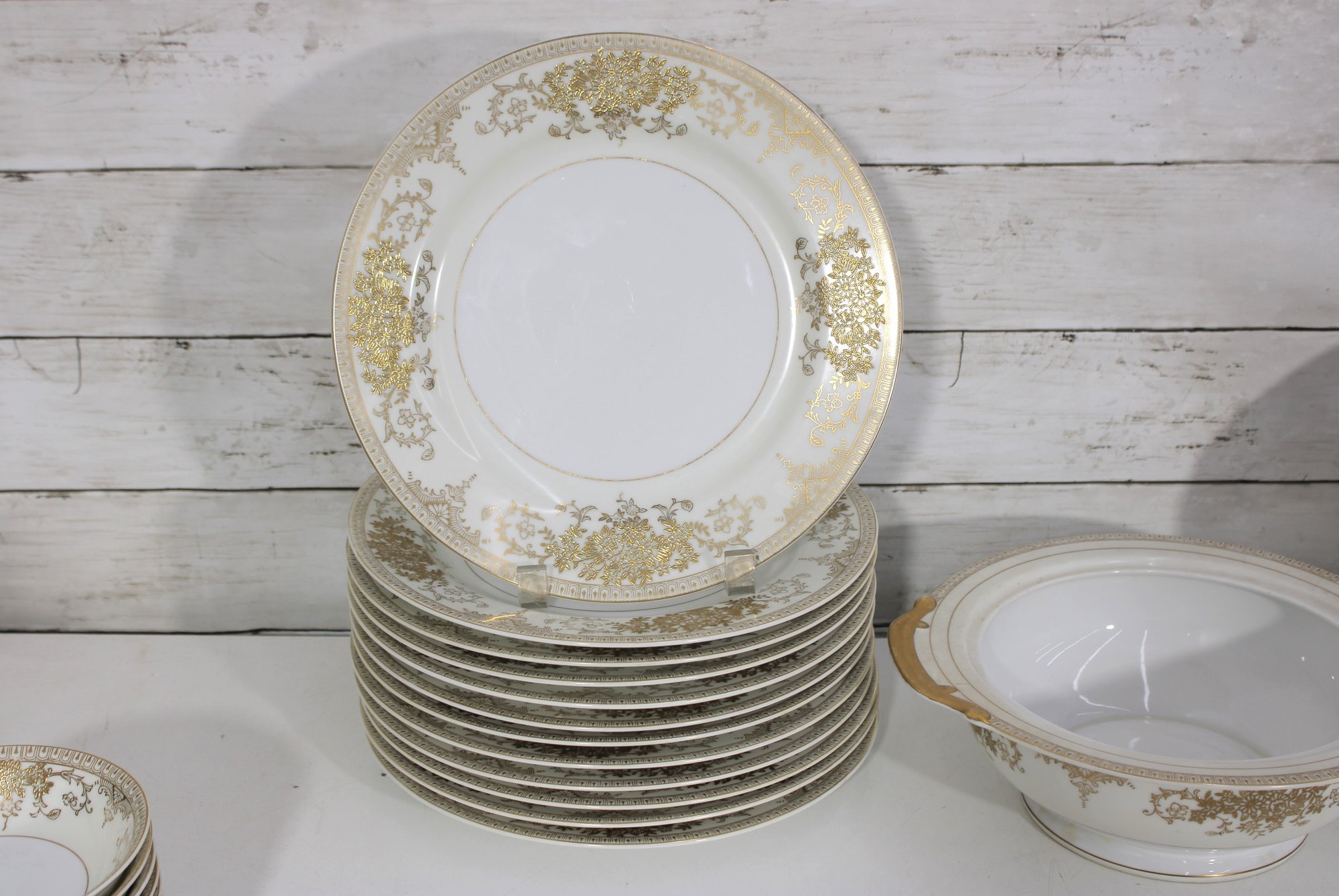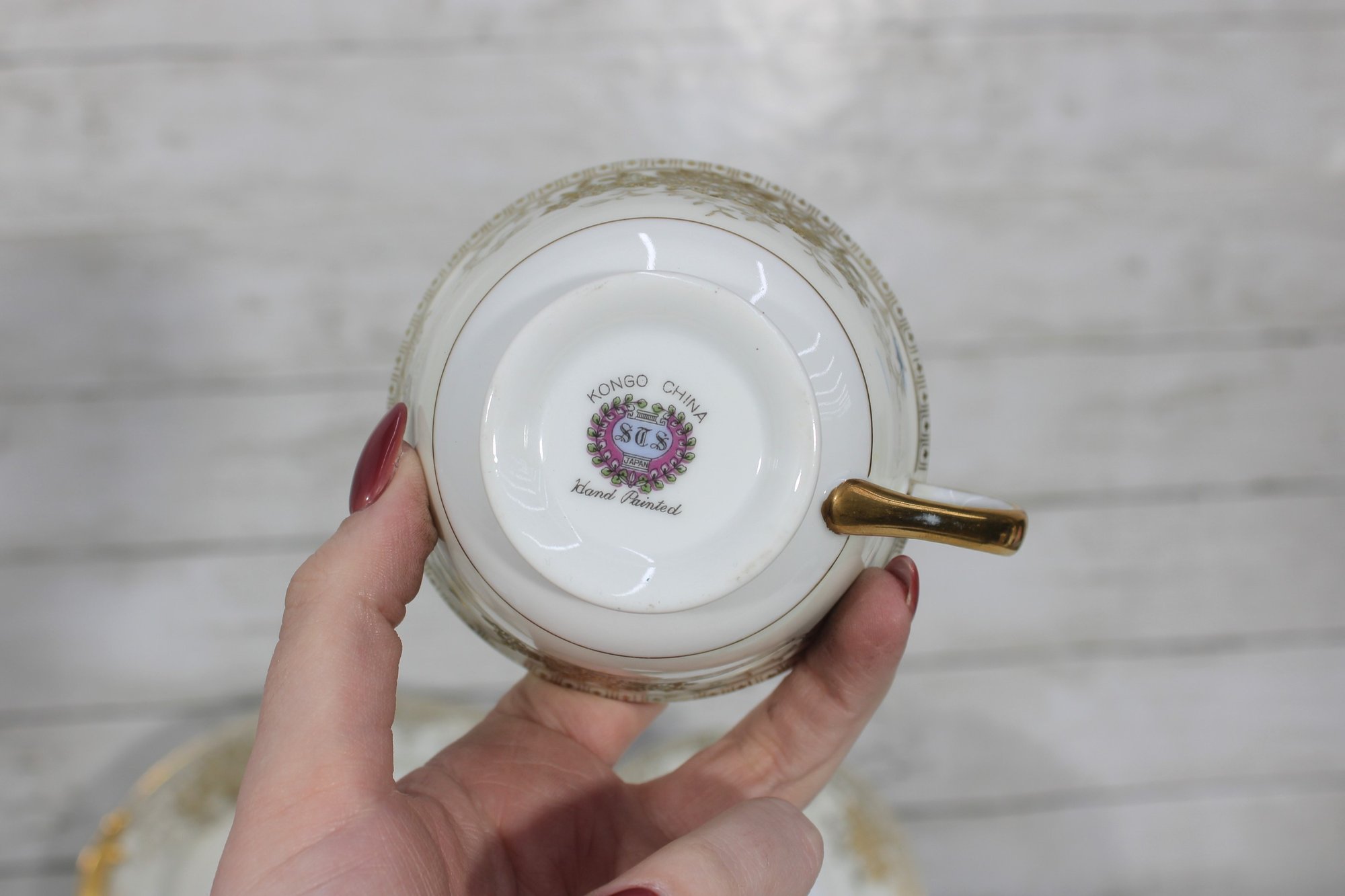 Beautiful vintage Kongo China partial dinnerware set featuring an elegant white ground with intricate gold floral detailing and rich gilt trim accents.