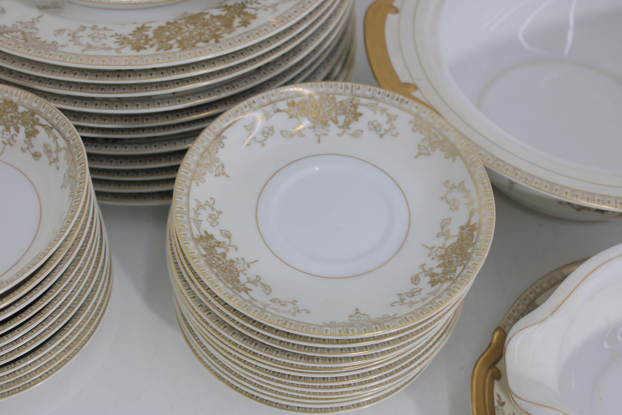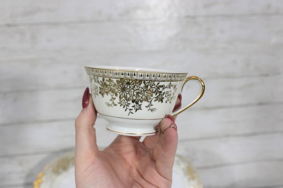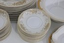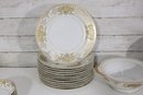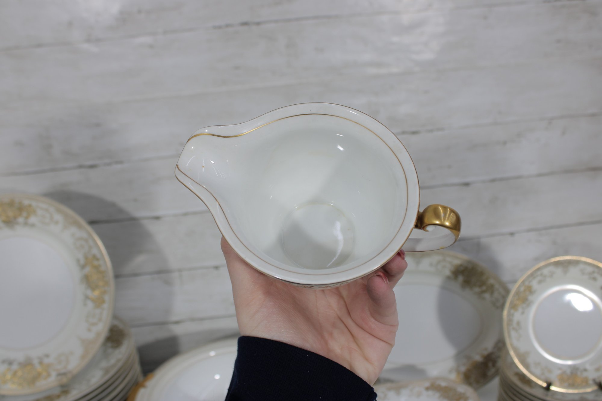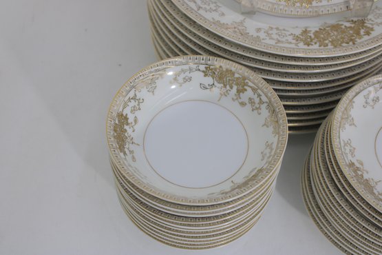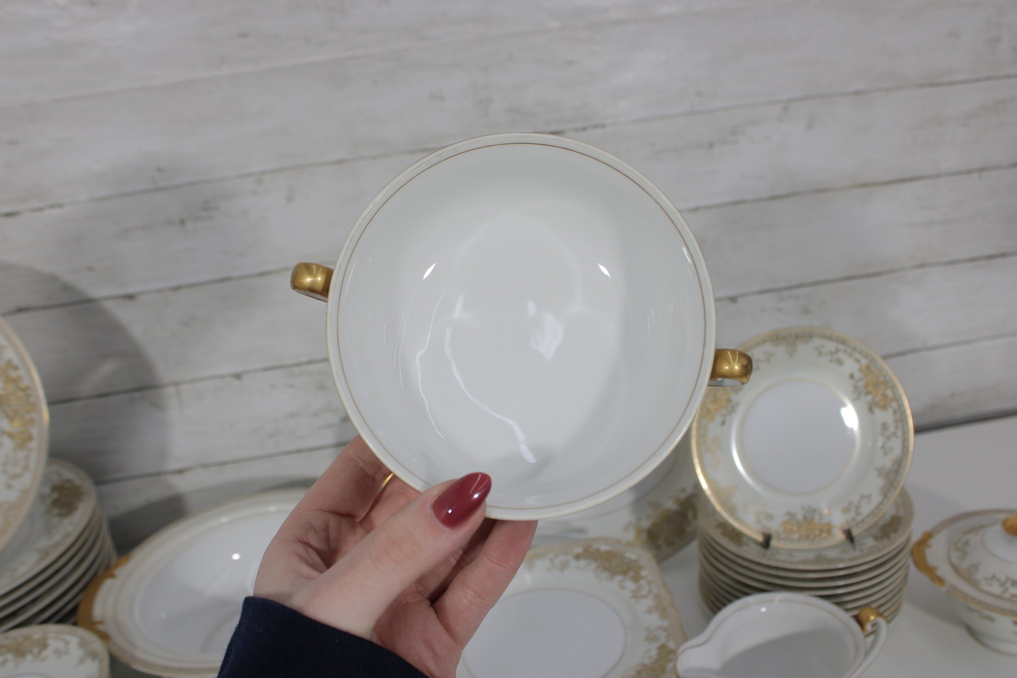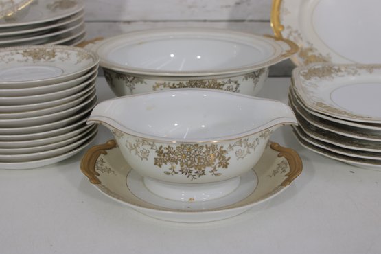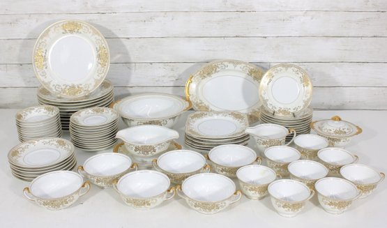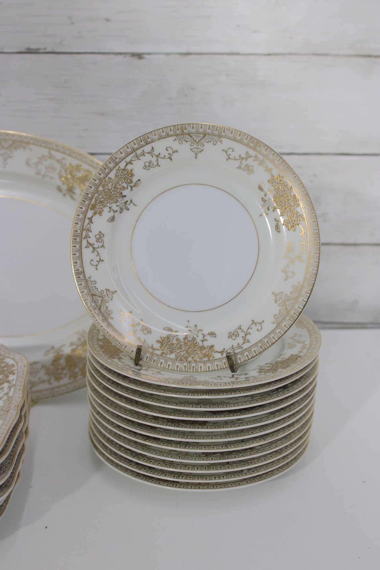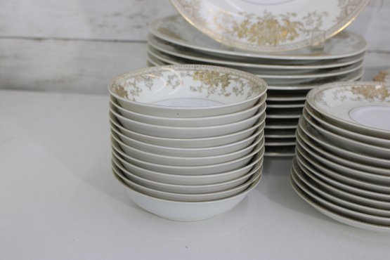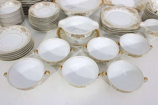 Beautiful vintage Kongo China partial dinnerware set featuring an elegant white ground with intricate gold floral detailing and rich gilt trim accents.