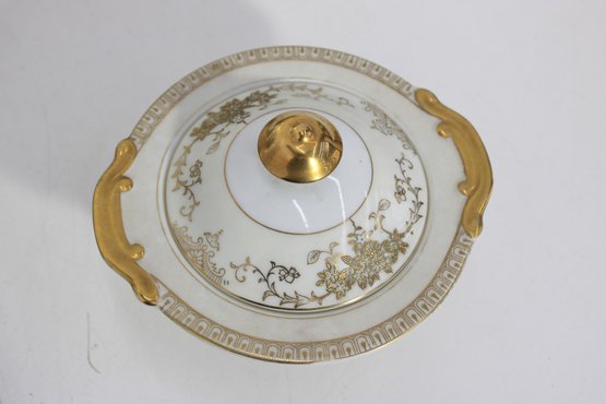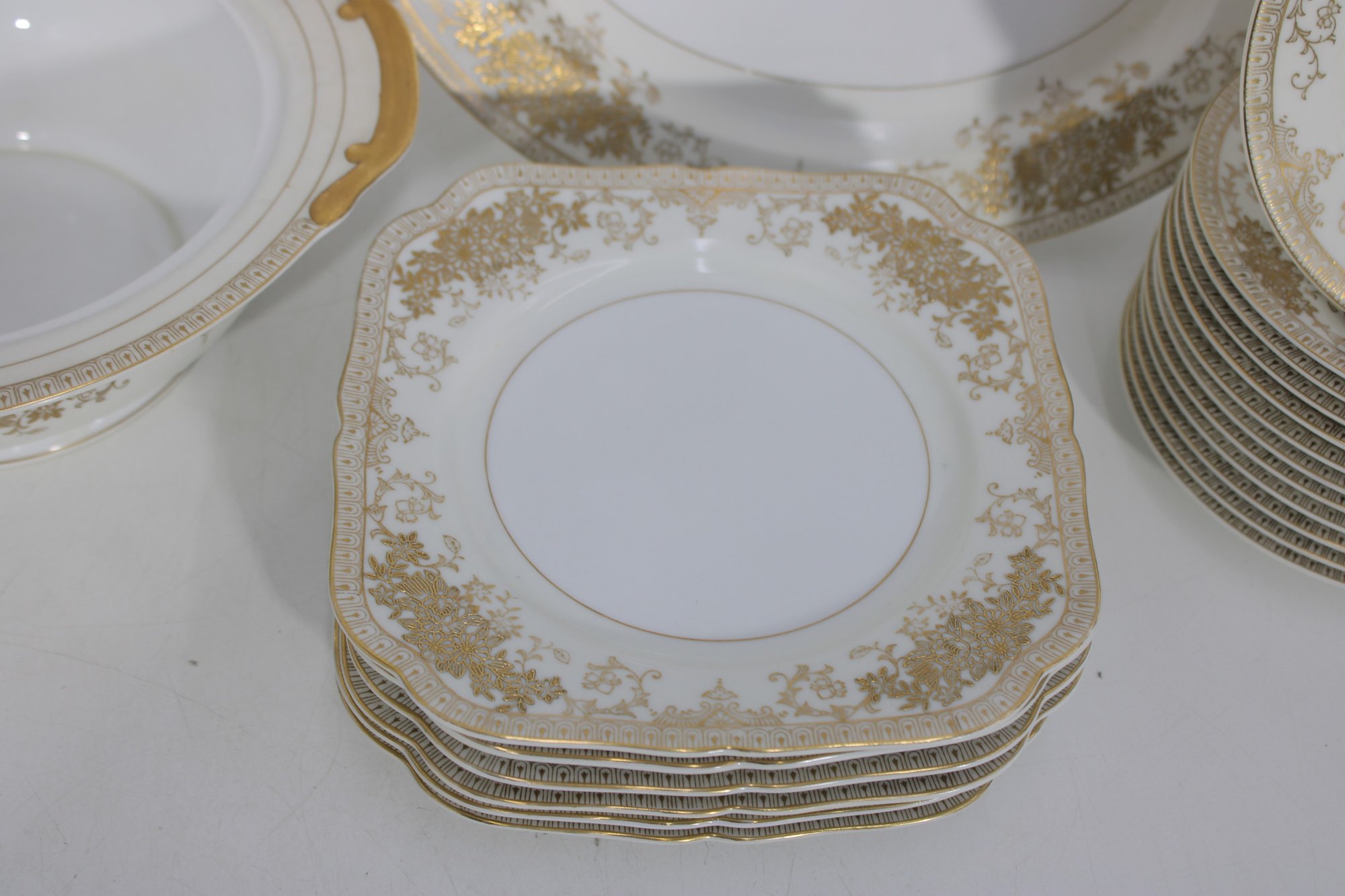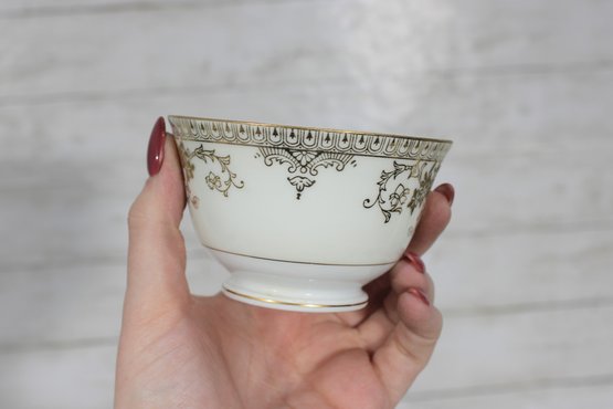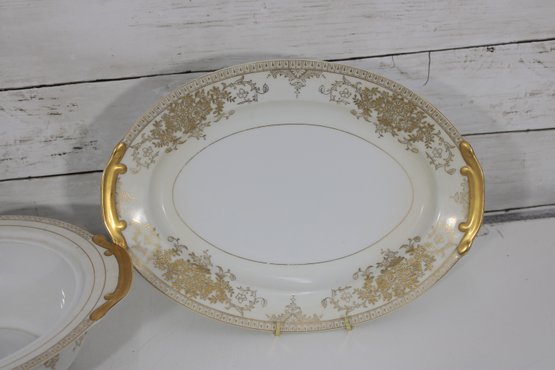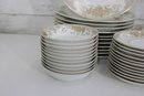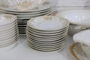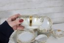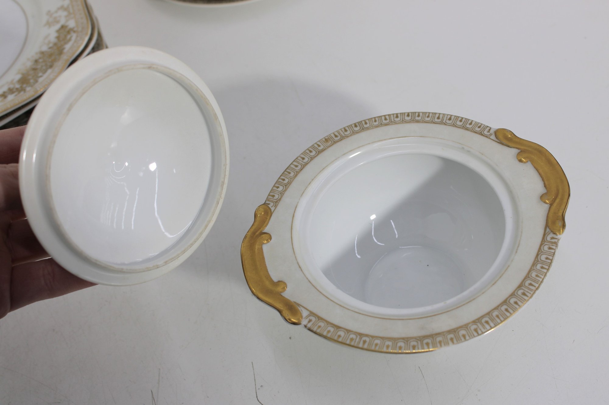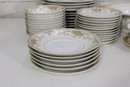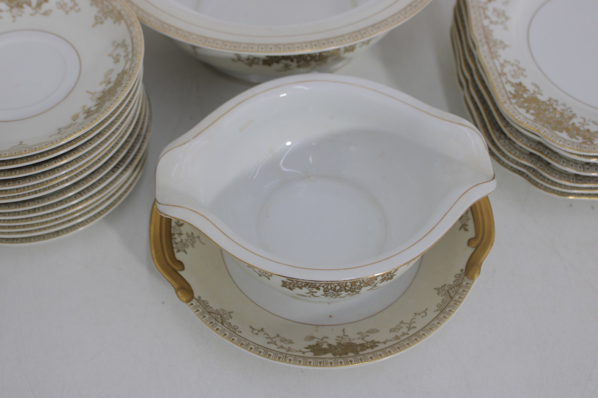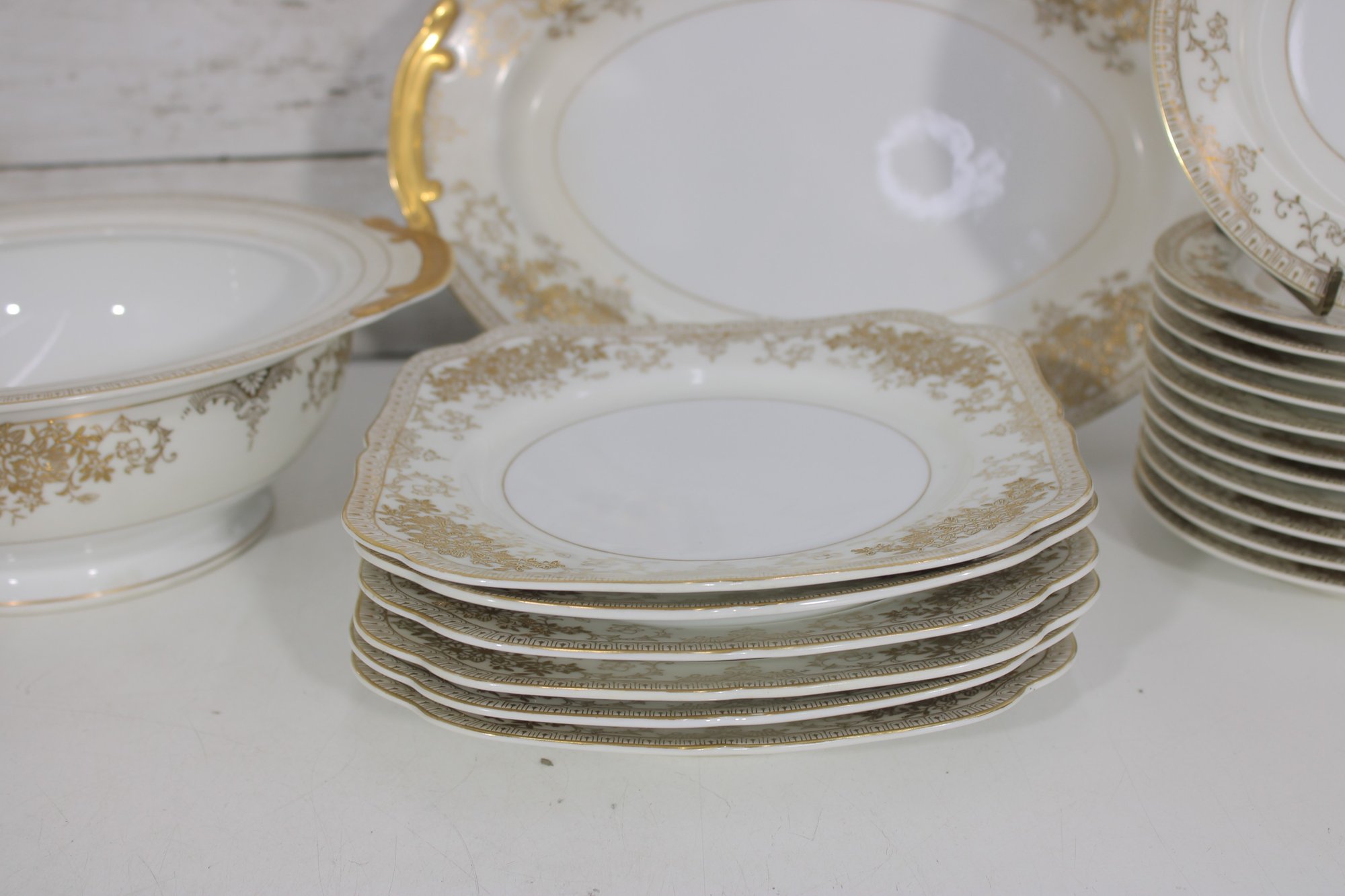 Beautiful vintage Kongo China partial dinnerware set featuring an elegant white ground with intricate gold floral detailing and rich gilt trim accents.
