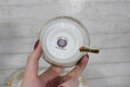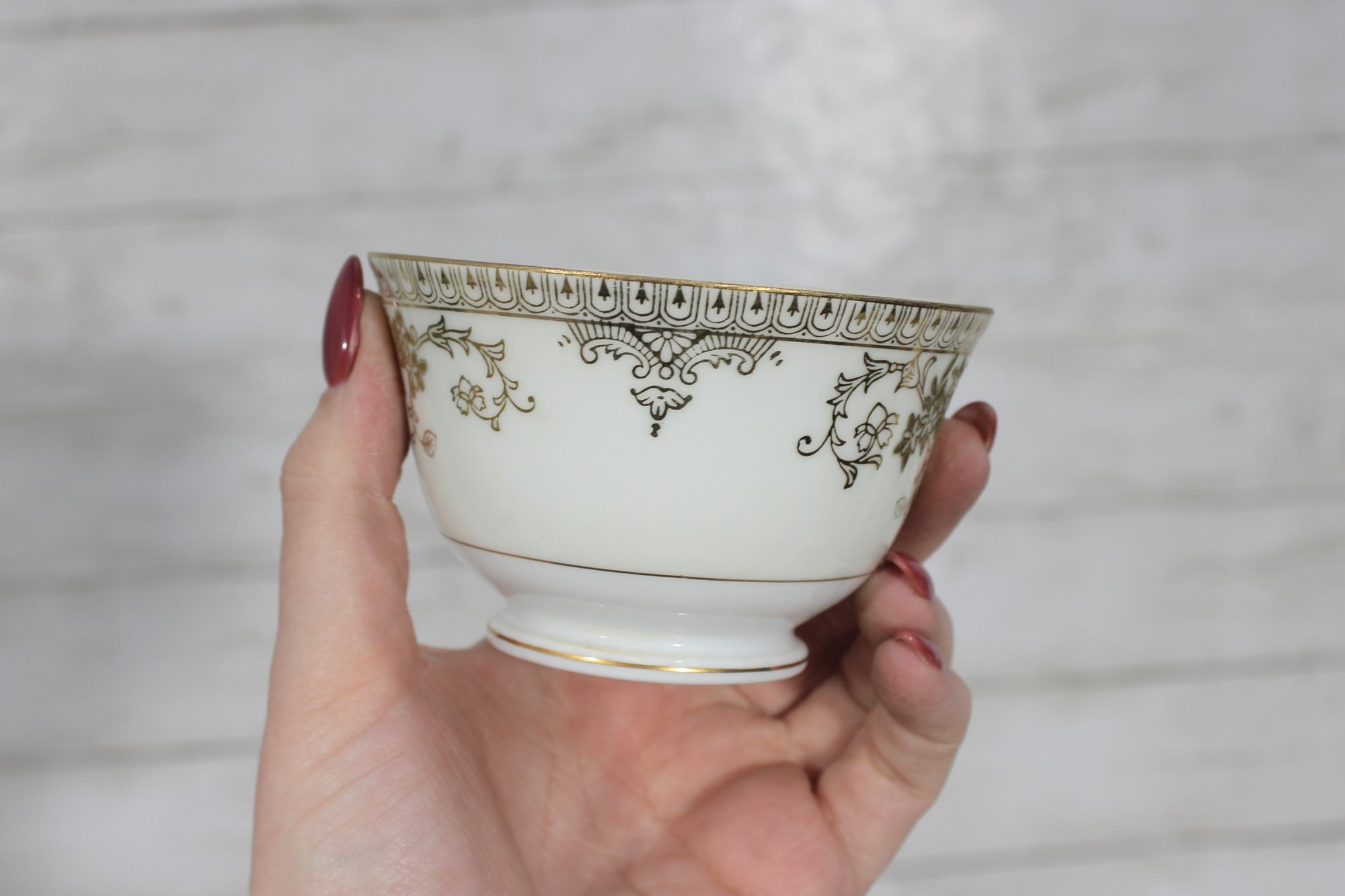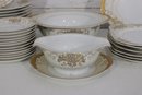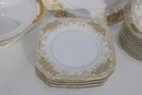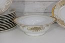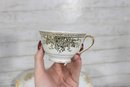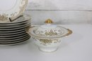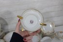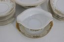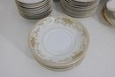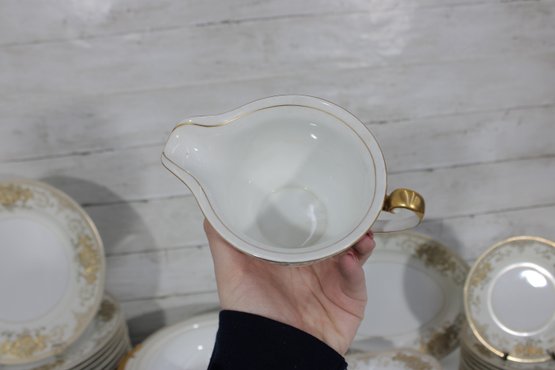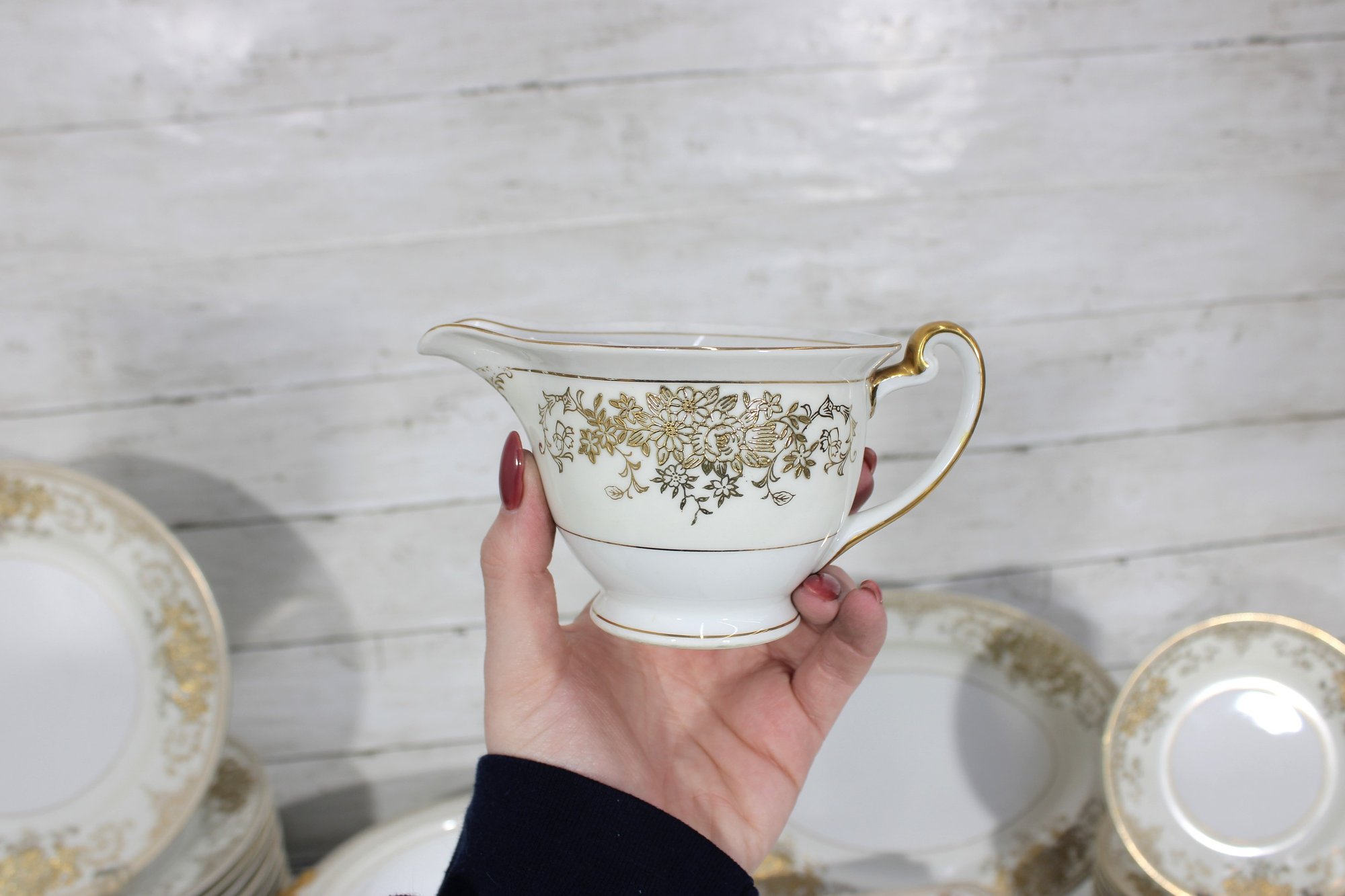 This refined pattern showcases delicate scrolling florals, decorative border work, and gold trim along rims and handles, giving the set a classic formal dining appeal.
