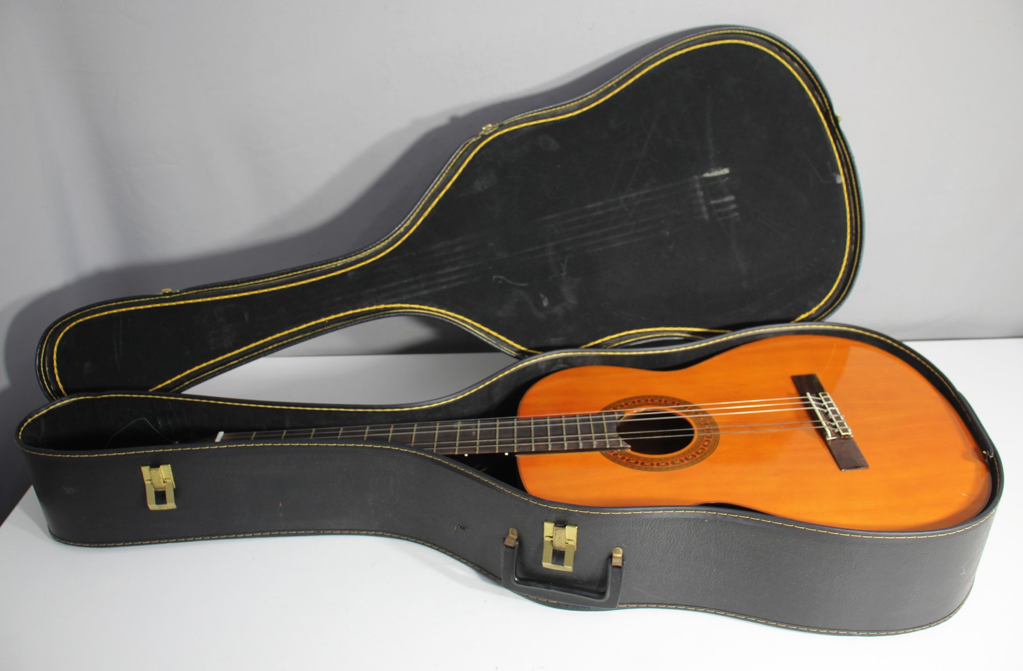 This vintage classical guitar, crafted in Korea, offers a warm and resonant tone ideal for beginners or collectors. The guitar is in good condition with minor signs of wear and includes its original black hard case with yellow trim. The headstock features a "Made in Korea" label, attesting to its origins. One string is currently missing, and the guitar may benefit from a fresh set of strings and tuning. Its classic design and smooth finish make it a visually appealing addition to any vintage instrument collection or a great starter guitar.