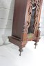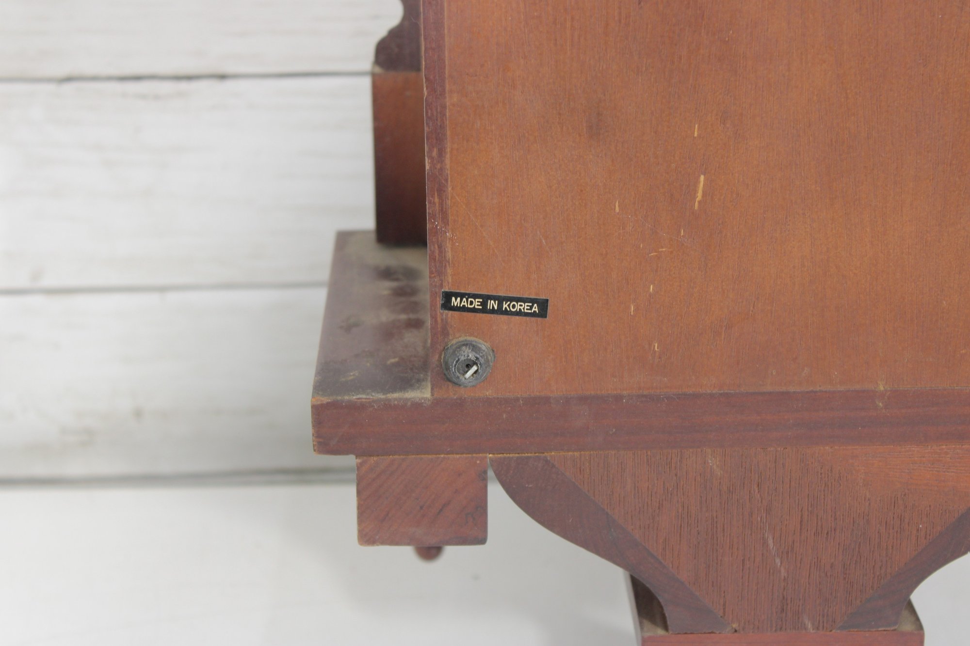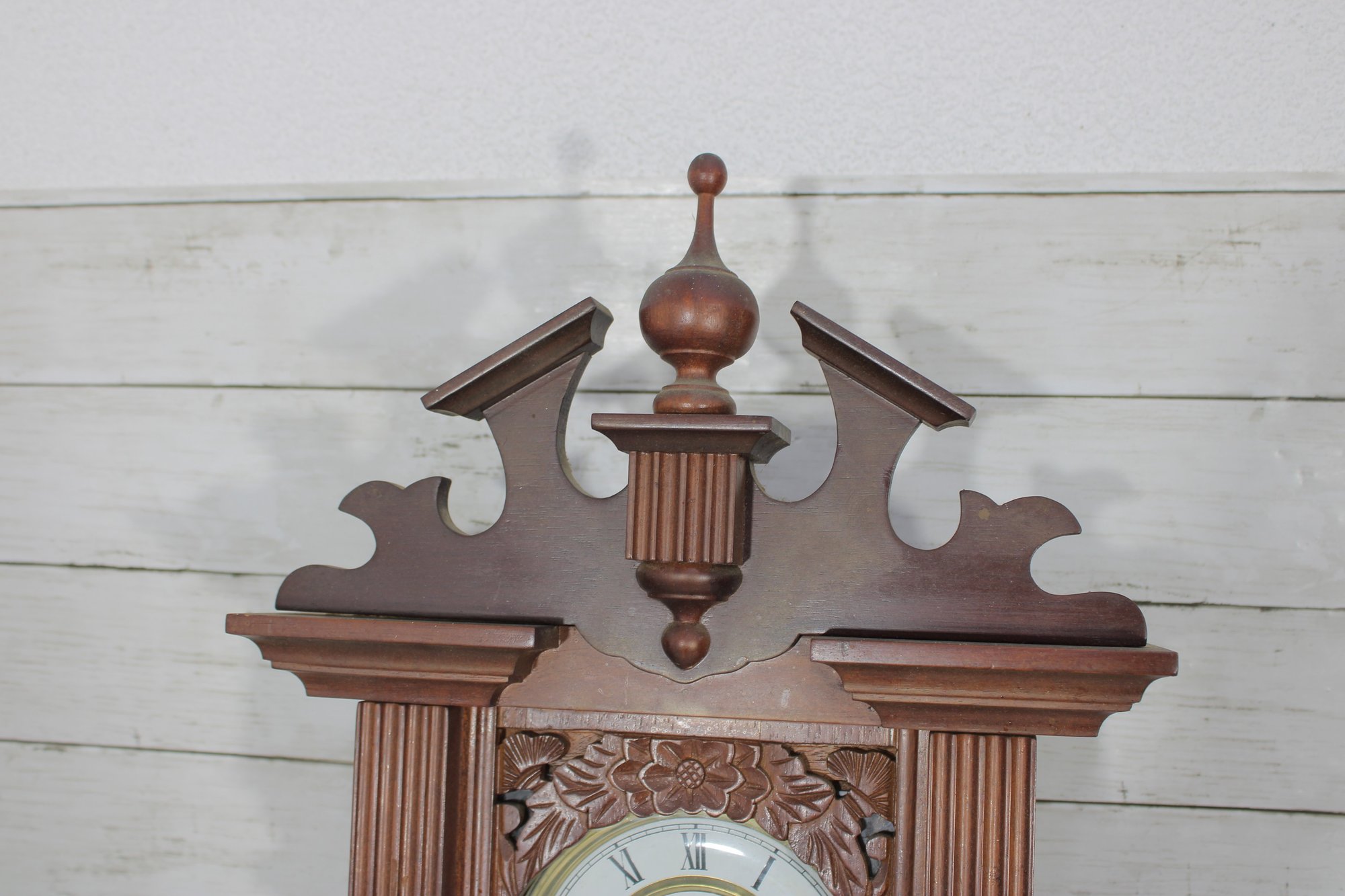 The rich wood tone and detailed floral carvings give this clock an elegant, heirloom look that works well in traditional, Victorian, or antique-inspired interiors.