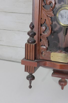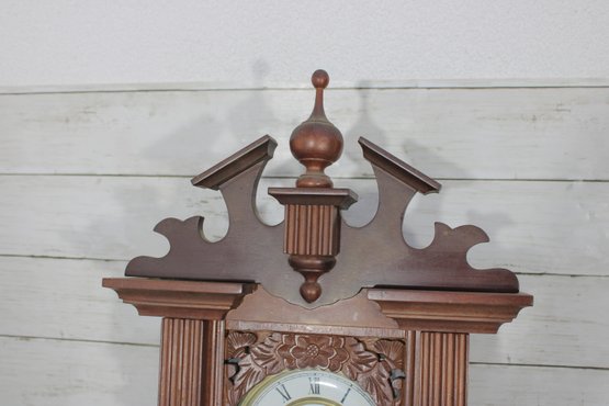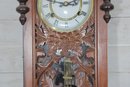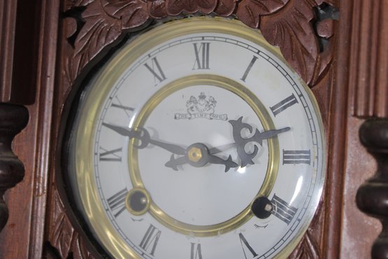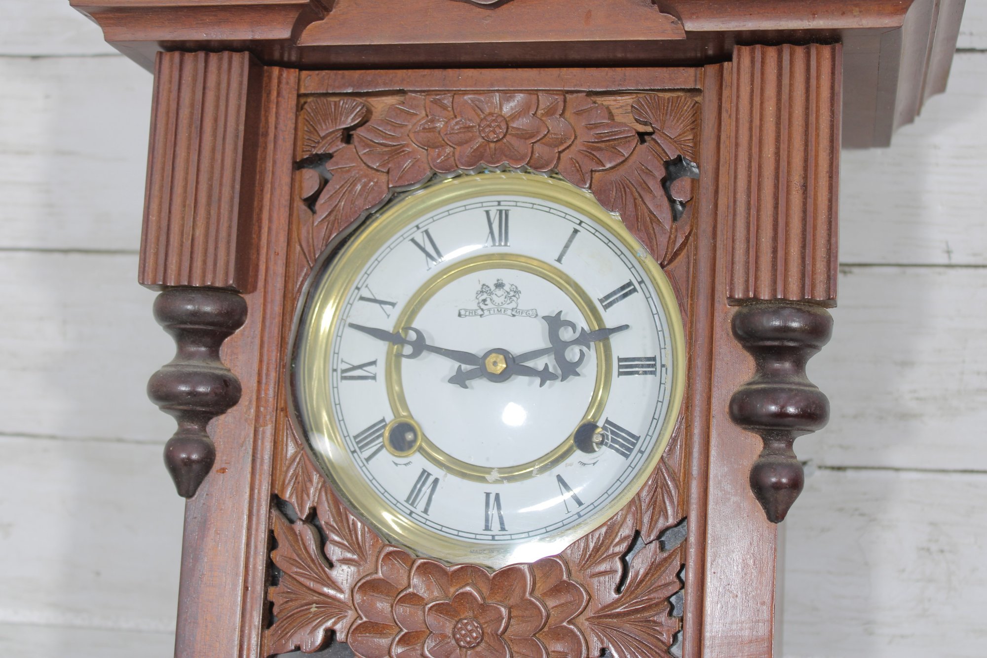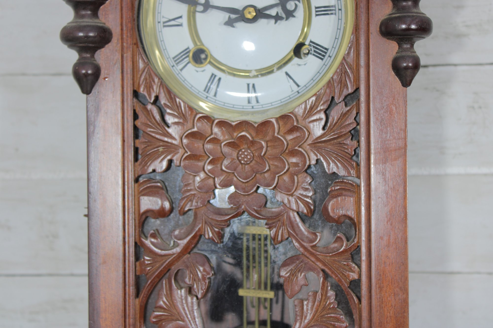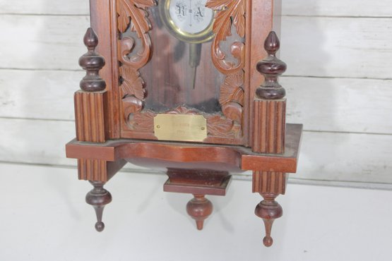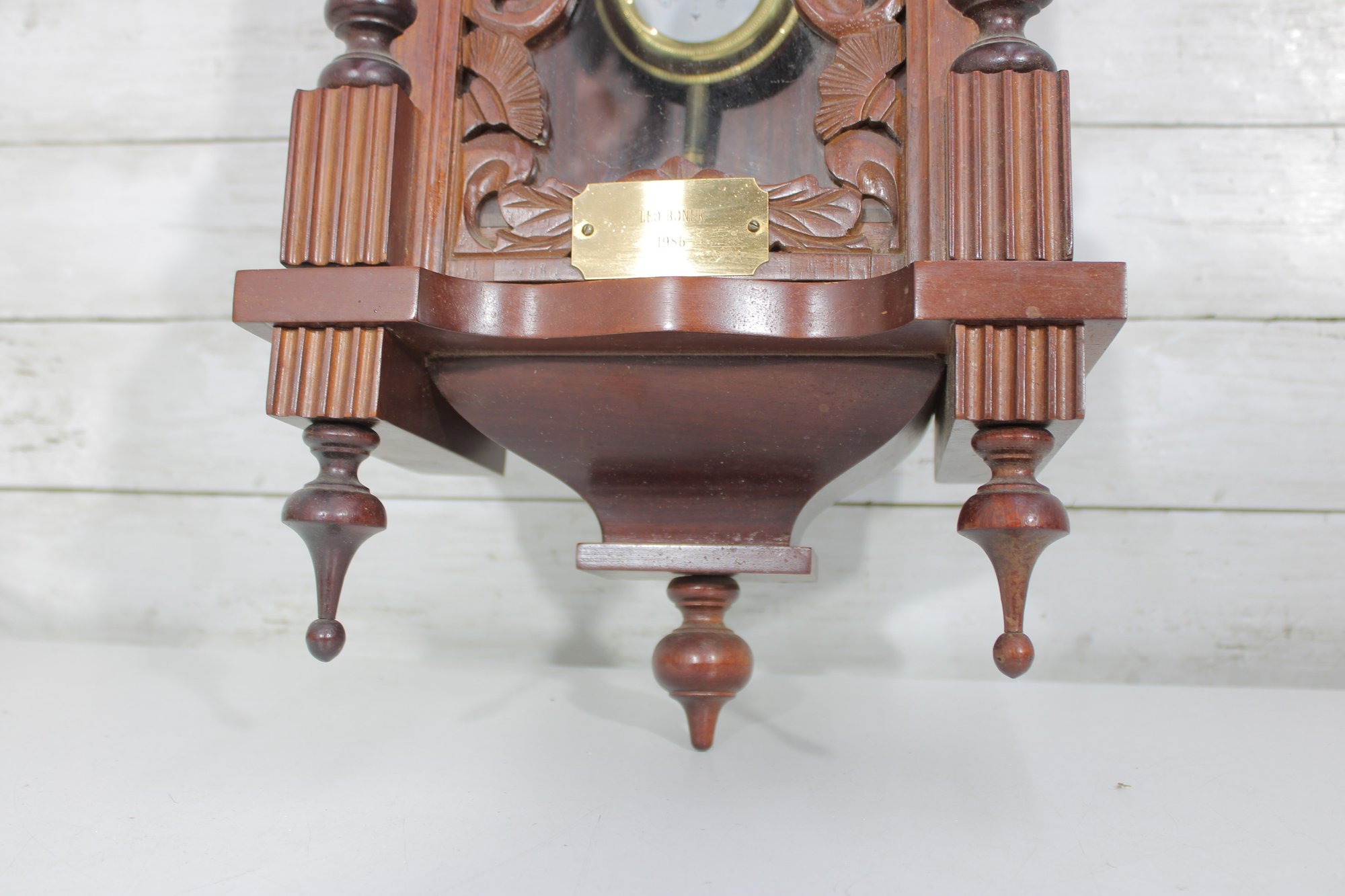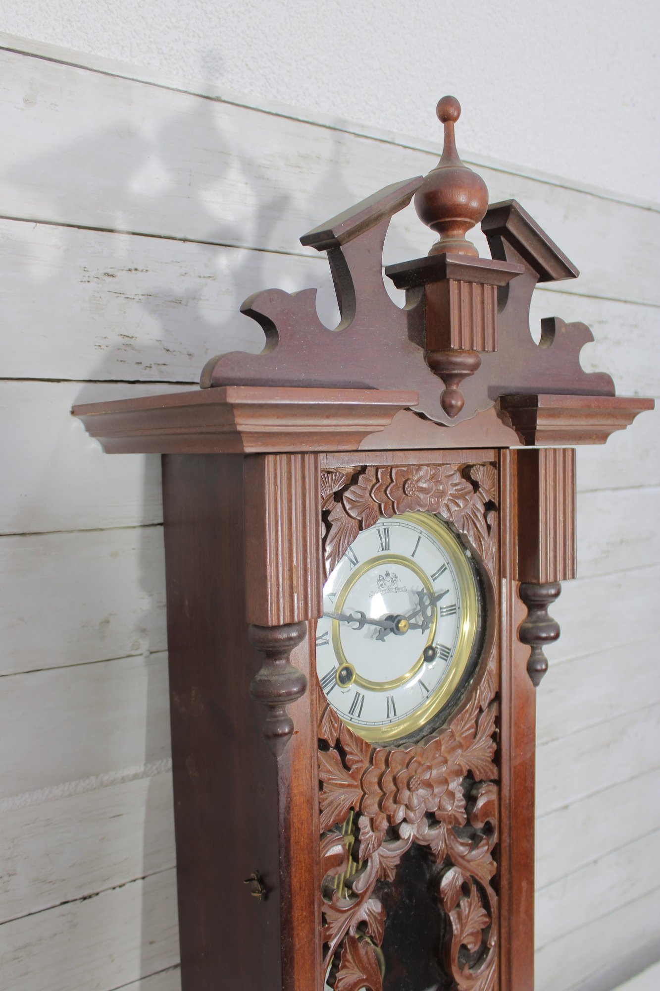 a vintage wall regulator-style clock featuring a beautifully carved wooden case and classic pendulum movement. With its traditional design and glass-front door, this piece brings old-world charm and timeless style to any home, office, or study.