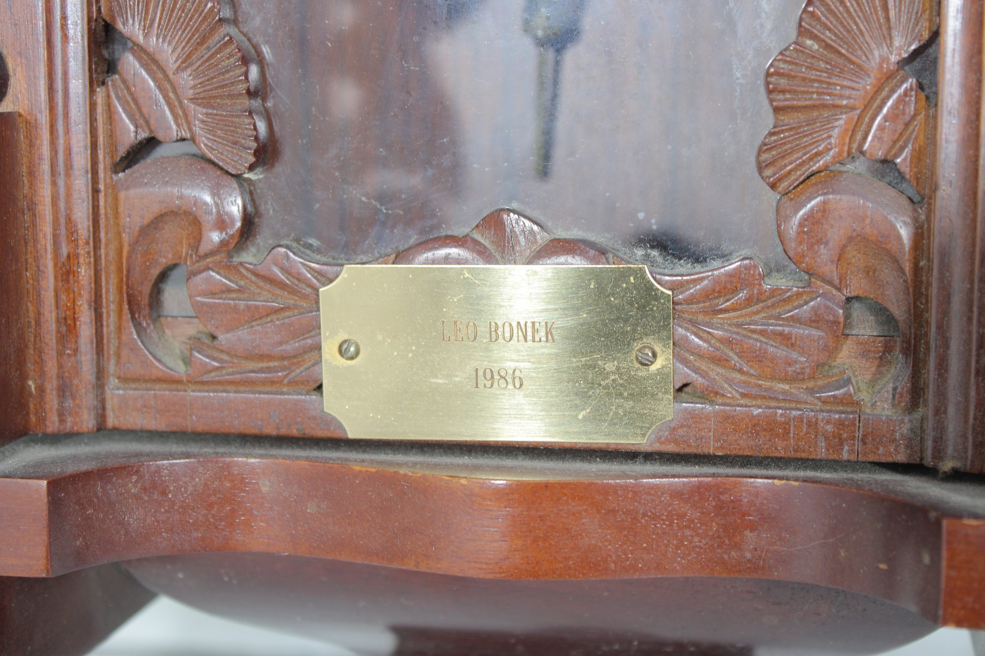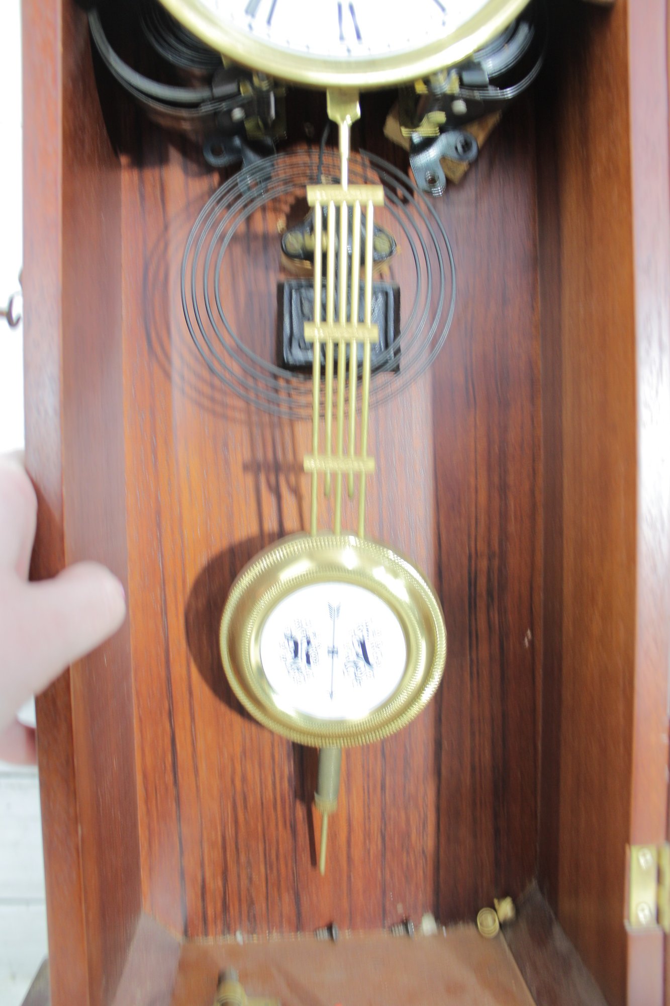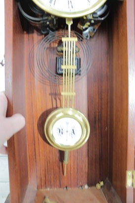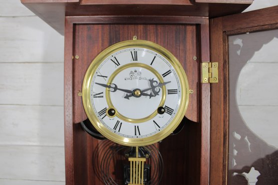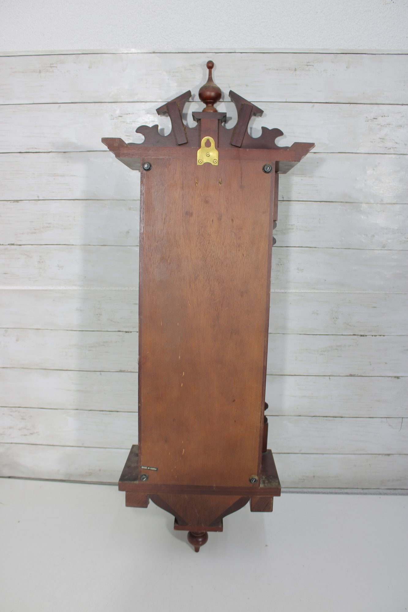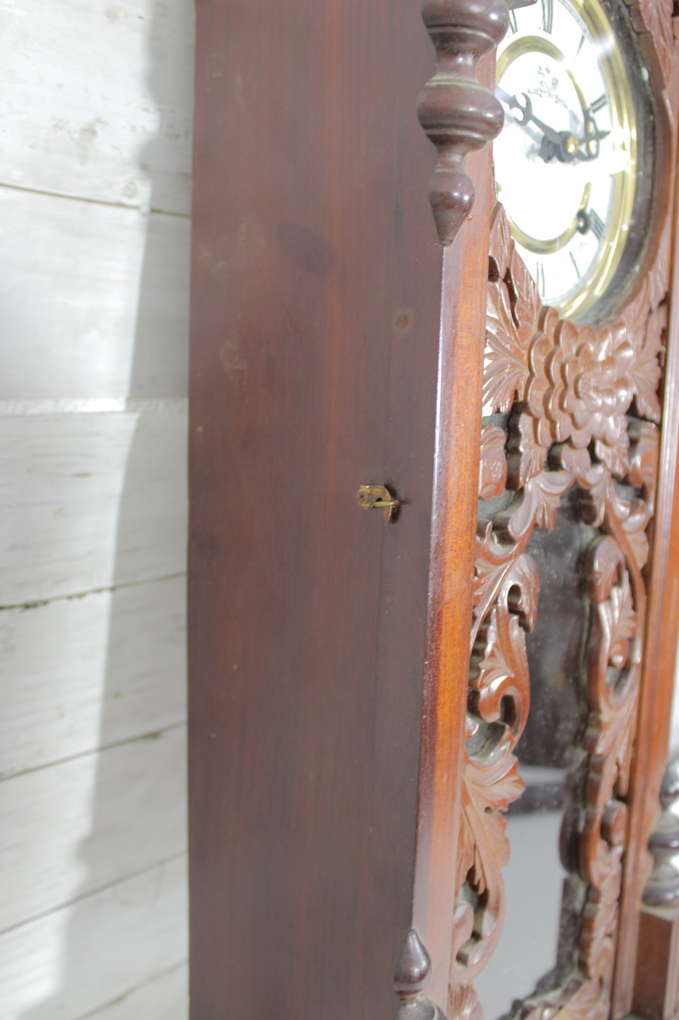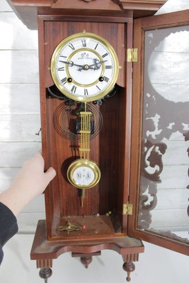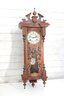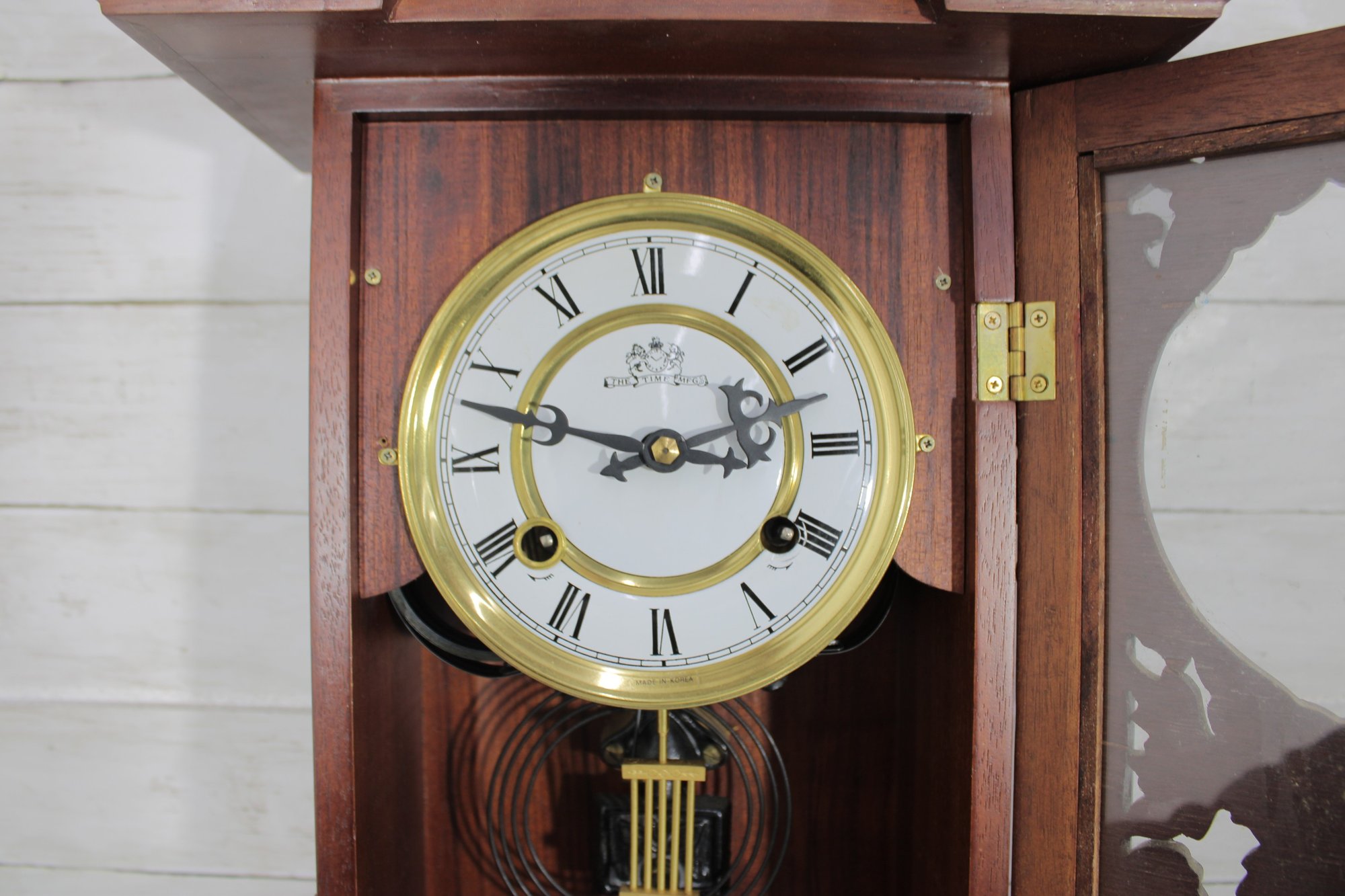 a vintage wall regulator-style clock featuring a beautifully carved wooden case and classic pendulum movement. With its traditional design and glass-front door, this piece brings old-world charm and timeless style to any home, office, or study.