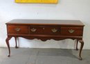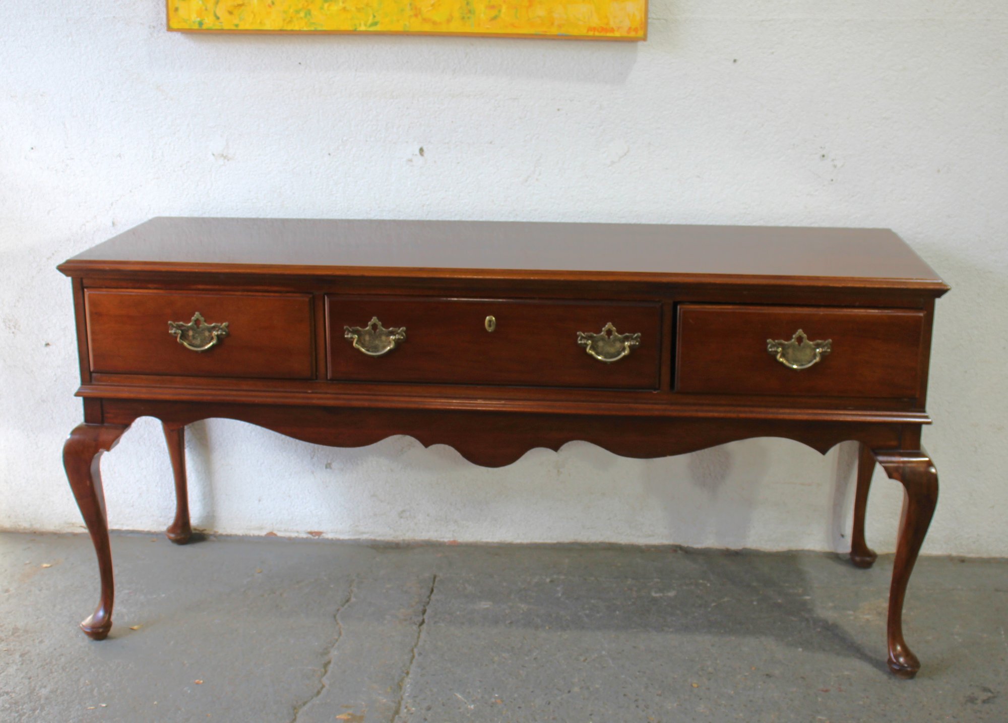 Beautiful vintage mahogany console table from the esteemed "Crown Colony" Collection by Kroehler. This sideboard showcases classic Queen Anne styling with elegantly curved cabriole legs and a scalloped apron, exuding a timeless charm that complements any traditional interior. The table features three spacious drawers with original brass pulls, providing both style and storage functionality.