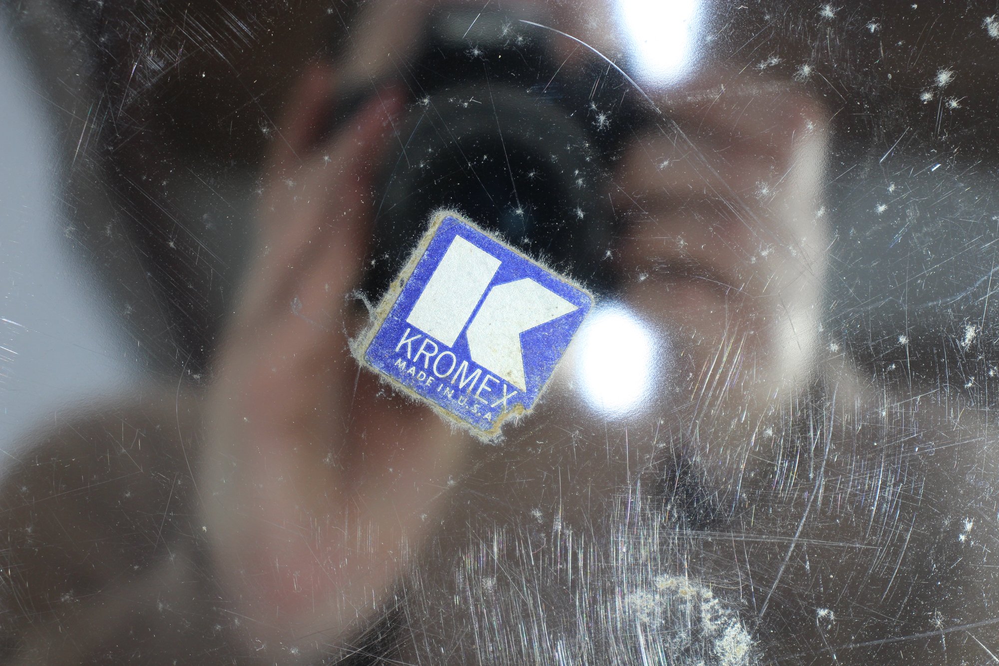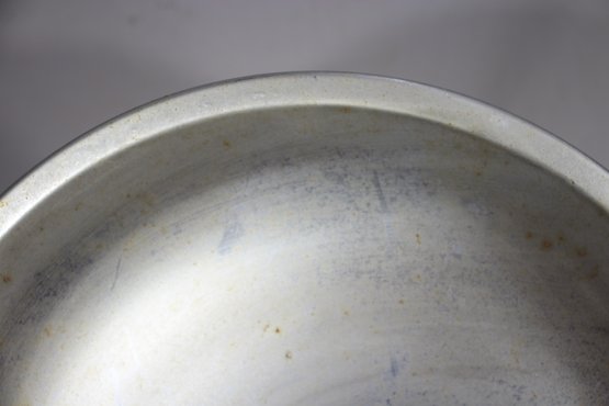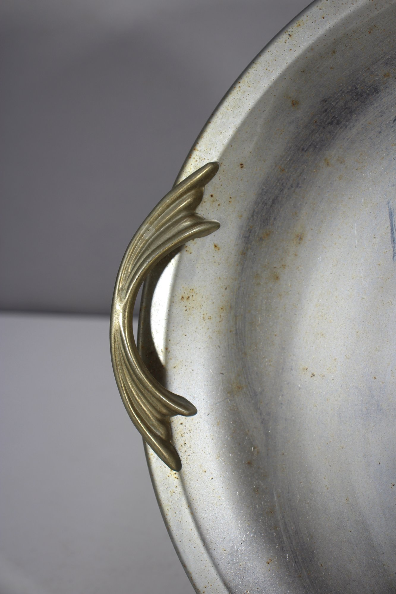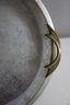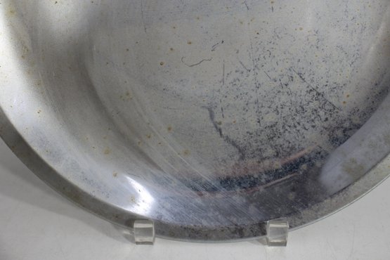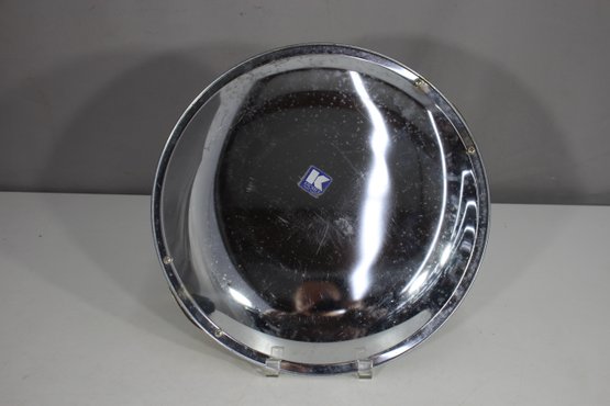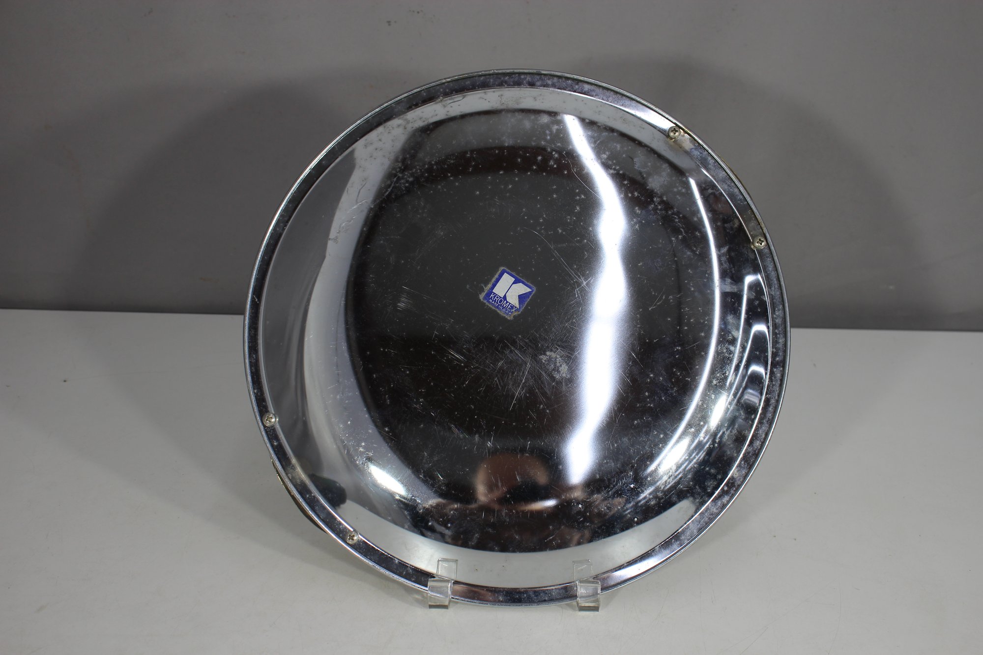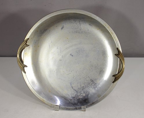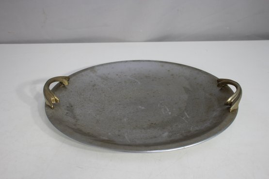 This 13-inch round vintage Kromex aluminum serving tray features a sleek silver-toned surface with sculpted brass handles, offering a stylish mid-century modern appeal. The tray shows age-related wear and patina, adding to its retro charm. Stamped with the Kromex brand on the back, this piece is both decorative and functional, perfect for serving drinks, appetizers, or as a unique display tray. A timeless classic for vintage kitchenware collectors or mid-century decor enthusiasts.